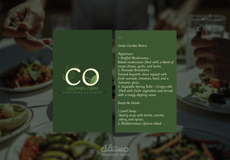 مشروع تصميم شعار وهويه بصريه لمطعم مأكولات نباتيه: صممت شعاراً مبتكراً للمطعم حيث ركزت على دمج الألوان المشرقة والرموز البسيطة لتعكس الطبيعة الديناميكية للعلامة التجارية. أُعجب العميل بالنتائج النهائية التي ساهمت في تعزيز تميز العلامة في السوق.