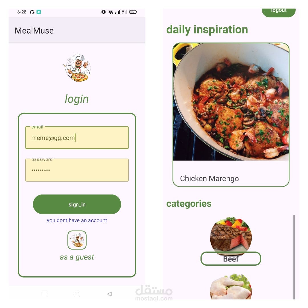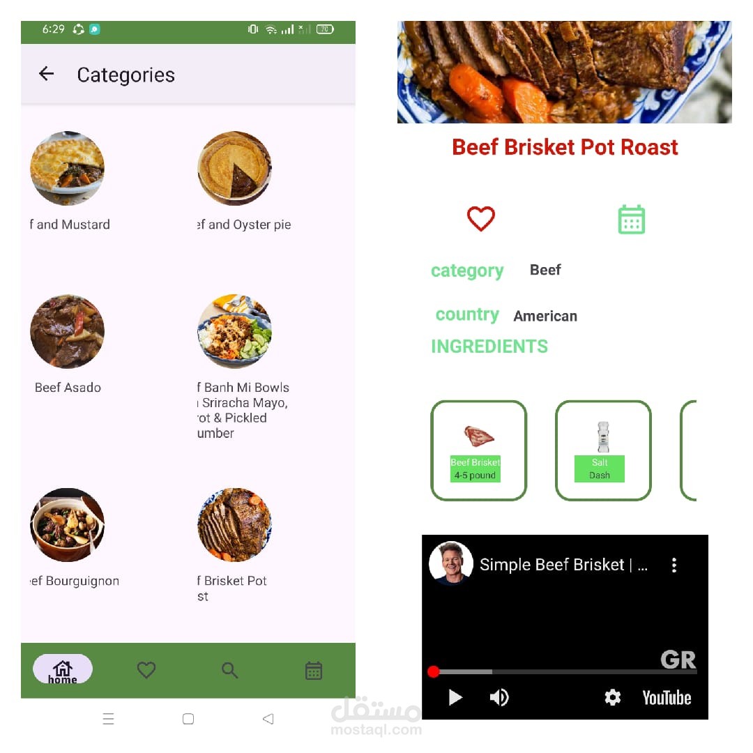 تطبيق أندرويد يجلب وجبات الطعام من API، مع العديد من الميزات التفاعلية للمستخدم: