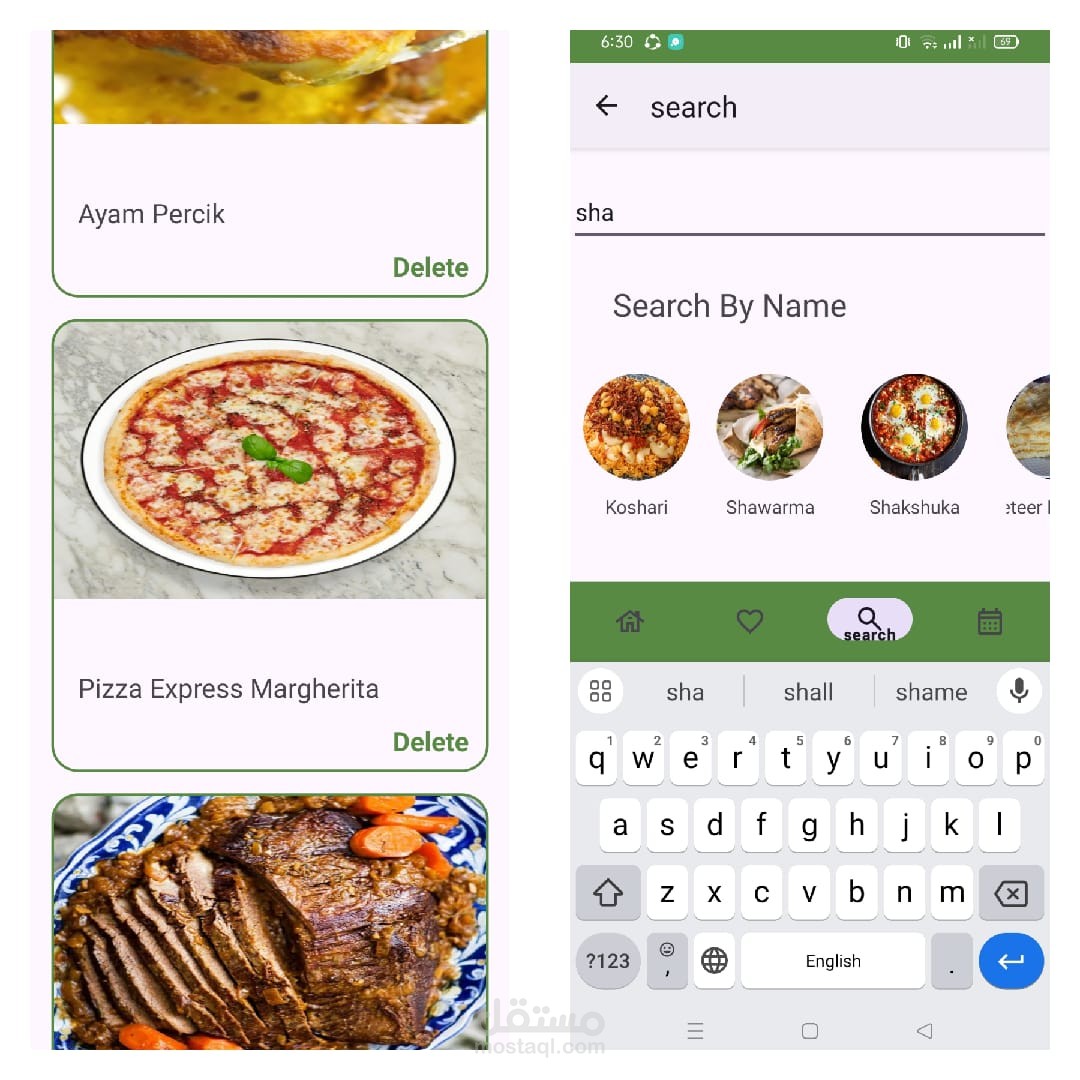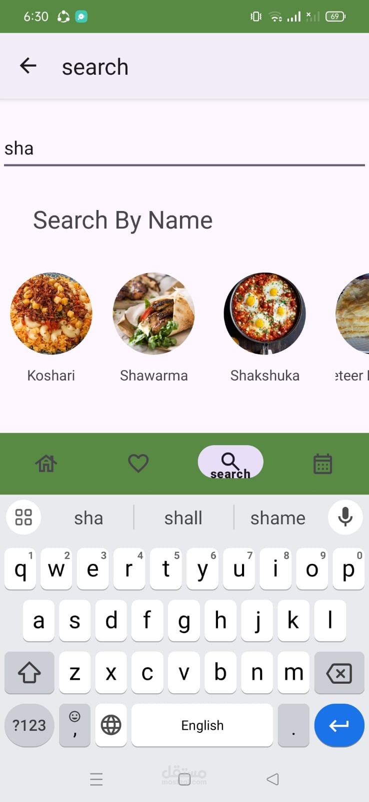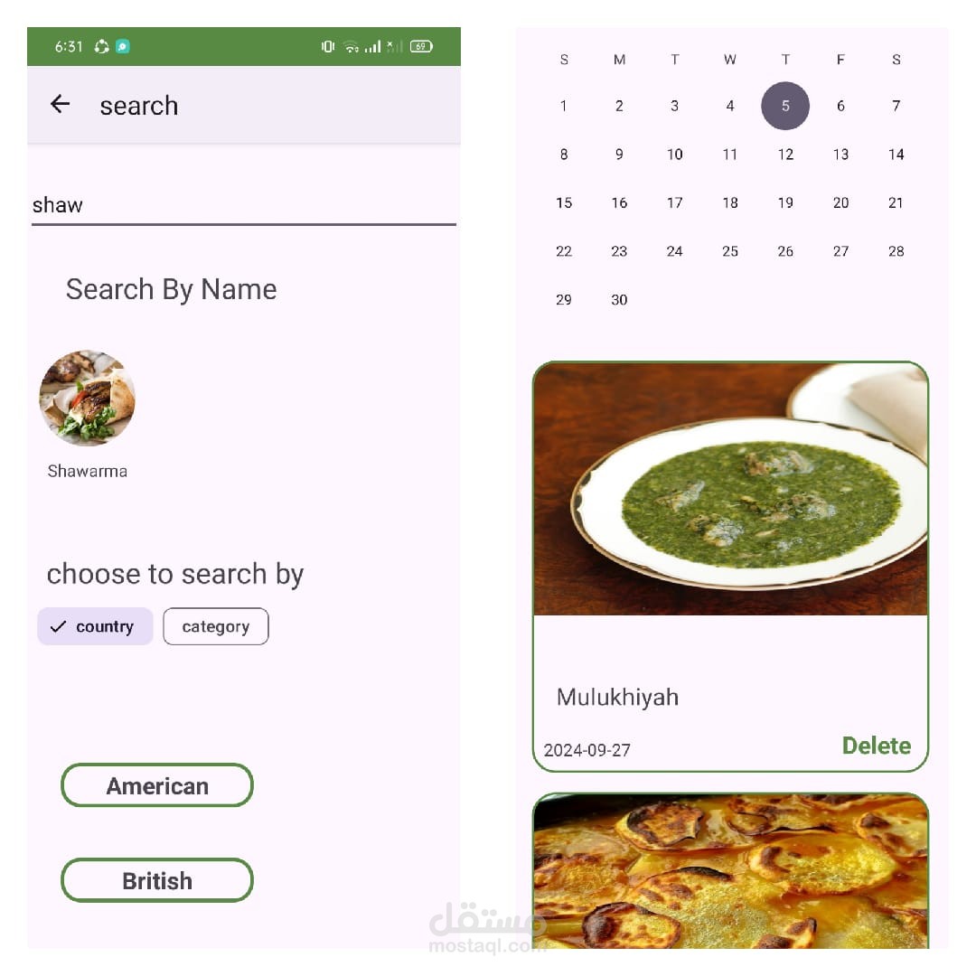 يمكن للمستخدم البحث عن الوجبات إما بناءً على تصنيف محدد (مثل الفطور، الغداء، الحلويات)، أو البحث حسب البلد (مثل الأطعمة الإيطالية أو الهندية).