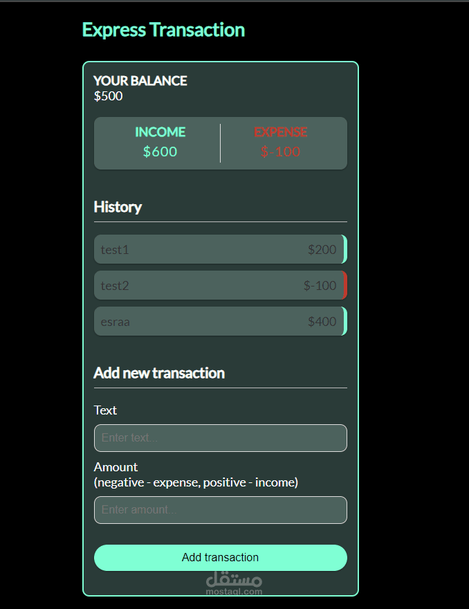 مشروع Express Transaction هو أداة لإدارة الأمور المالية الشخصية بطريقة بسيطة وفعّالة. يهدف المشروع إلى تسهيل متابعة النفقات اليومية والدخل، مما يساعدك في التحكم في ميزانيتك بسهولة. يتميز التطبيق بسهولة الاستخدام، مما يجعله مناسبًا لأي شخص يحتاج إلى طريقة سريعة ومريحة لإدارة أمواله.