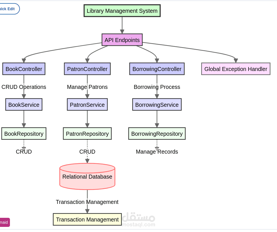 Developed a Library Management System REST API using Spring Boot and Java. The API manages books, patrons, and borrowing records with secure and efficient operations. It includes endpoints for adding, updating, retrieving, and deleting records, along with handling borrowing processes. The service layer ensures business logic is applied, and the repository layer manages database interactions. Optimized for scalability and maintainability with features like transaction management and global exception handling.