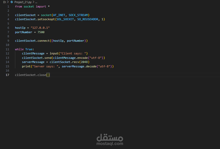 يقوم بربط (bind) الـ Socket بعنوان IP المحلي 127.0.0.1 والمنفذ 7500.