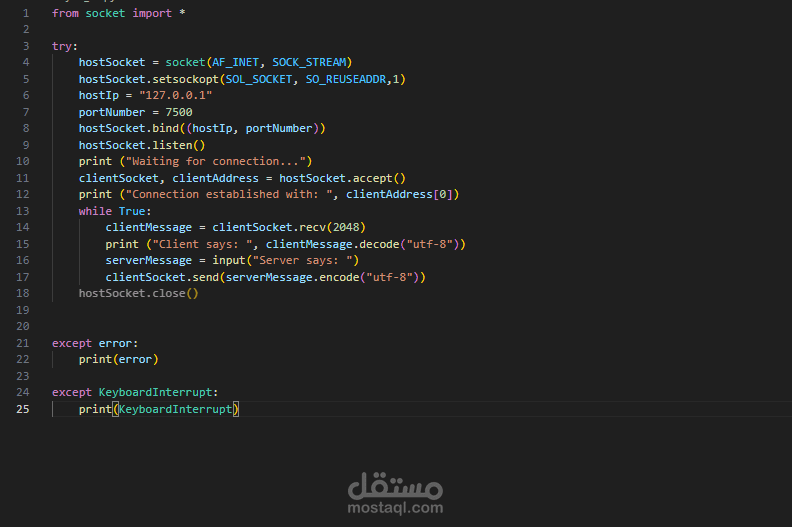 أولاً، قم بتشغيل الخادم من خلال تشغيل الكود الخاص به. سيظهر لك رسالة "Waiting for connection..." تشير إلى أن الخادم ينتظر اتصالاً.