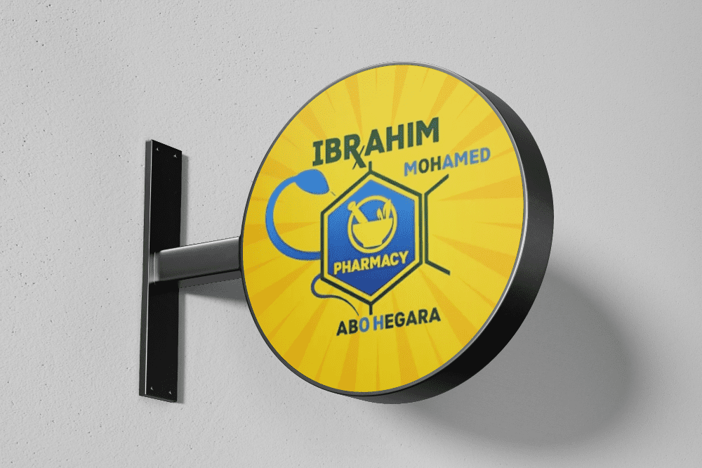 النصوص: كتابة اسم الصيدلية "IBRAHIM PHARMACY" بشكل بارز وواضح مع دمج "MOHAMED" و"ABO HEGARA" بأسلوب متوازن.