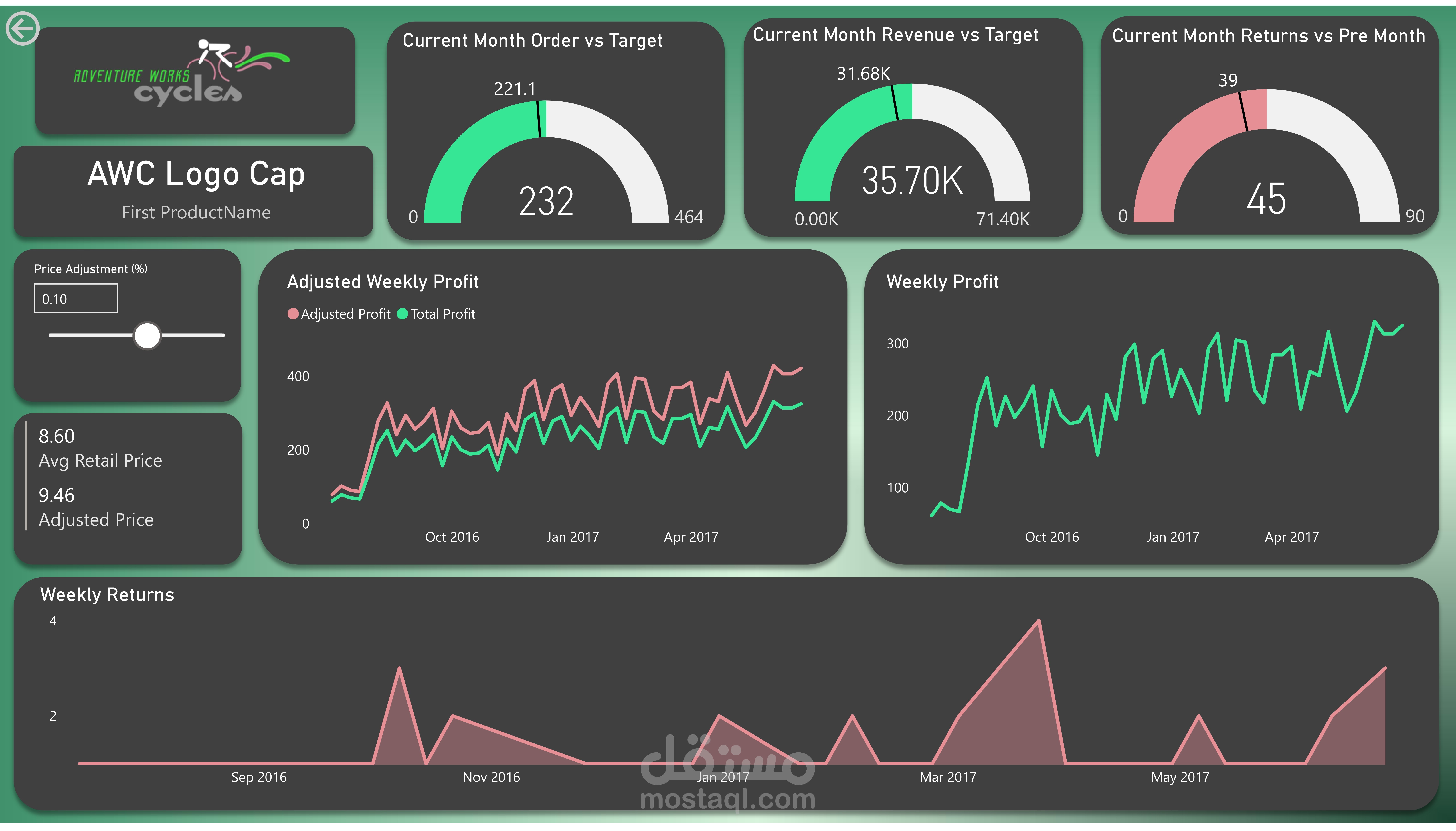 كخبير في Power BI، أخصص في تطوير لوحات معلومات ديناميكية وجذابة بصريًا لتتبع مؤشرات الأداء الرئيسية للأعمال. قمت مؤخرًا بإكمال لوحة معلومات لتحليل المبيعات والمنتجات لشركة Adventure Works Cycles، والتي توفر رؤى قابلة للتنفيذ حول أداء المنتجات واتجاهات المبيعات. تتضمن هذه اللوحة الميزات الرئيسية التالية: