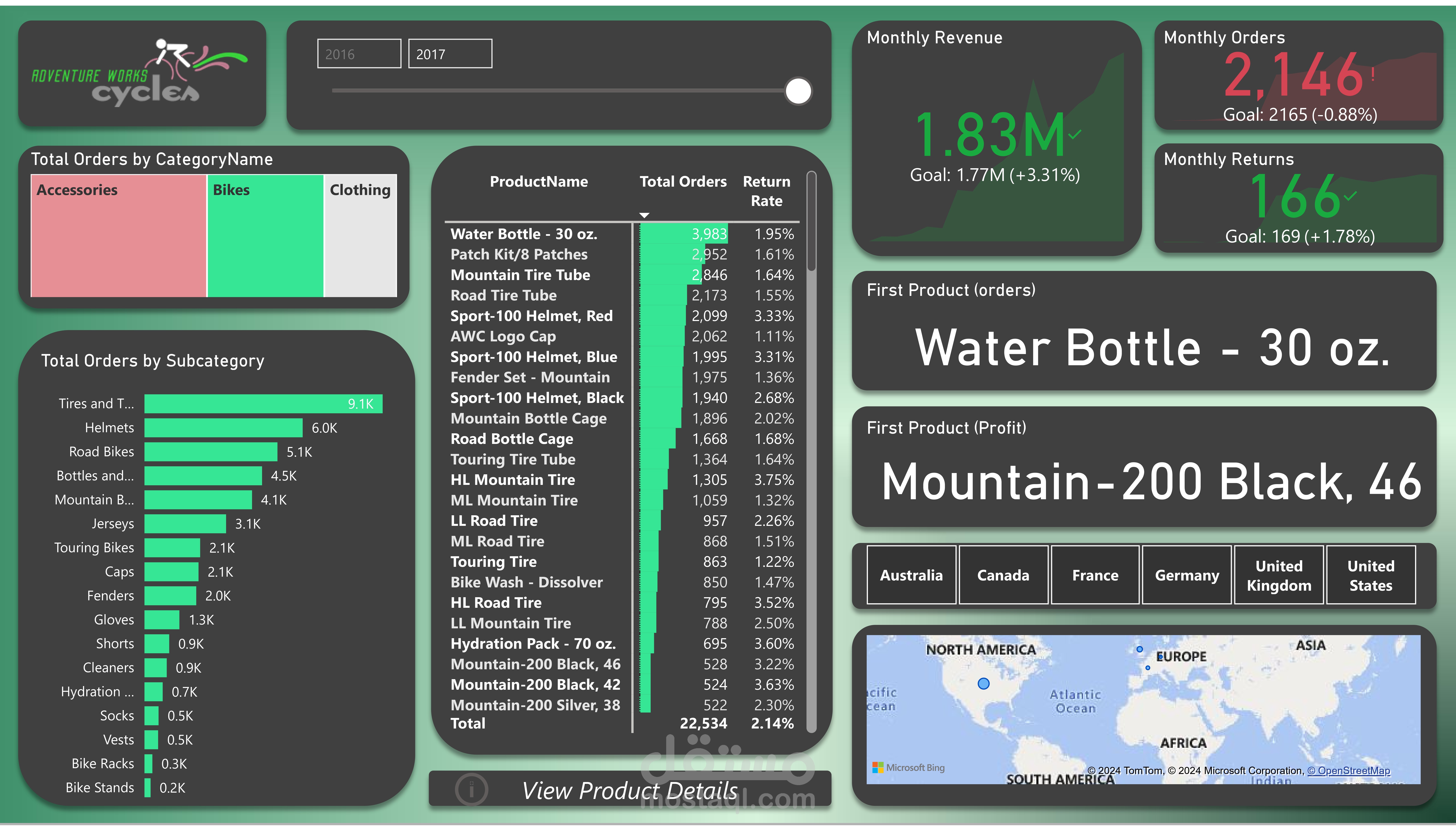 أفضل المنتجات حسب الأرباح: تسلط الضوء على أكثر المنتجات ربحية (مثل: Mountain-200 Black, 46)، مما يعطي رؤية واضحة حول المنتجات التي تحقق أعلى الهوامش الربحية.