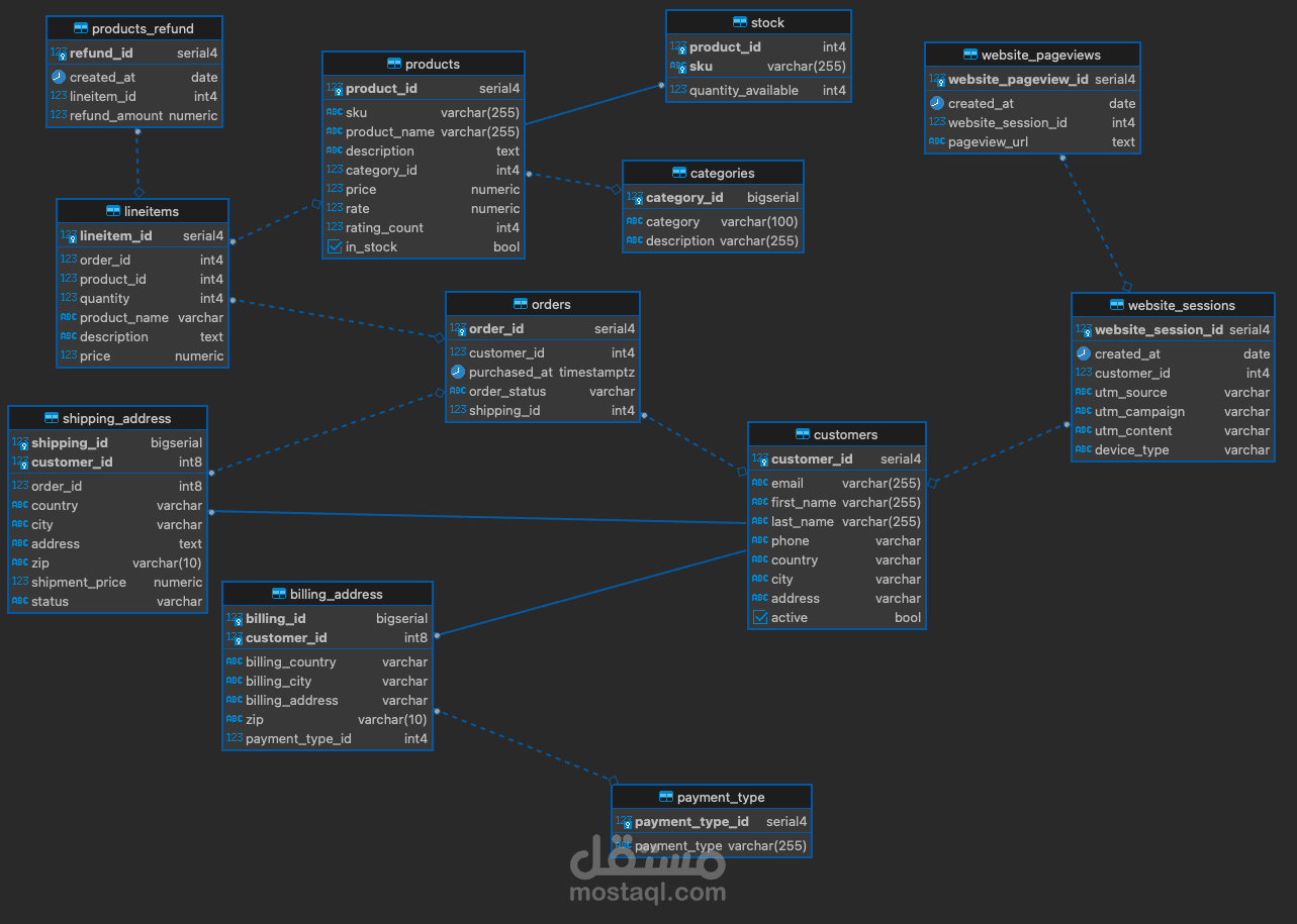 تم تصميم قاعدة بيانات Postgres هذه لمتجر التجارة الإلكترونية. تتضمن قاعدة البيانات جداول مترابطة لتخزين معلومات المنتج، الطلبات، العملاء، المدفوعات، والمزيد. وقد تم استخدام مفاهيم التطبيع لتجنب التكرار وتسهيل تحديث البيانات. تم إنشاء علاقات مفتاح أجنبي بين الجداول لربطها معًا بشكل منطقي. كما تم إنشاء مؤشرات لتحسين أداء الاستعلامات.