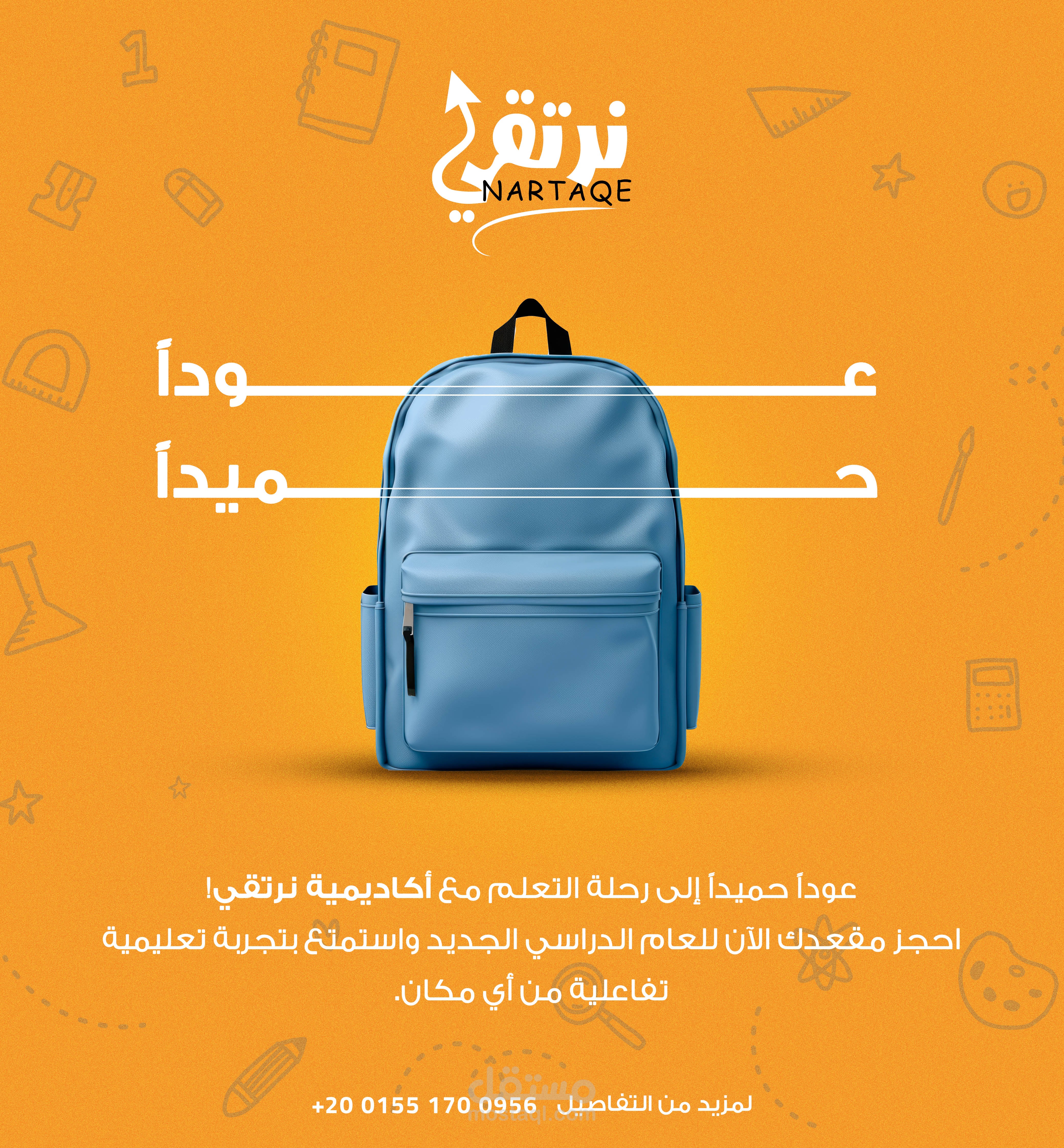 تصميم بوست لأكاديمية نرتقي نعلن فيه عن فتح باب الحجز للعام الدراسي الجديد.