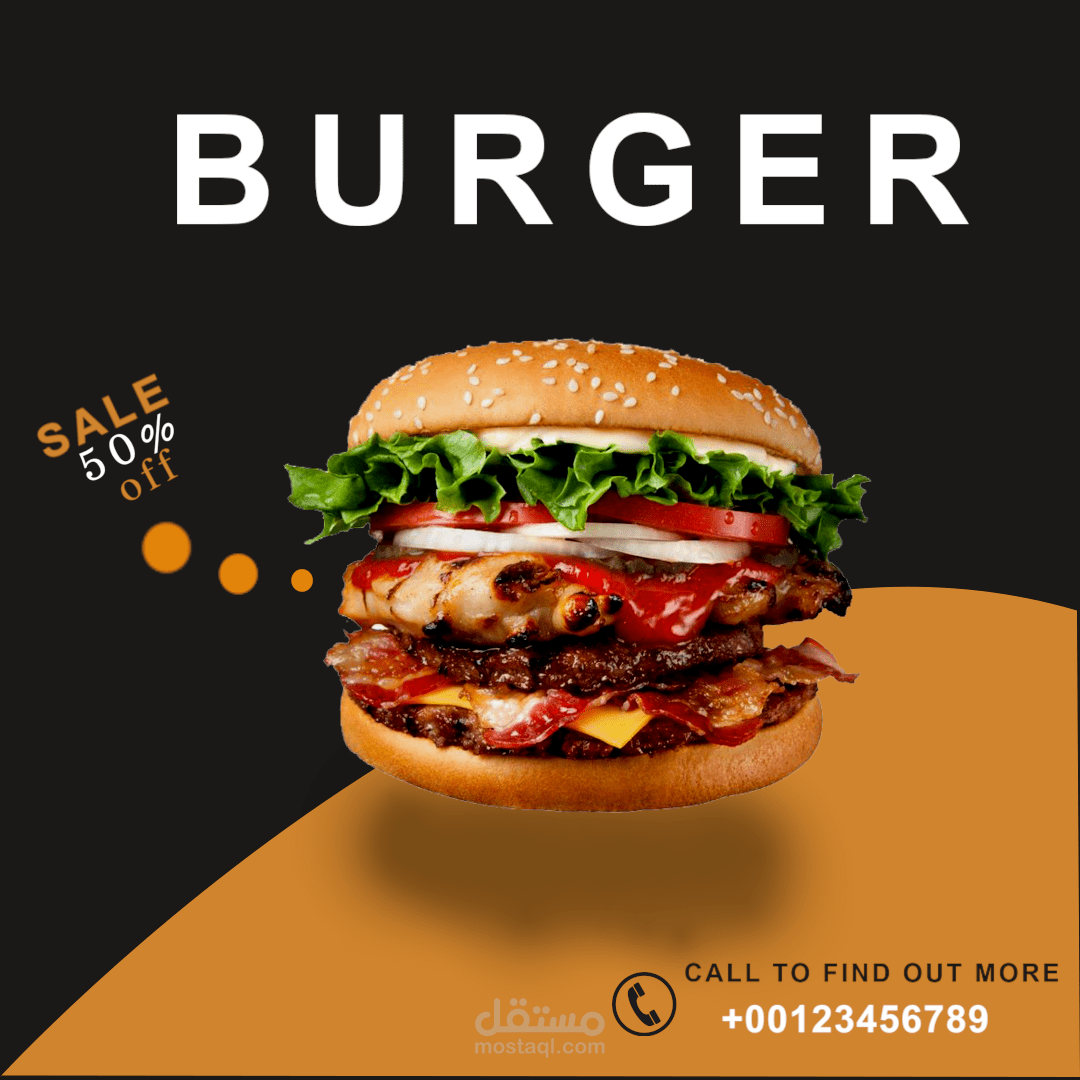 3. **نسبة الخصم (50% off)**: على يسار التصميم مكتوبة باللون البرتقالي بجانب البرجر، توضح وجود خصم بنسبة 50% لجذب العملاء إلى العرض.