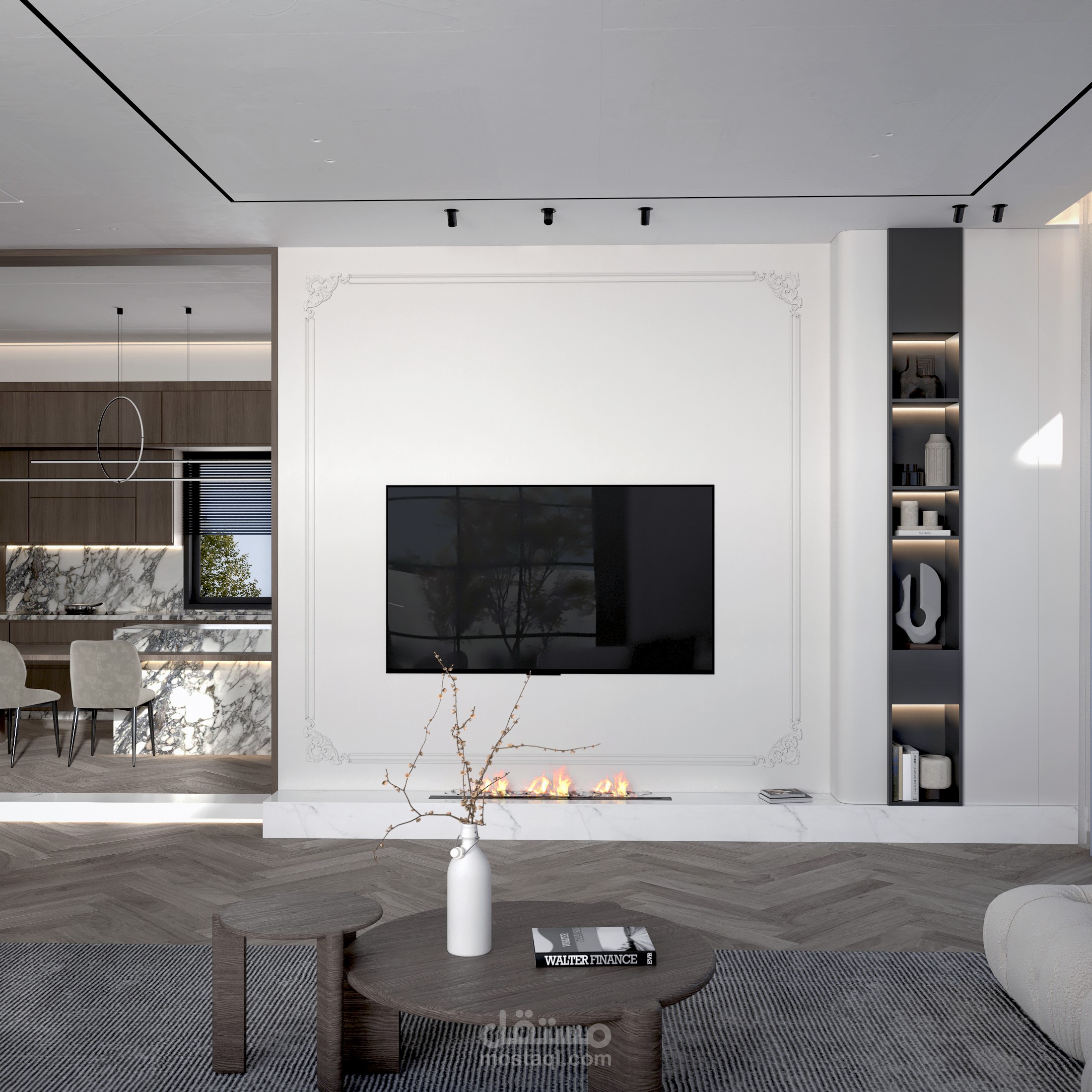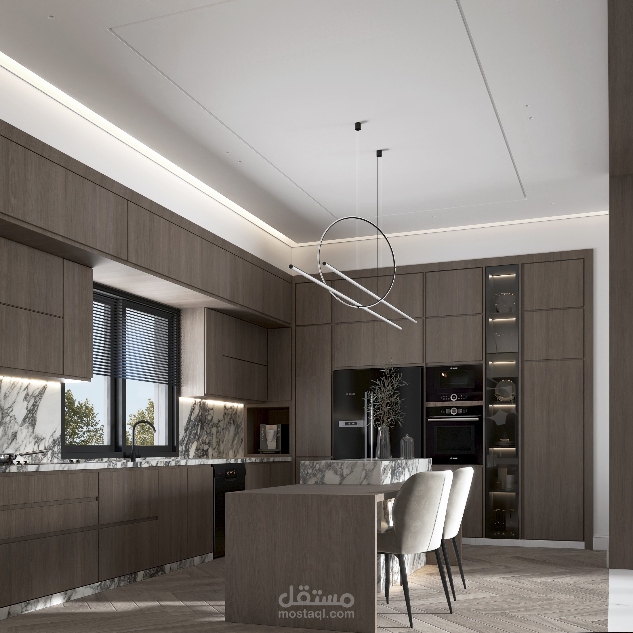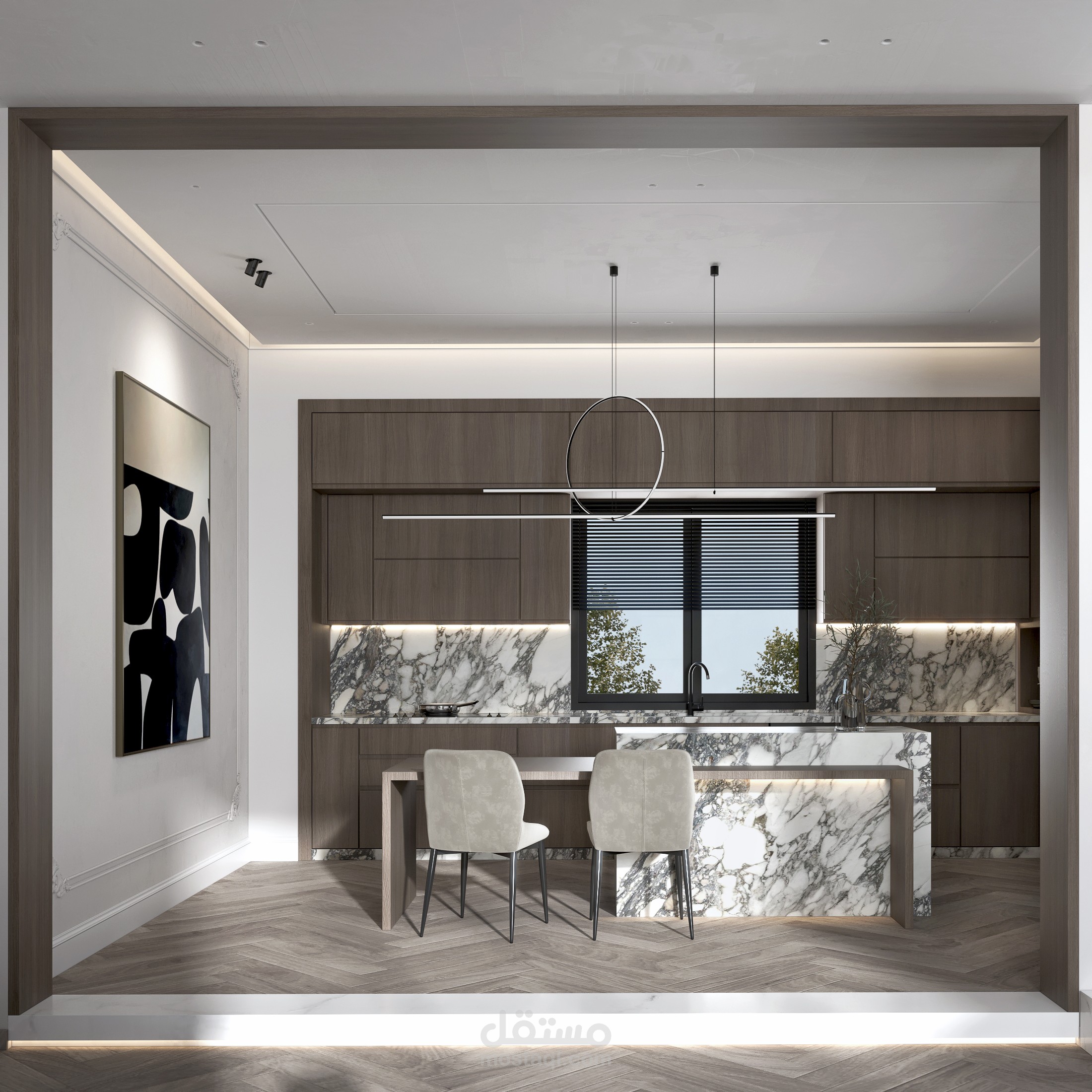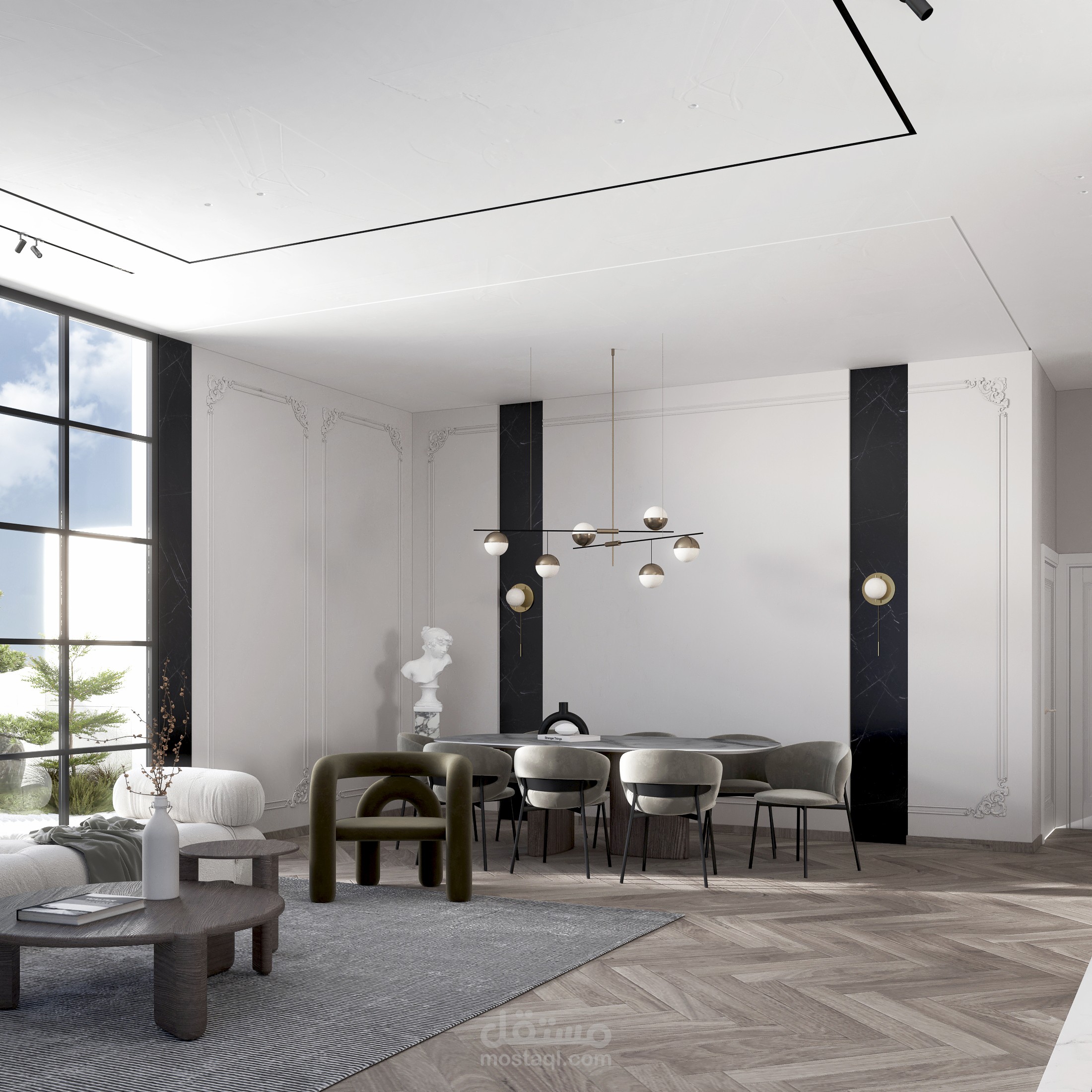 تصميم نيوكلاسيك لمطبخ ومنطقة جلوس وسفرة