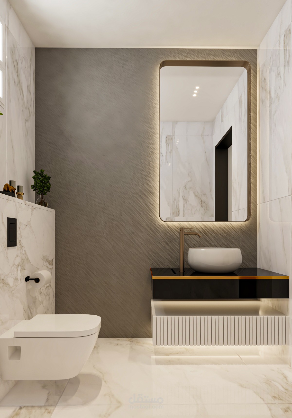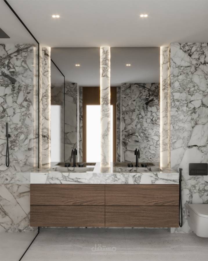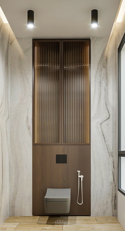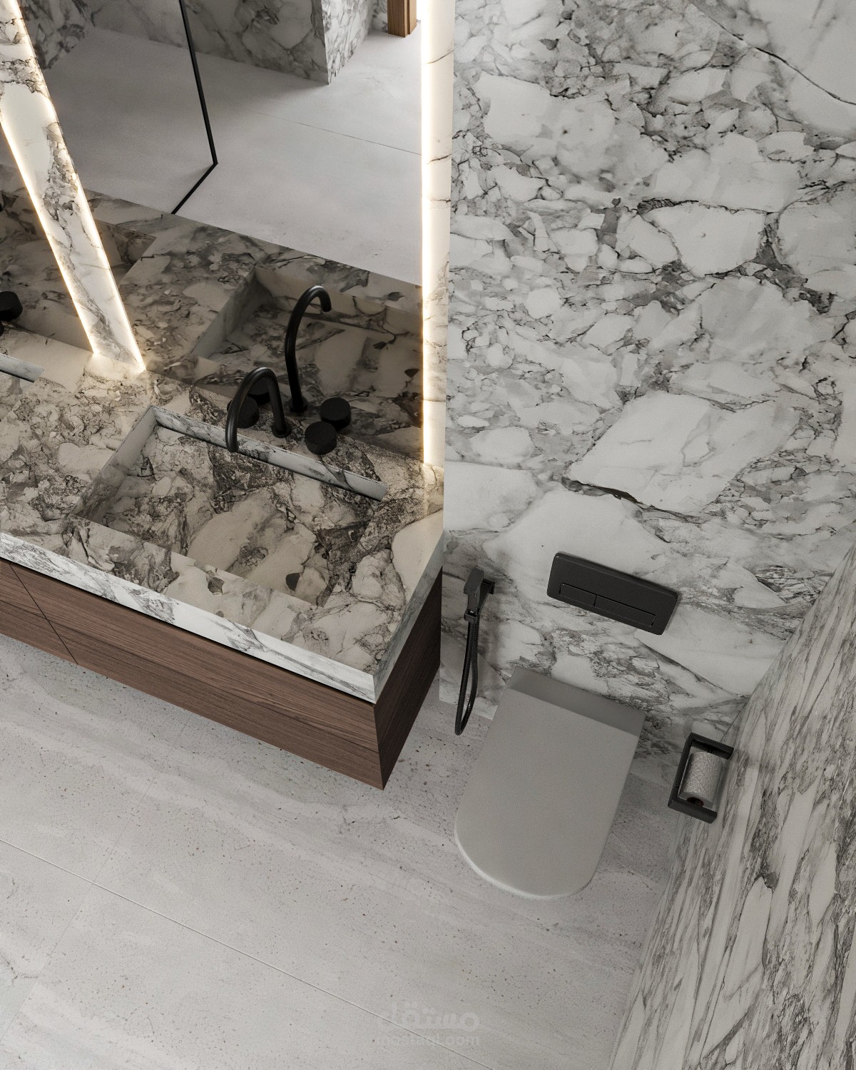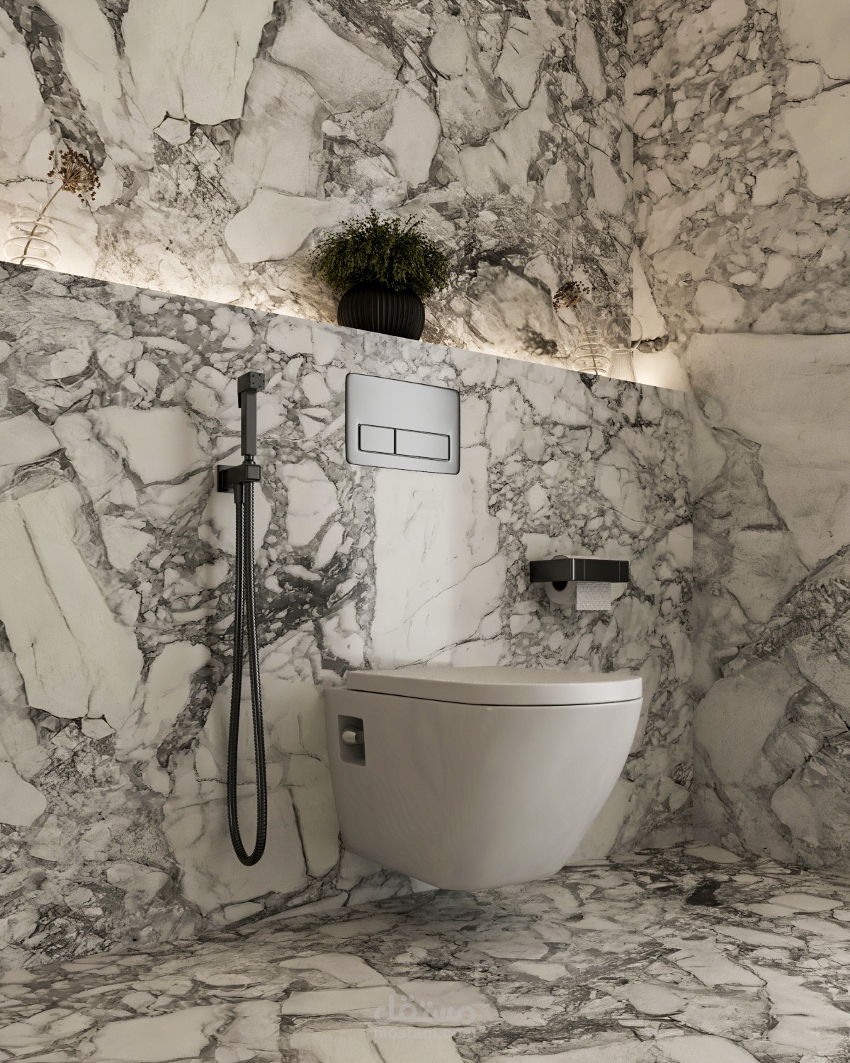والعمل على الادوات الصحية بمختلف انواعها، ب تواليت معلق او مخفي او عادي، مع انارات مخفية وتجوايف وارفف جدارية لاستغلالها في التخزين.