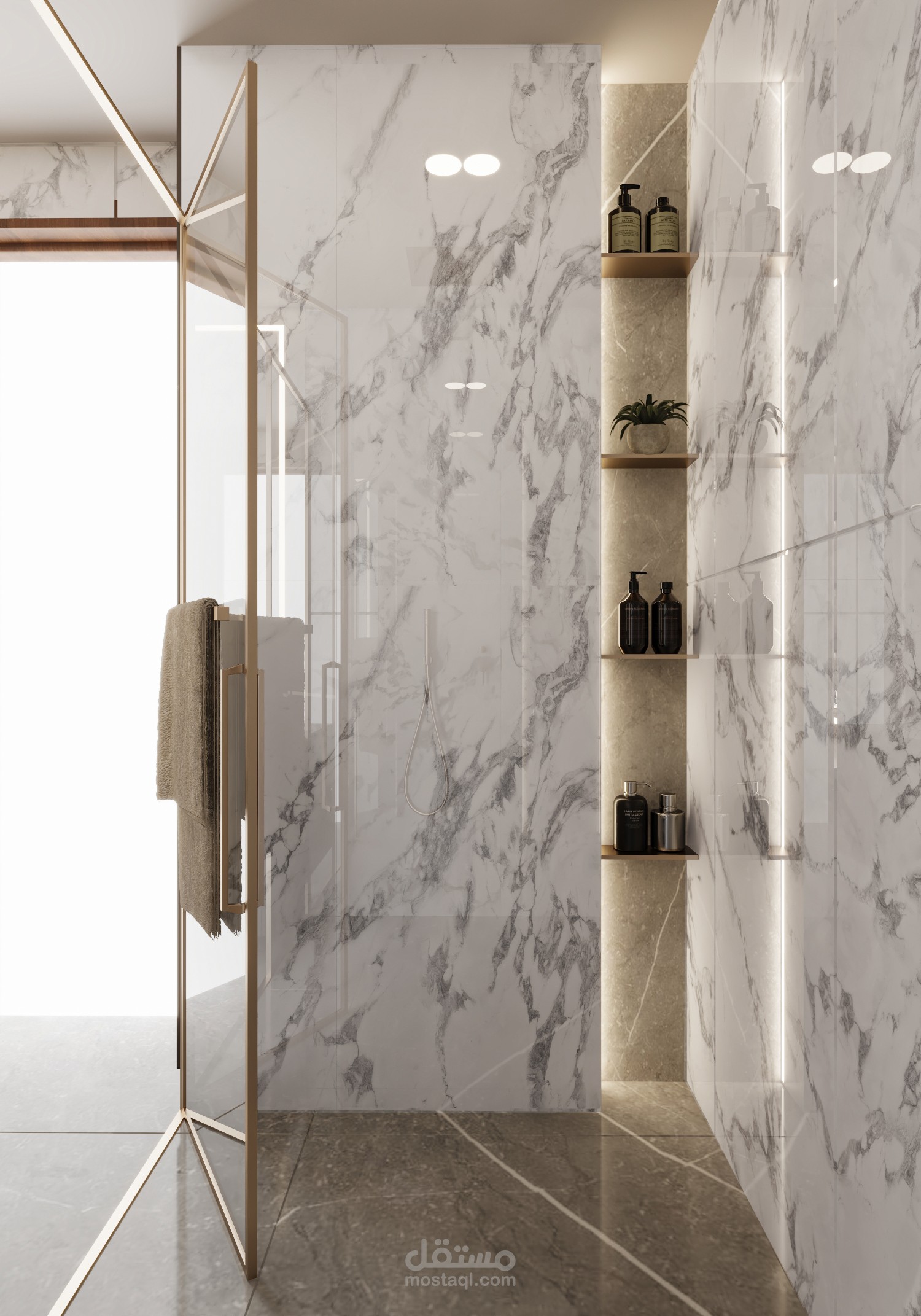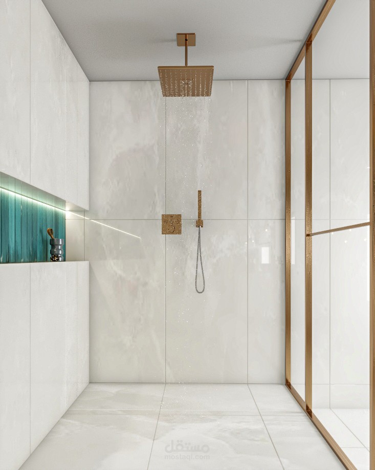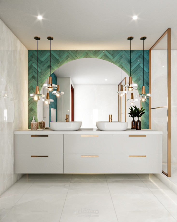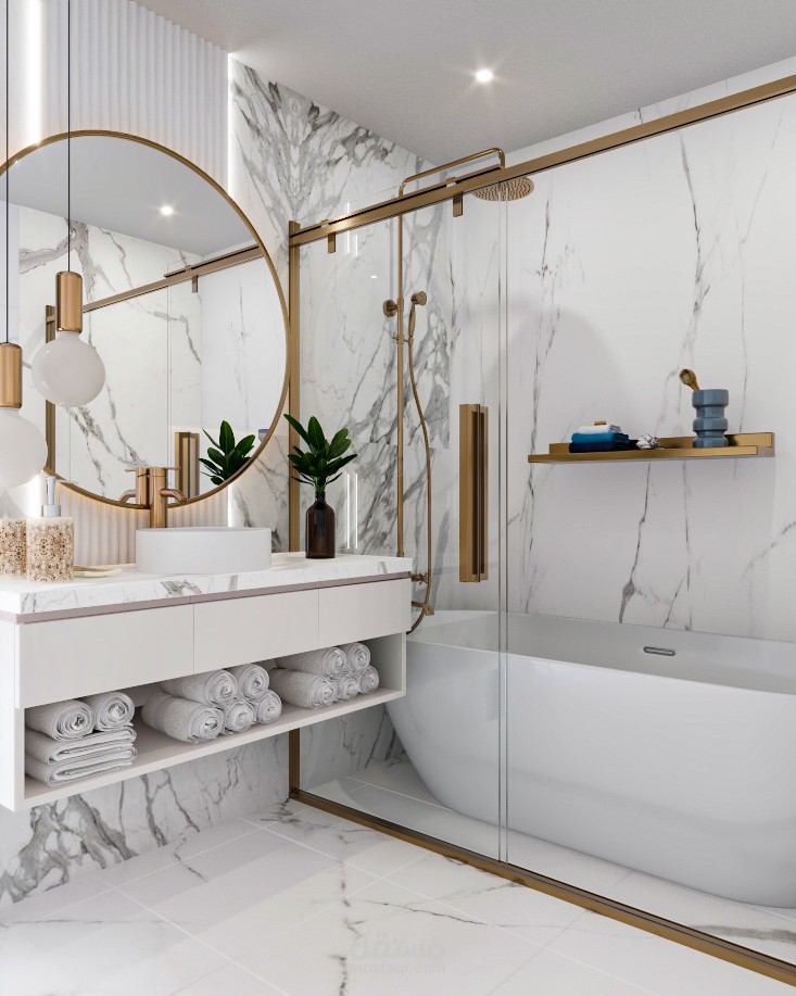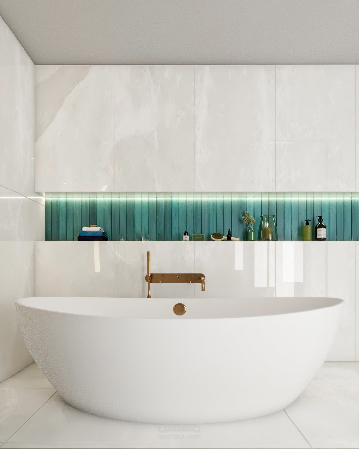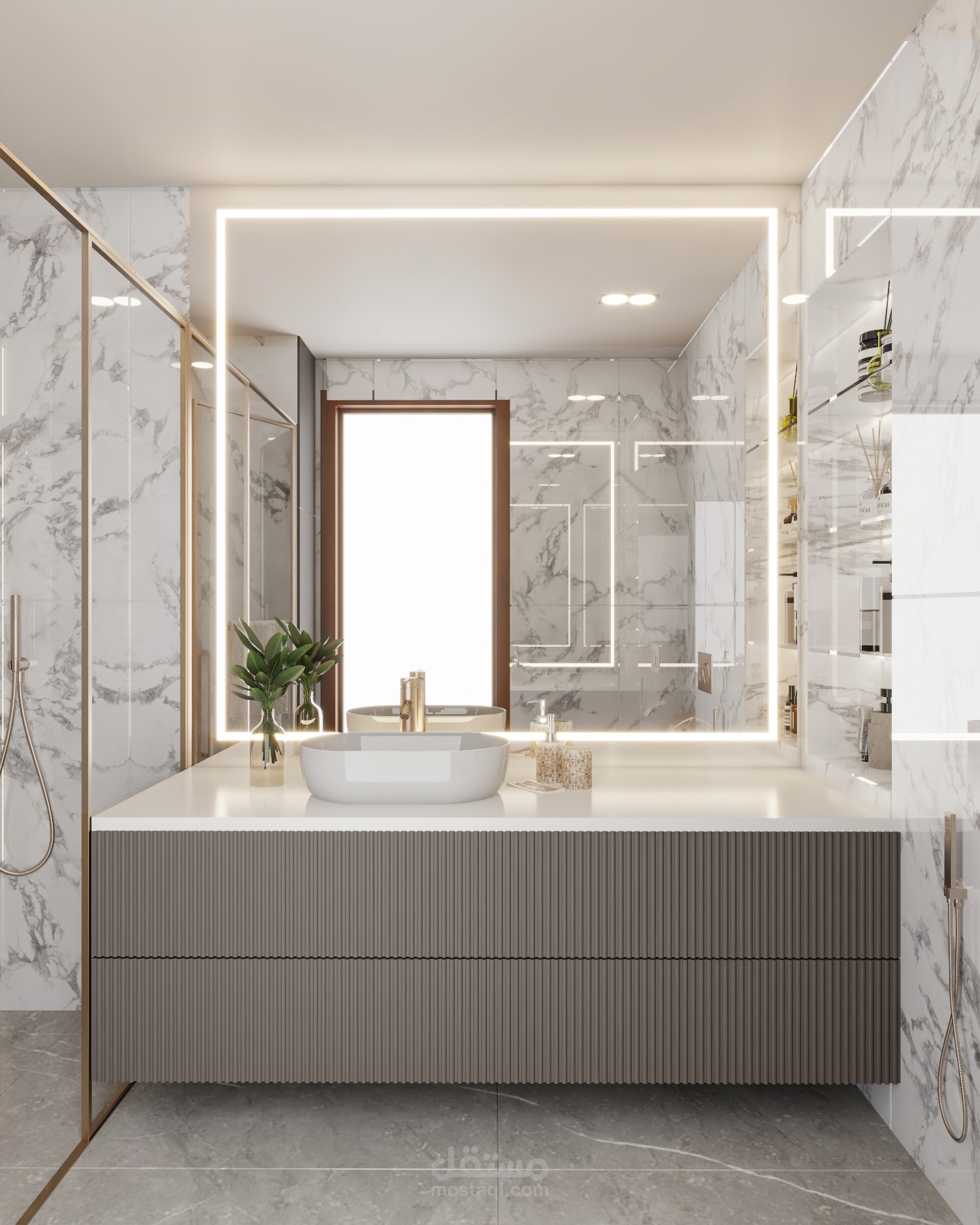 والعمل على الادوات الصحية بمختلف انواعها، ب تواليت معلق او مخفي او عادي، مع انارات مخفية وتجوايف وارفف جدارية لاستغلالها في التخزين.