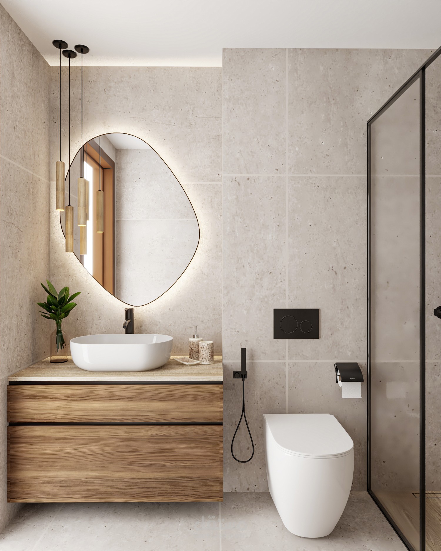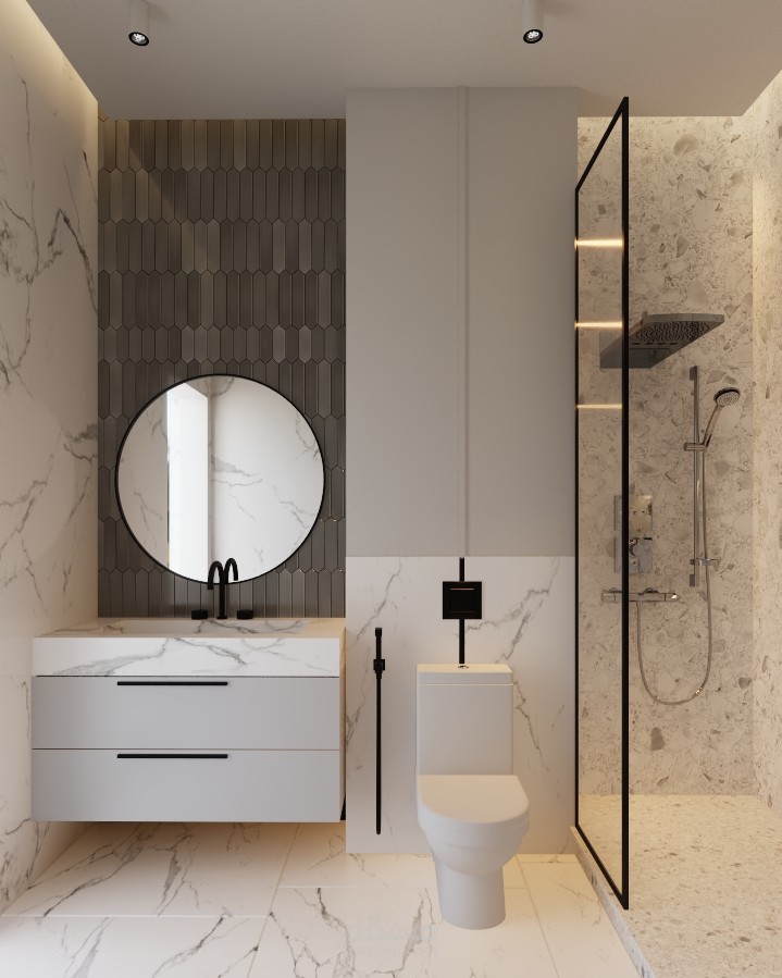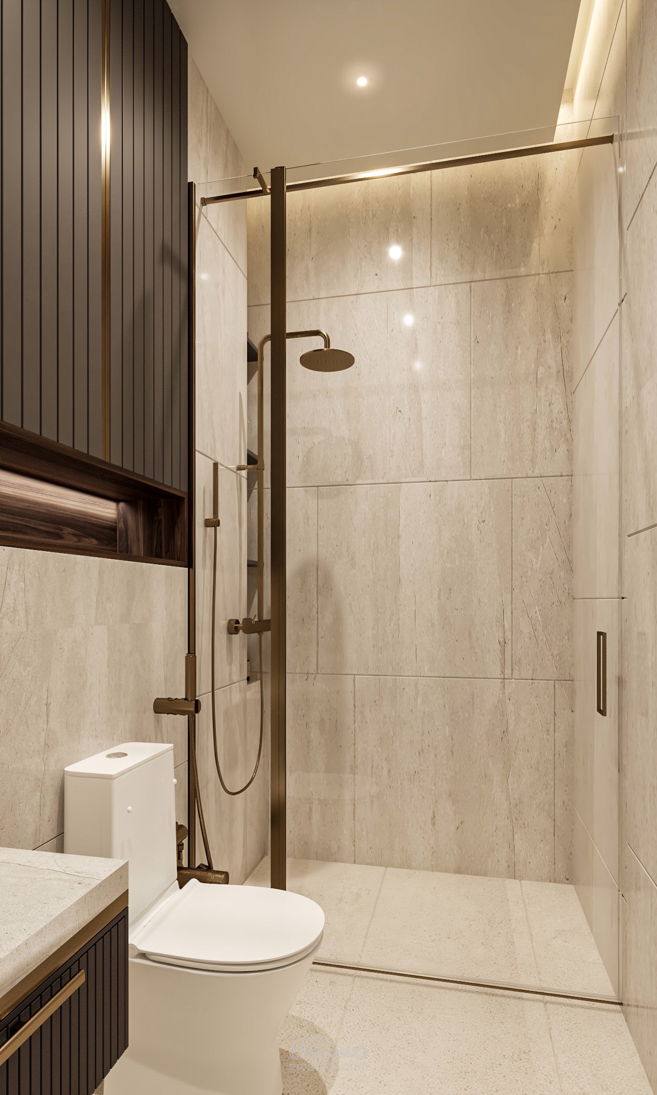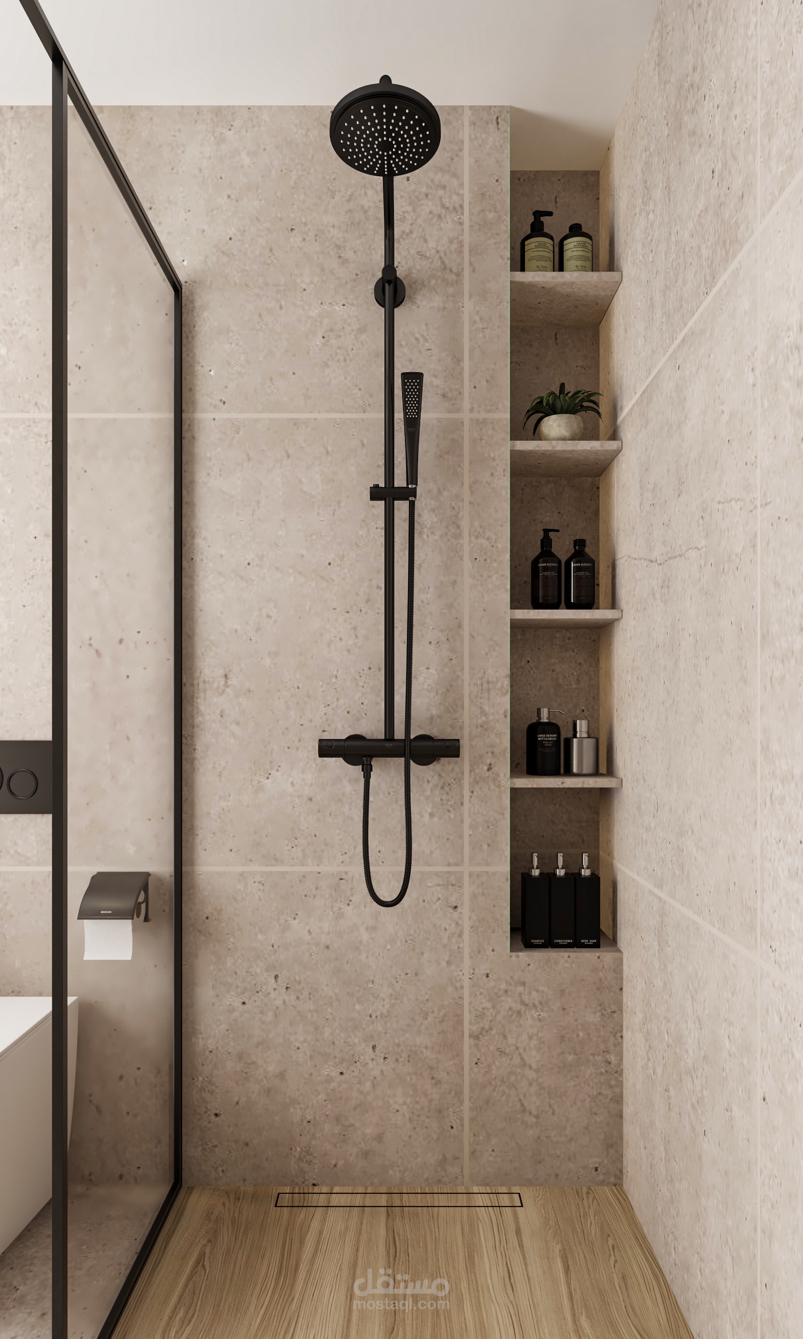والعمل على الادوات الصحية بمختلف انواعها، ب تواليت معلق او مخفي او عادي، مع انارات مخفية وتجوايف وارفف جدارية لاستغلالها في التخزين.