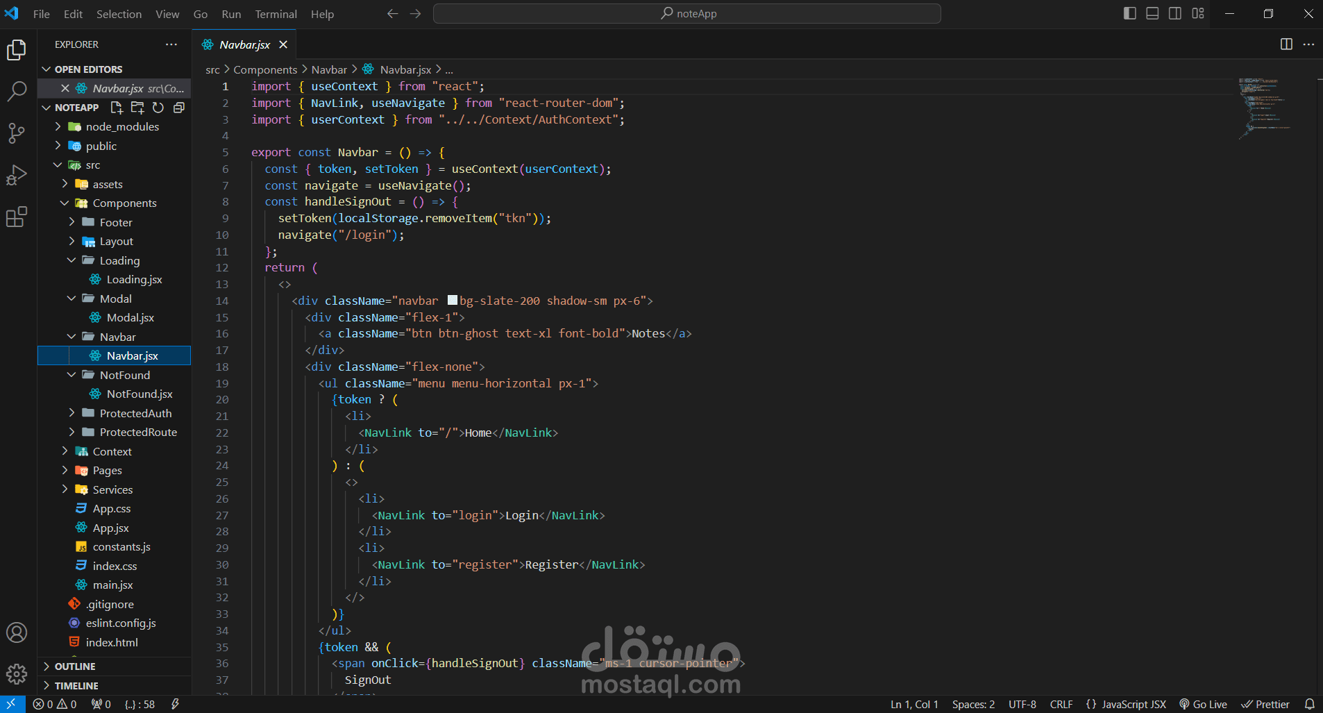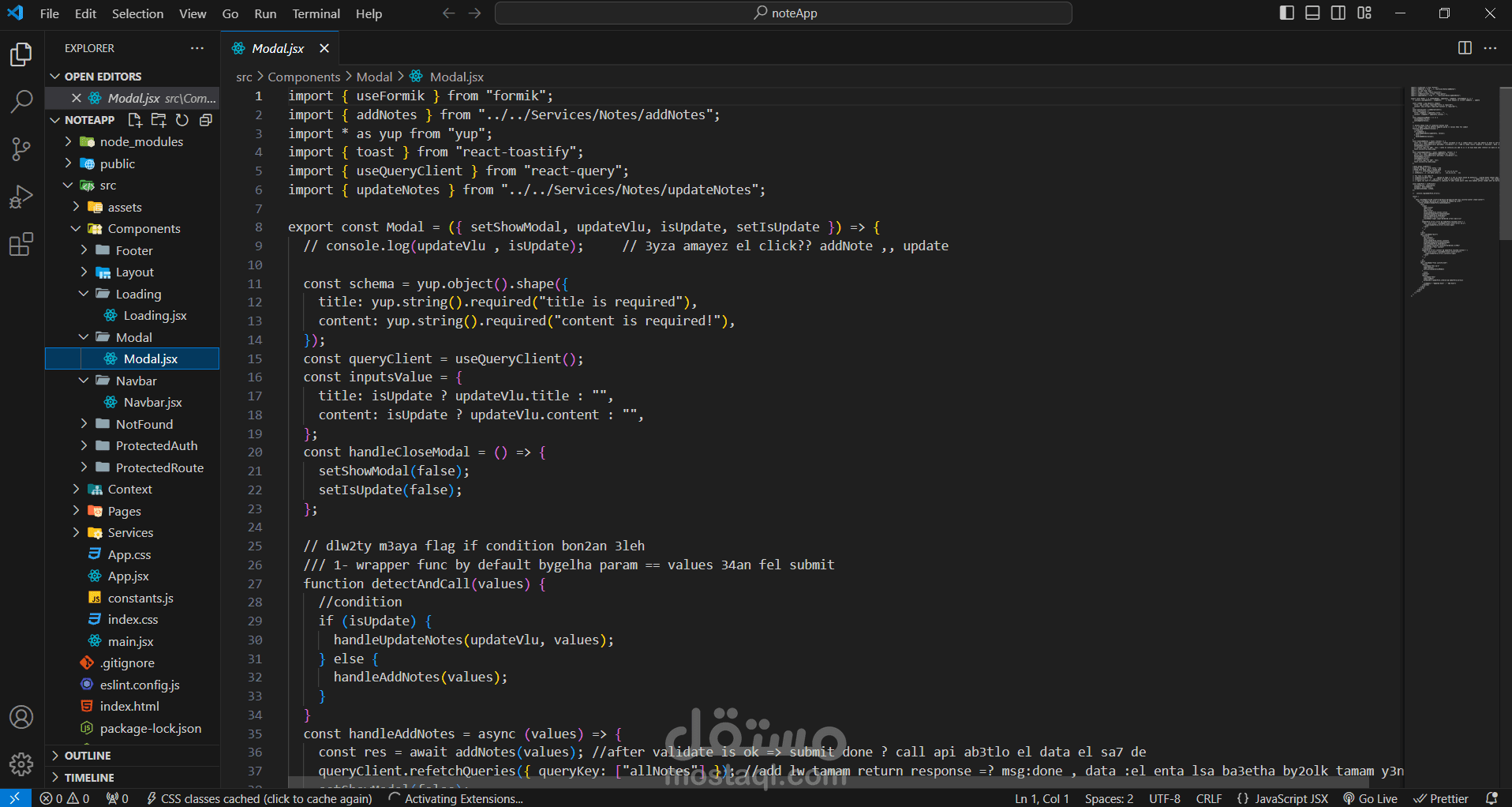 إدارة الحالة: تم استخدام React hooks مثل useState و useEffect لإدارة حالات التطبيق، بما في ذلك إضافة، حذف، وتحديث الملاحظات.