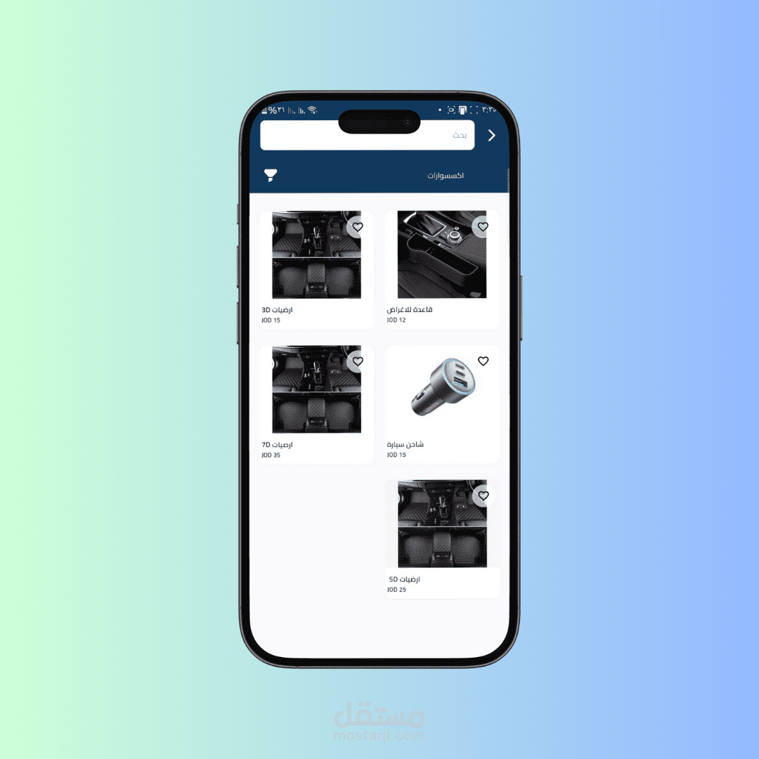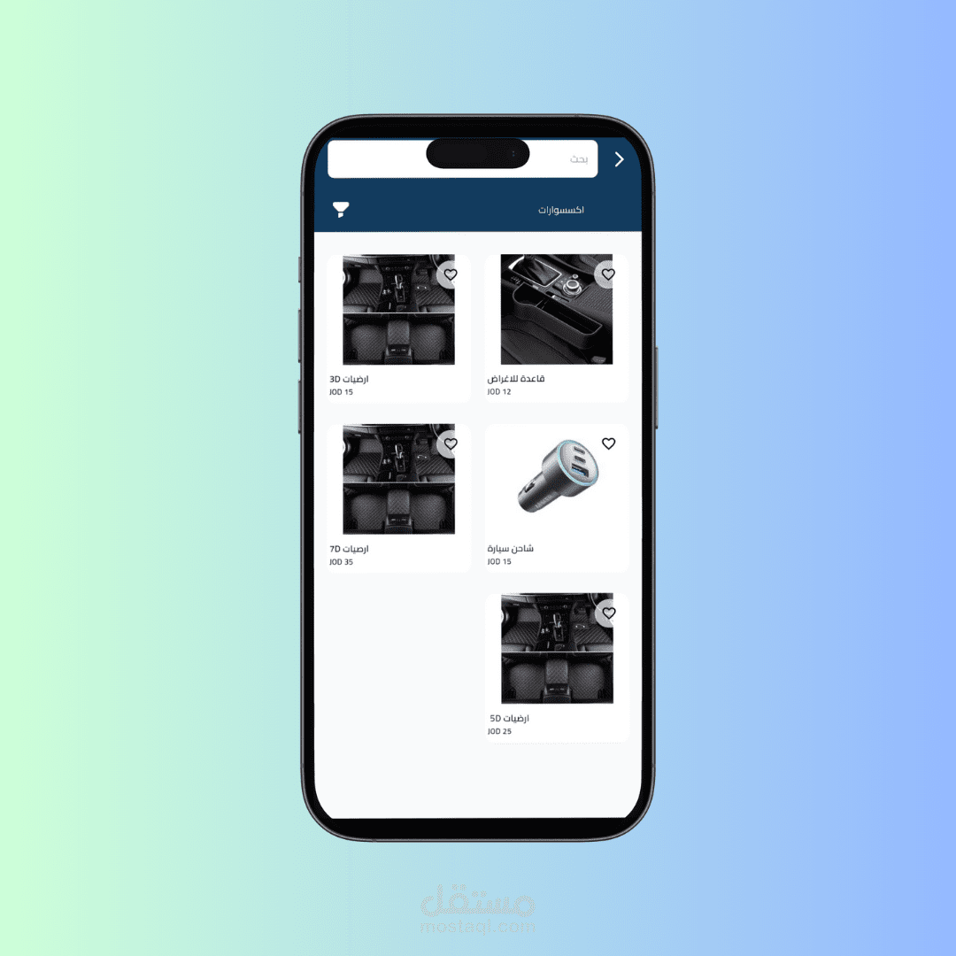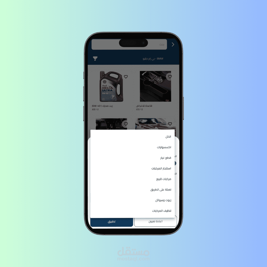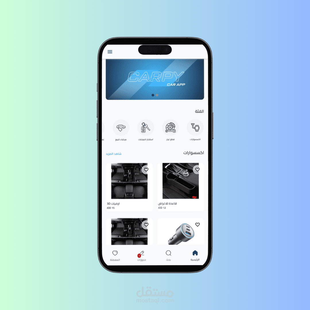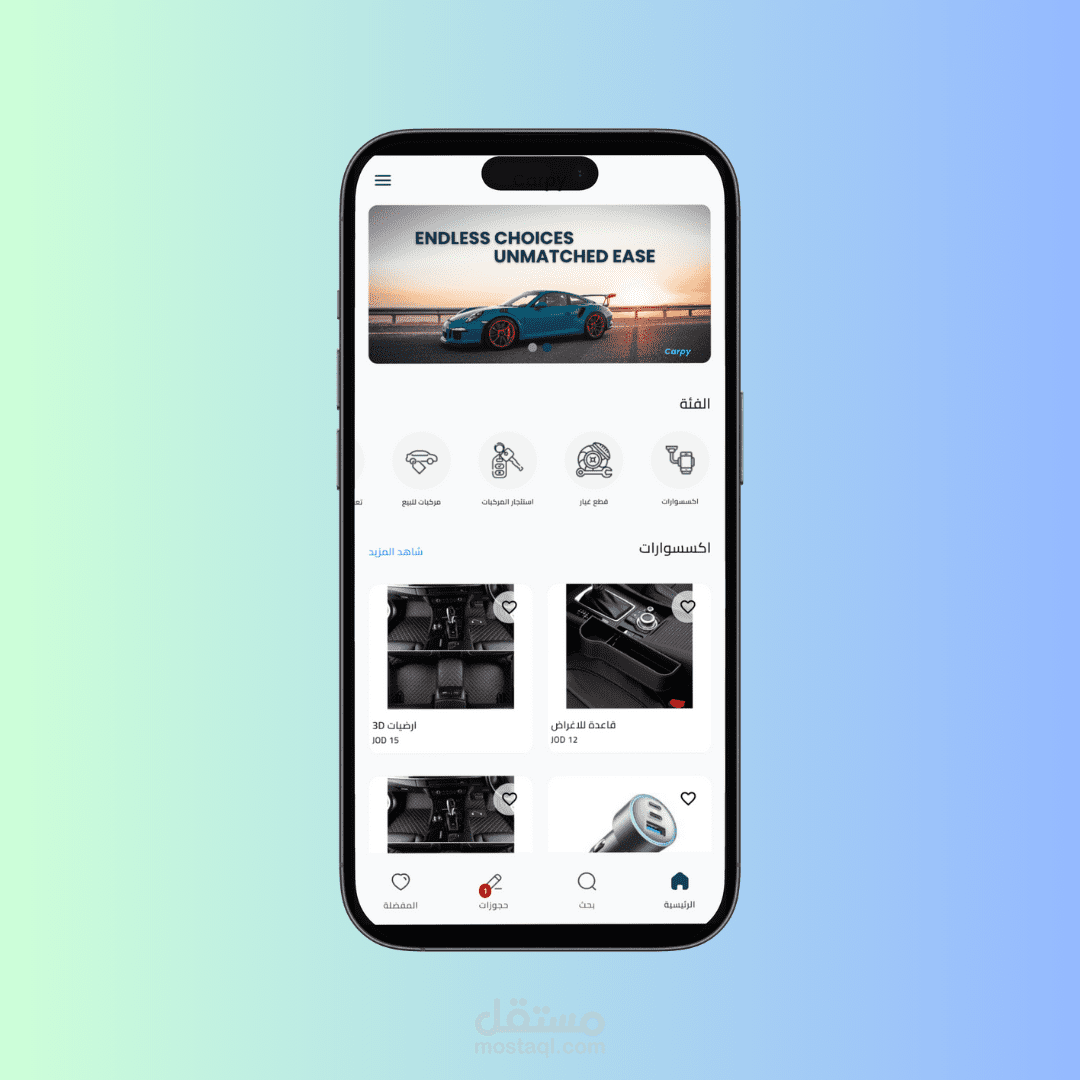 الصفحة الرئيسية تحتوي على جميع أنواع الفئات مثل (إكسسوارات، قطع غيار، بيع وتأجير المركبات، الخ...)