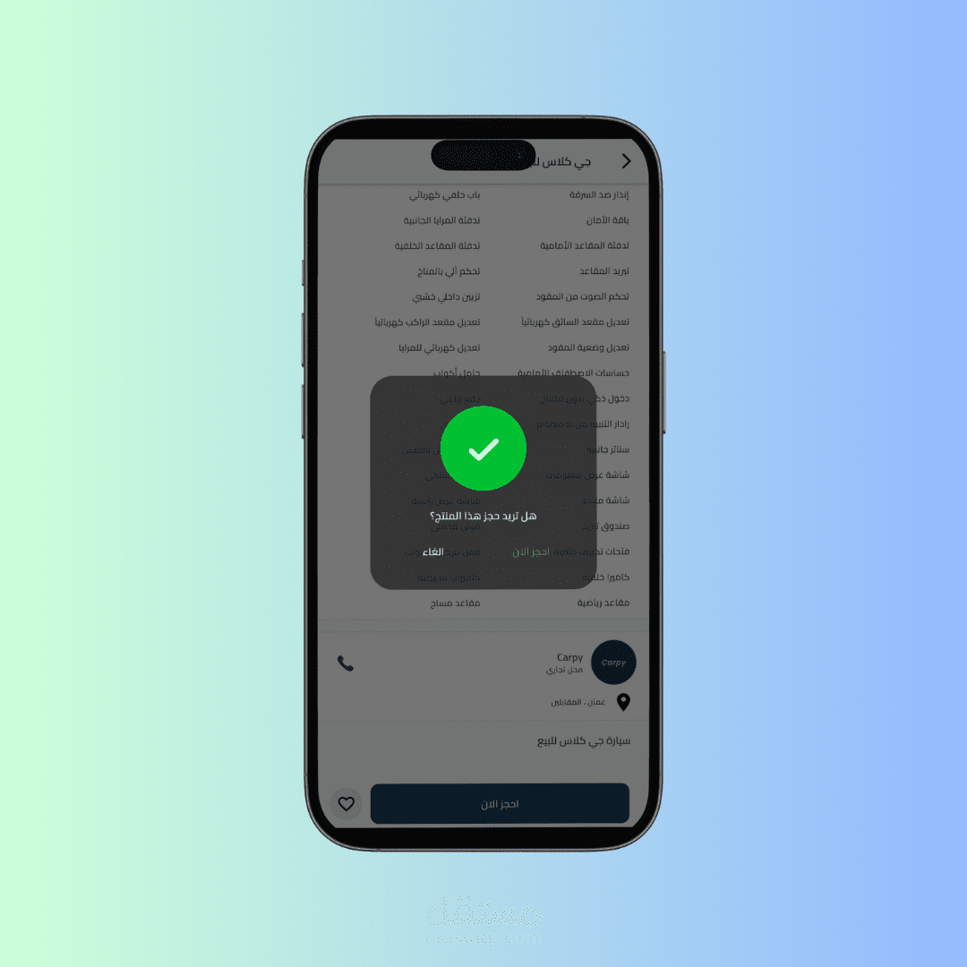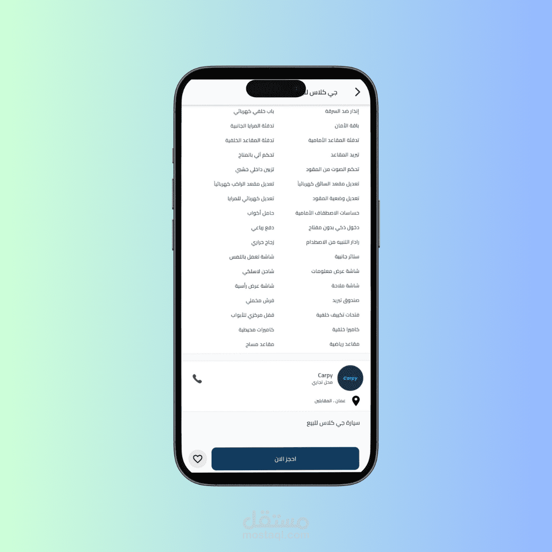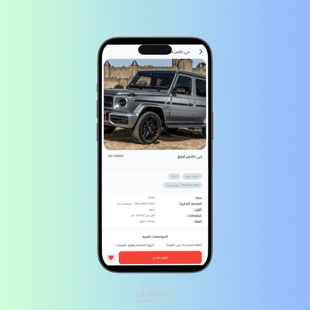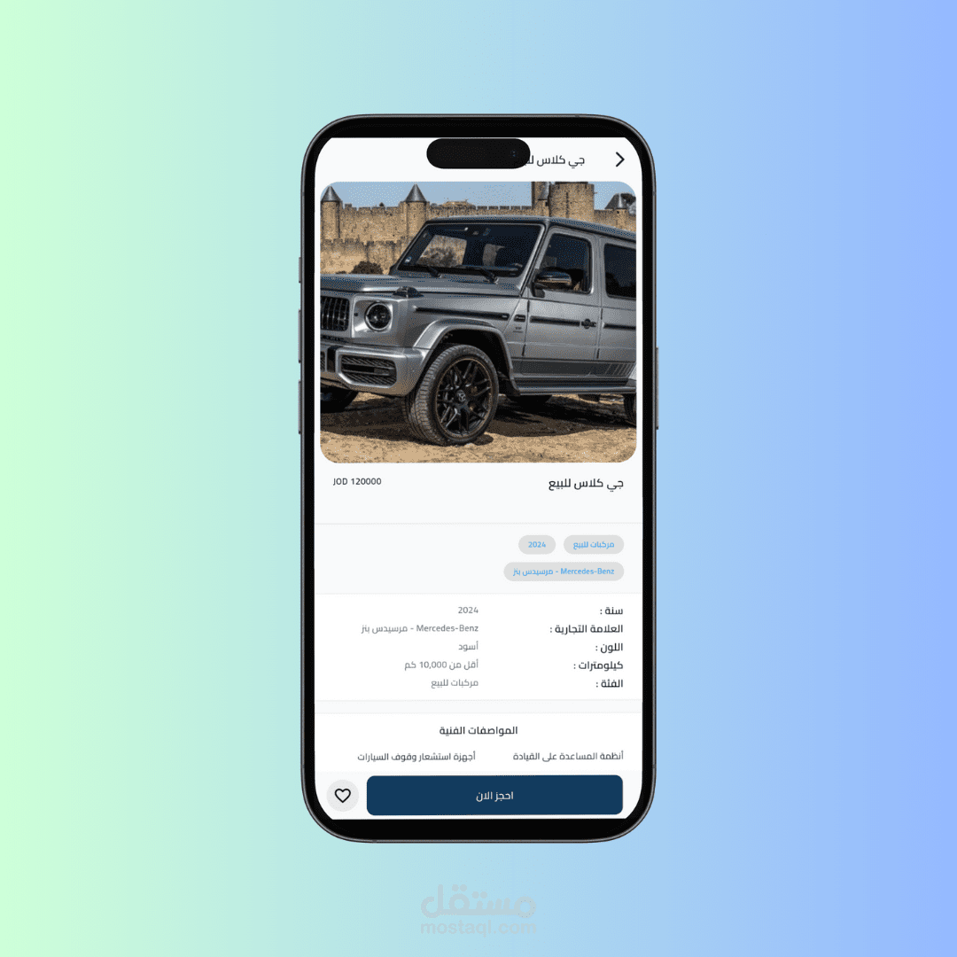 عند الضغط على إعلان من فئة البيع أو الاستئجار، يتم عرض كافة التفاصيل مع إظهار (الموديل، العلامة التجارية، اللون، الكيلومترات، الفئة، التفاصيل الفنية)