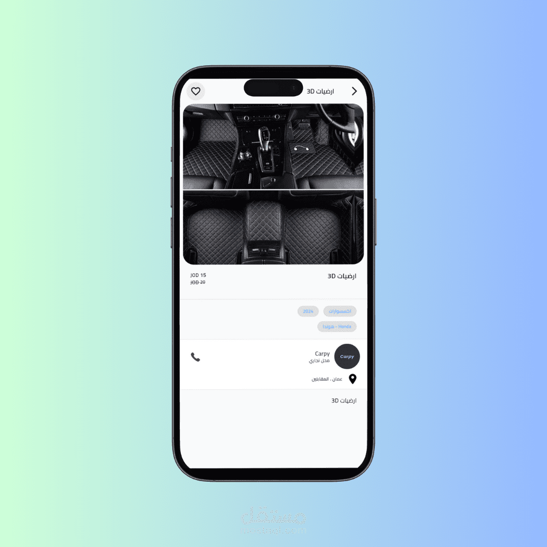 عند الضغط على إعلان من فئة الإكسسوارات أو قطع الغيار أو الزيوت والسوائل، يتم إظهار كافة تفاصيل المنتج (الاسم، صور المنتج، السعر قبل الخصم، السعر بعد الخصم، وصف المنتج)