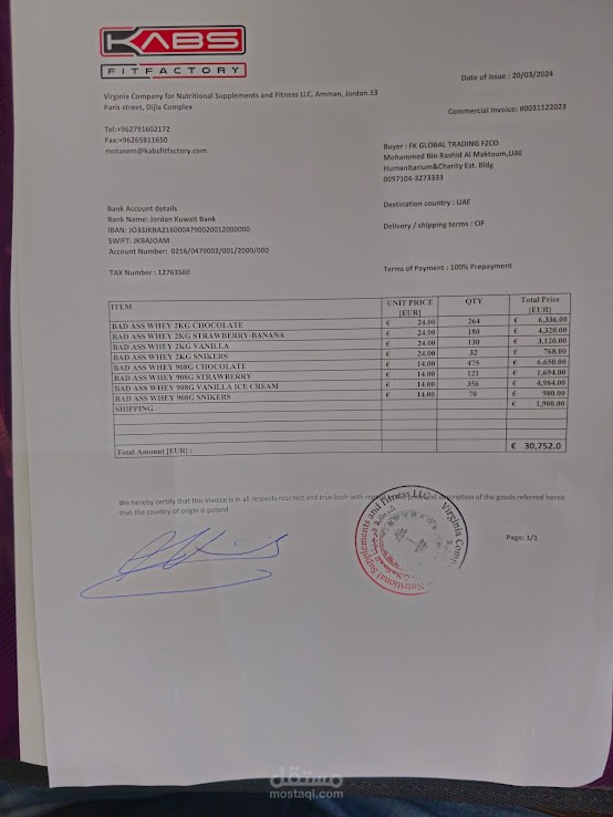 ادخال اسماء المنتجات مع رمز التعرفة و الكمية بالضافة الى اسعار تكلفة كل منتج , مع كود التعريف , فواتير اعادة تصدير موثة و مختومة حسب الاصول