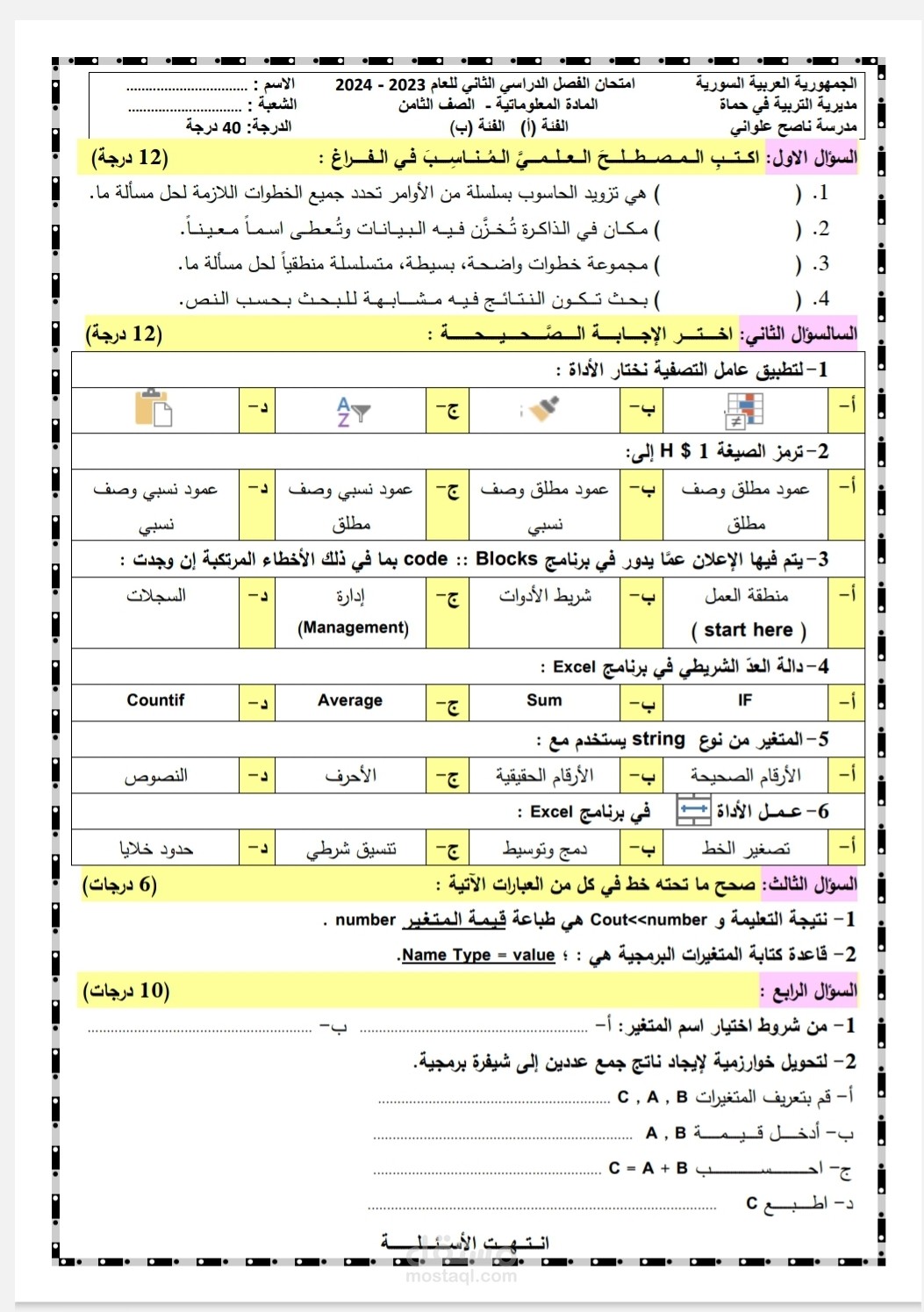 كتابة نموذج أسئلة امتحان لطلاب الصف الثامن الإعدادي في مادة المعلوماتية مكتوب باستخدام برنامج Word.