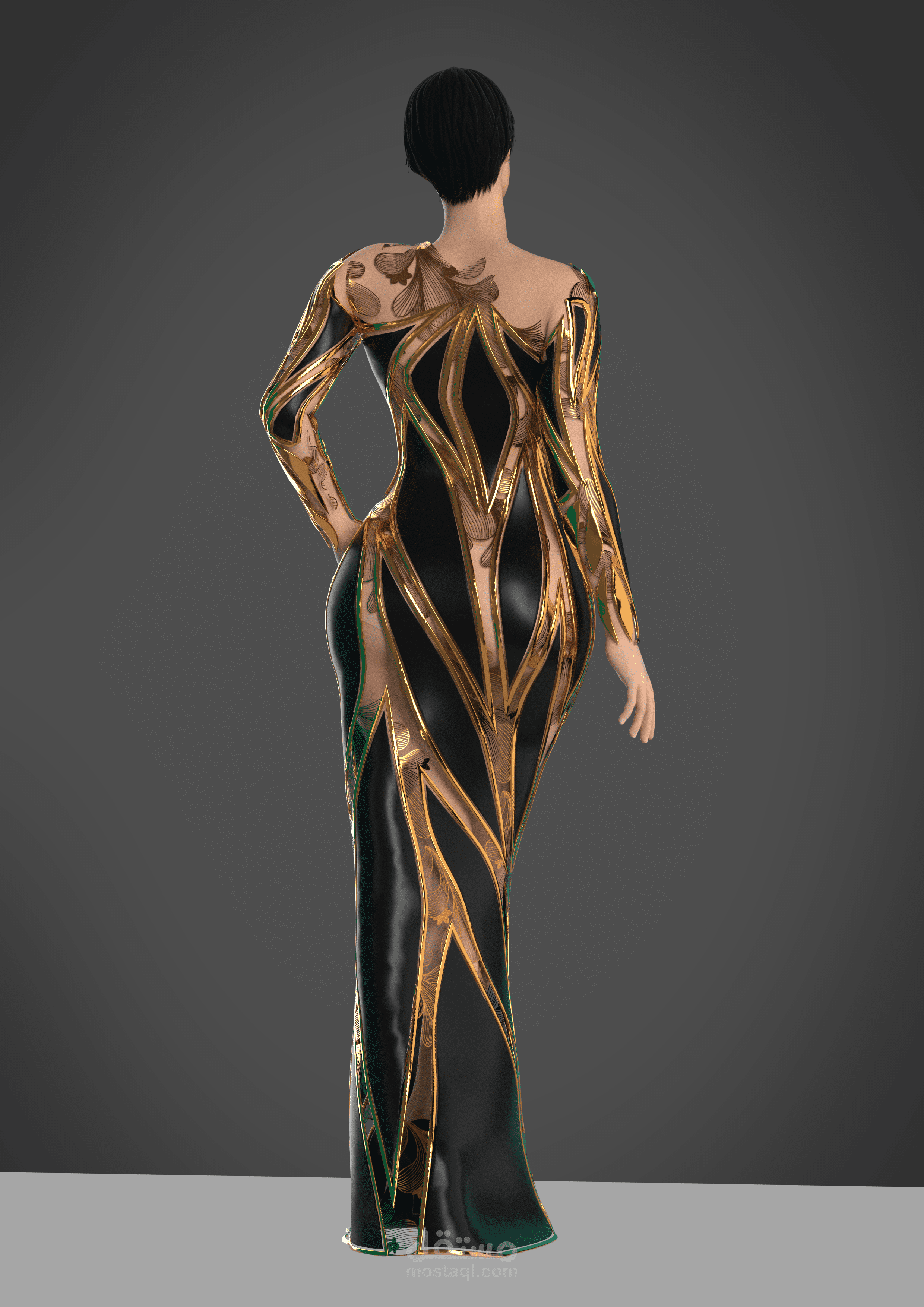 تصميم فخم وملفت يتميز بفستان طويل باللون الأسود الداكن مع تطعيمات هندسية ذهبية خالصة تمتد بانسيابية على كامل القماش، لتشكل خطوطًا متعرجة تشبه أغصان النباتات أو شرارات النار. الفستان أوف شولدر مع لمسات من اضاءة باللون الأخضر الهادئ تضيف عمقًا ولمعانًا، ما يمنحه طابعًا ملكيًا يوحي بالقوة والأناقة في آن واحد. التصميم يجمع بين الطابع الطبيعي العضوي المستوحى من الطبيعة، والطابع المعدني المستقبلي، ليخلق إطلالة مسرحية آسرة.