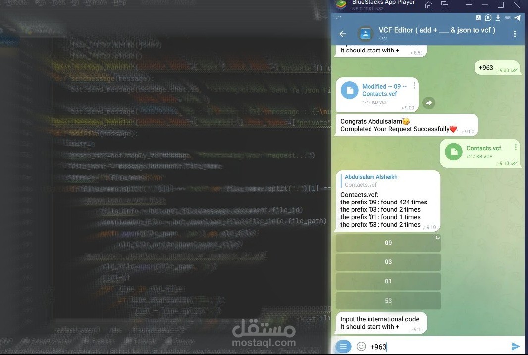 تم تطوير بوت تيليجرام باستخدام بايثون لحل المشكلات المتعلقة بإدارة جهات الاتصال. يمكن للبوت سحب جهات الاتصال من تيليجرام وتصديرها كملف VCF. كما يمكنه إضافة رموز الاتصال الدولية إلى أرقام الهواتف المحلية. البوت غير نشط حاليًا. والملفات المصدرية للكود غير قابلة للنشر.