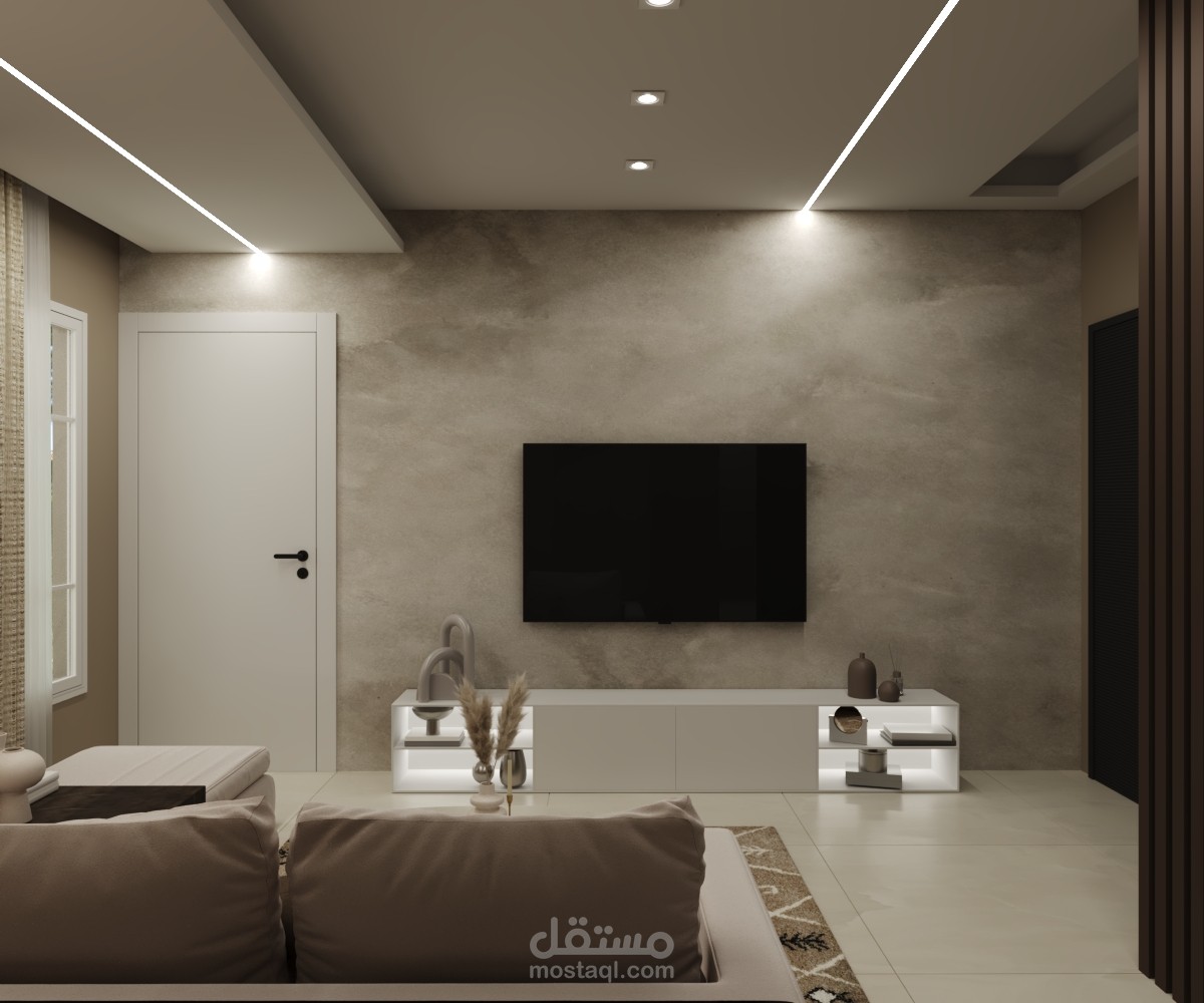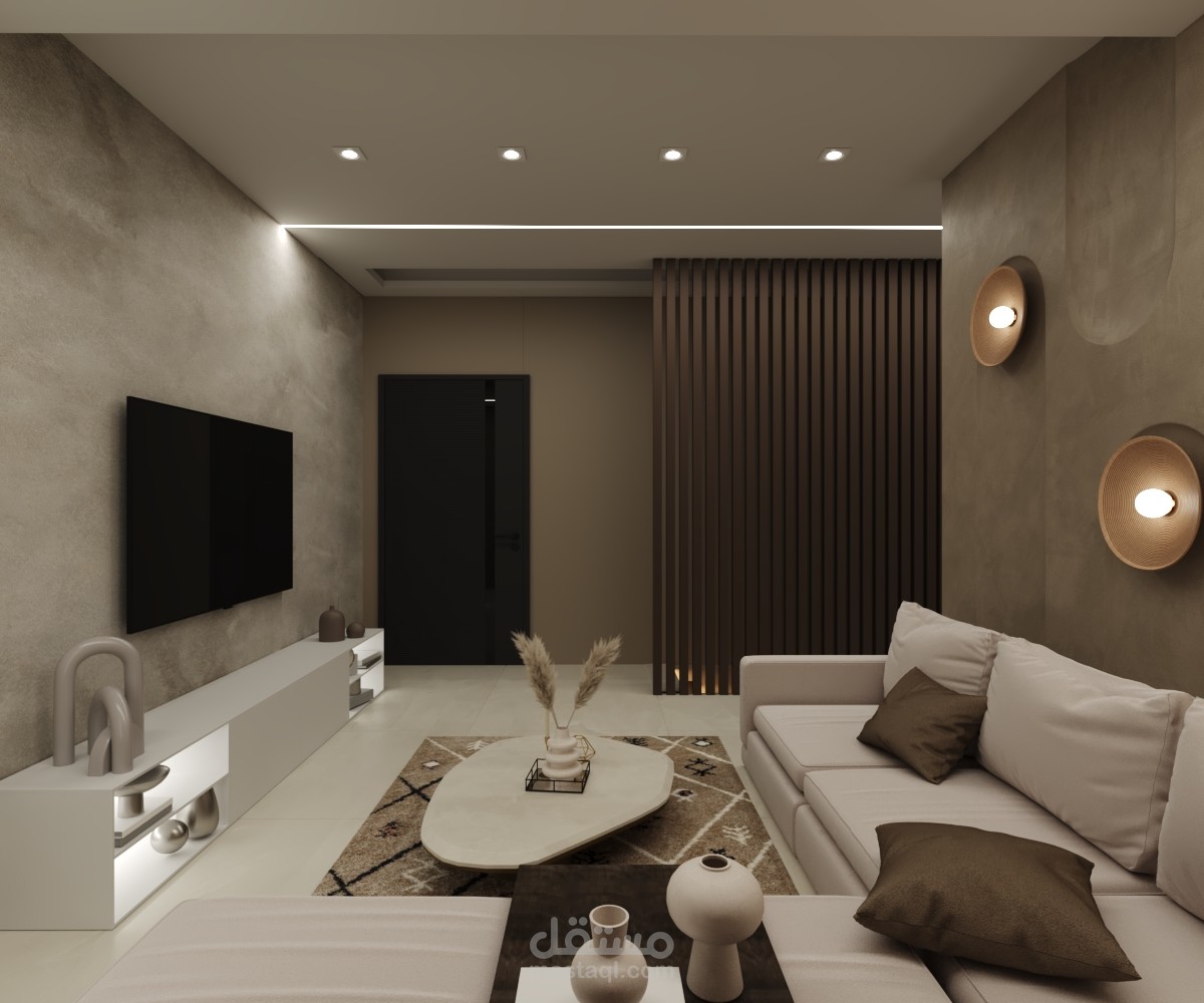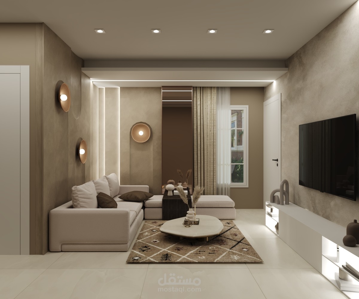 غرفة معيشة بالطراز البوهيمي المتميز باستخدام الخشب واللون البيج مع تنوع الاضاءات