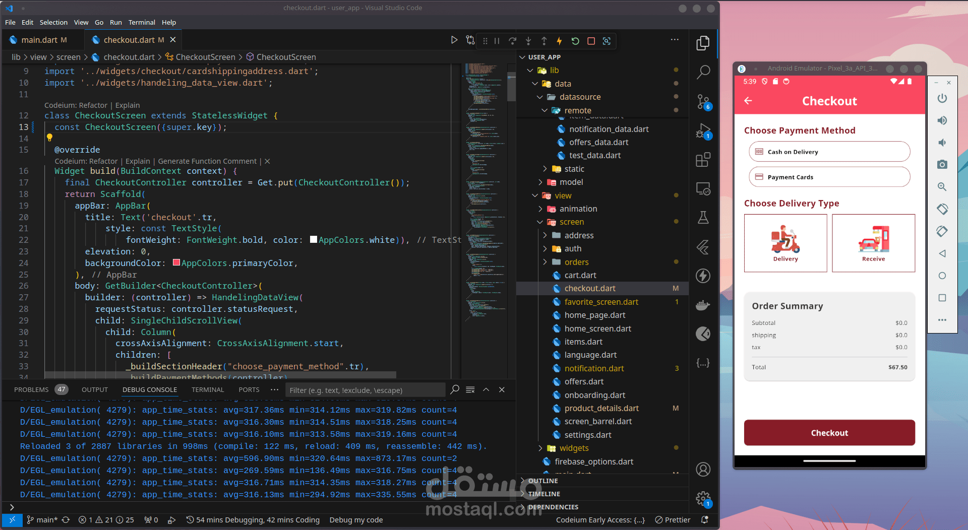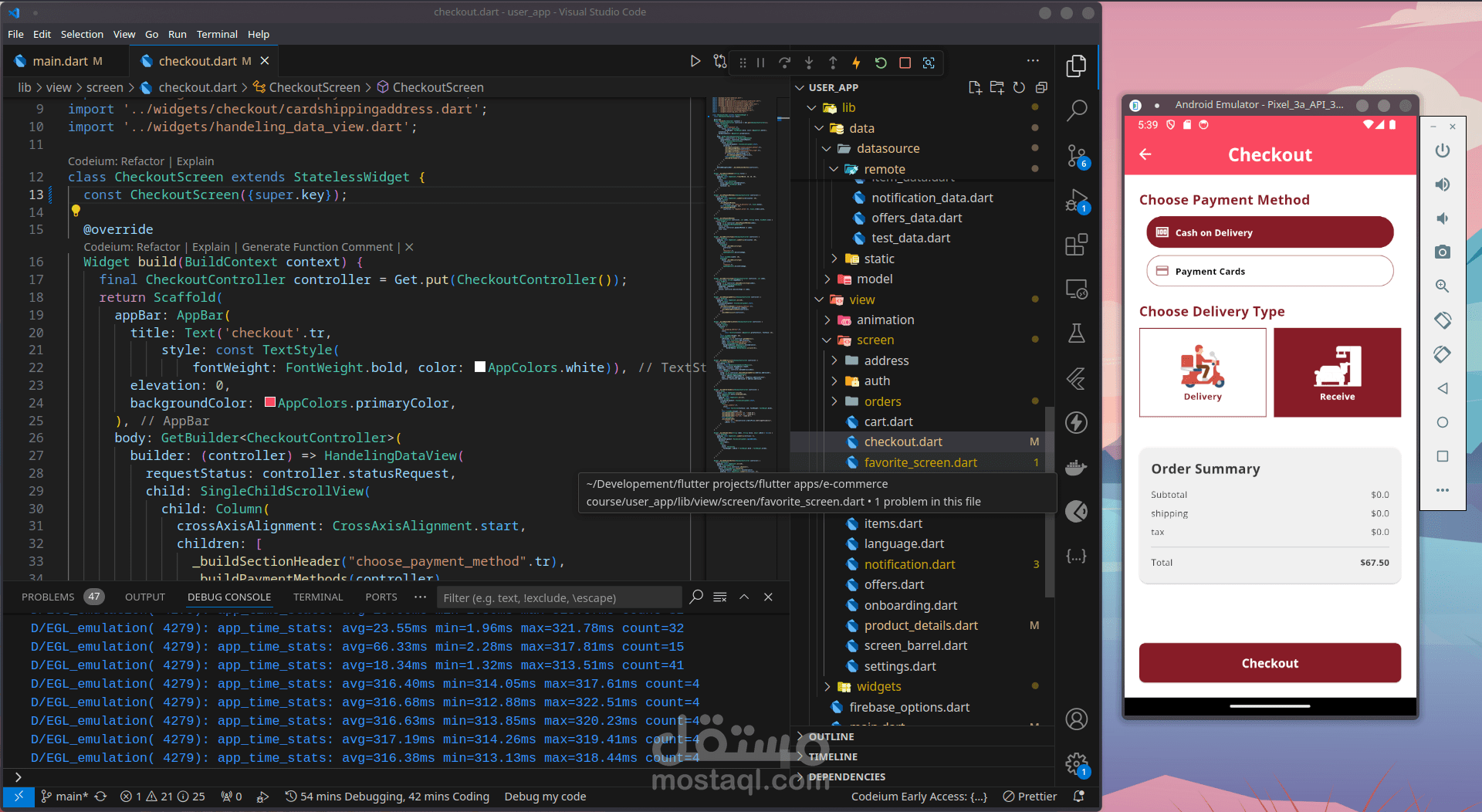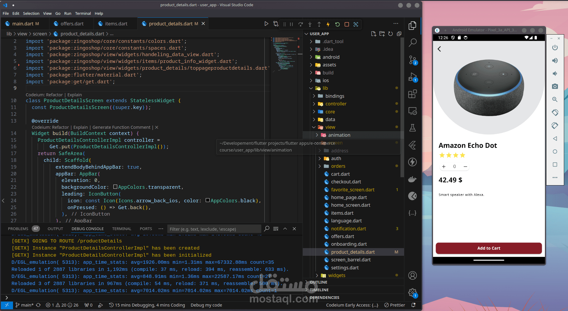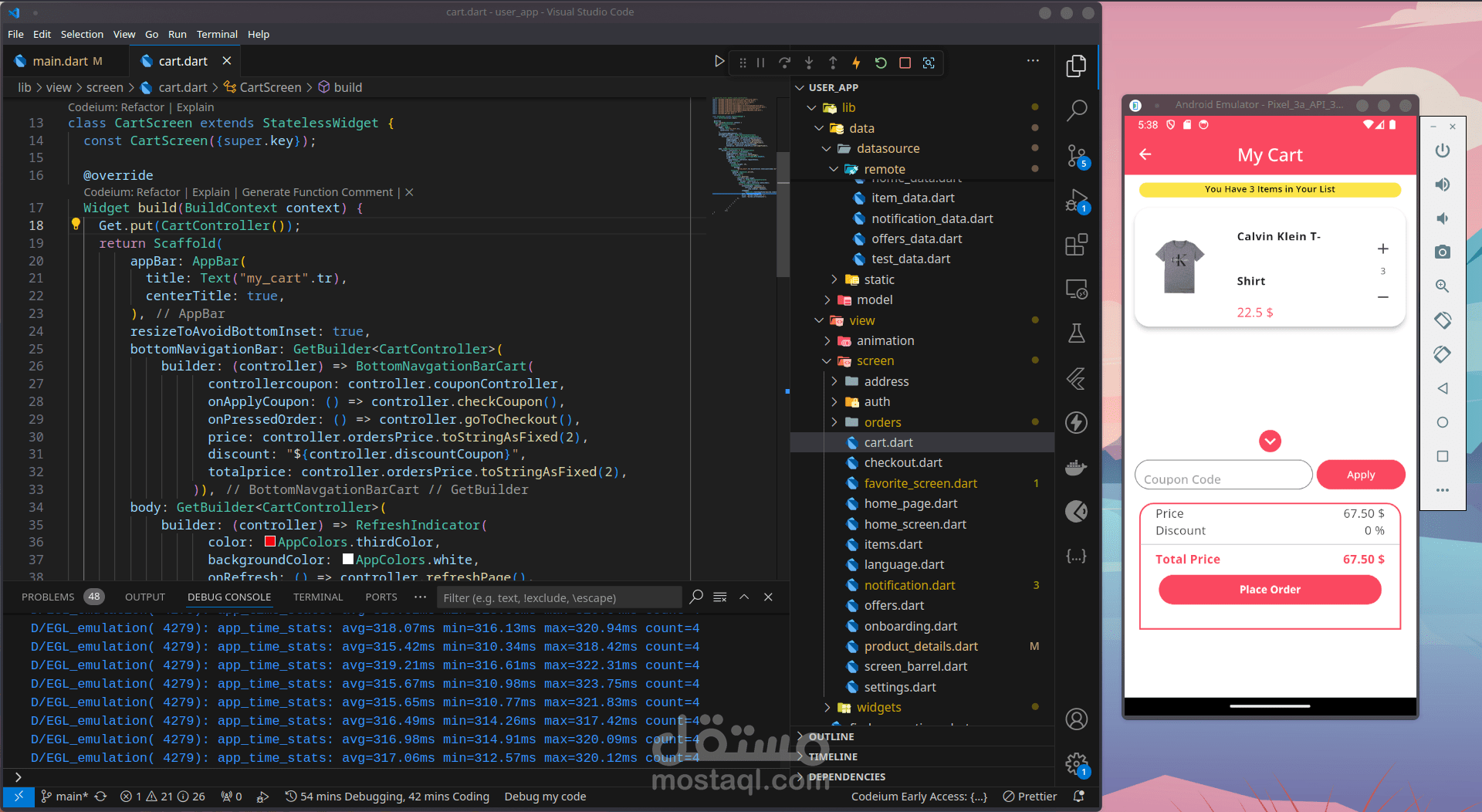 سلة التسوق: تم تطوير شاشة سلة تسوق سهلة الاستخدام في Flutter ، مما يسمح للمستخدمين بمشاهدة العناصر الموجودة في سلة التسوق الخاصة بهم ، وضبط الكميات ، وإزالة العناصر ، والمتابعة إلى عملية الدفع.