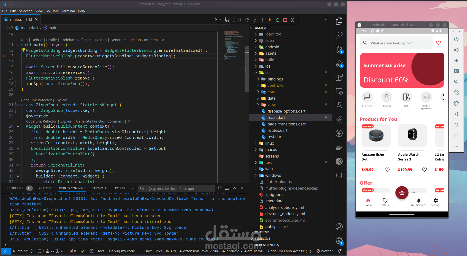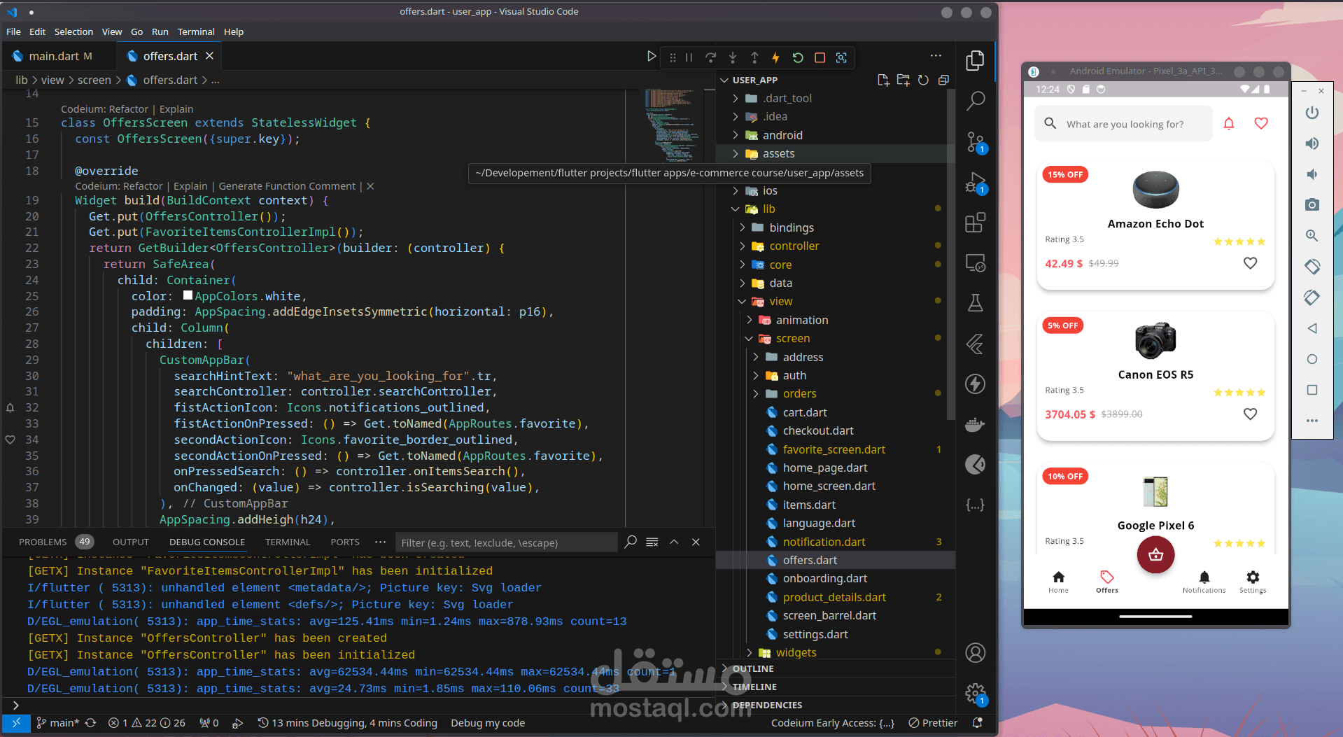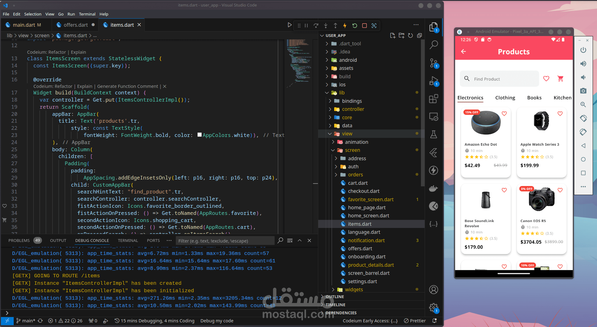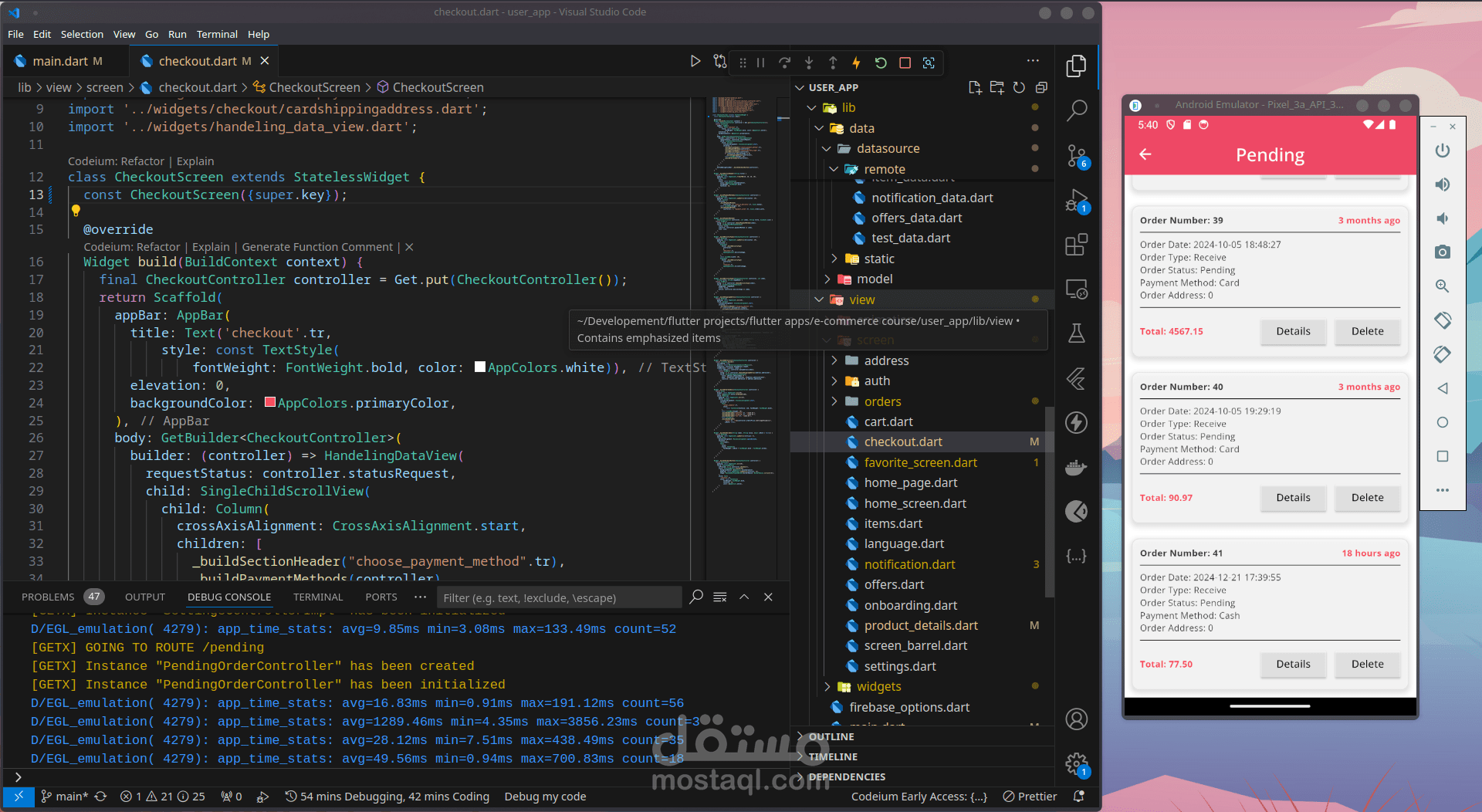 سلة التسوق: تم تطوير شاشة سلة تسوق سهلة الاستخدام في Flutter ، مما يسمح للمستخدمين بمشاهدة العناصر الموجودة في سلة التسوق الخاصة بهم ، وضبط الكميات ، وإزالة العناصر ، والمتابعة إلى عملية الدفع.