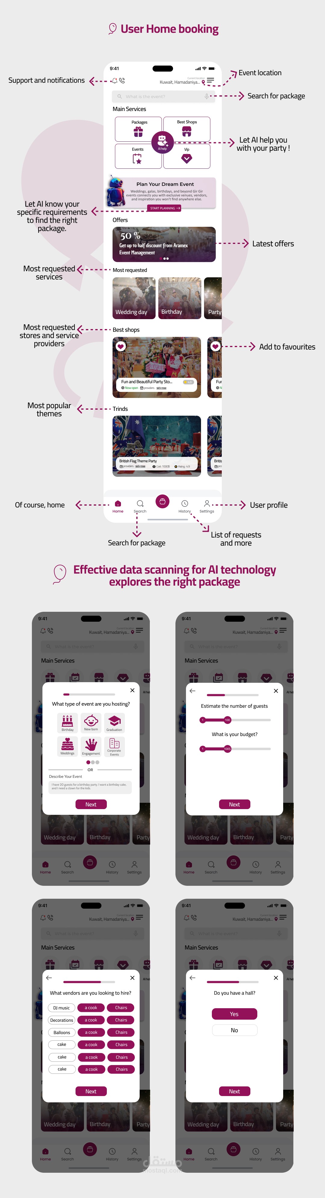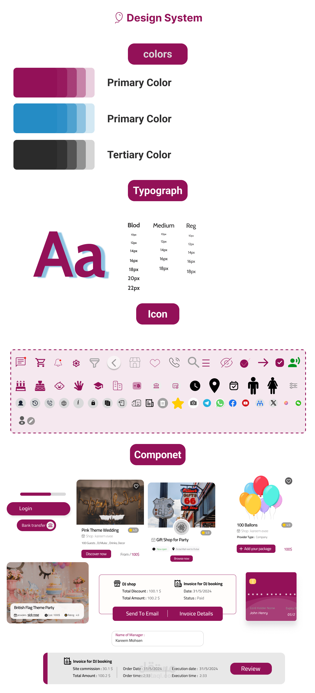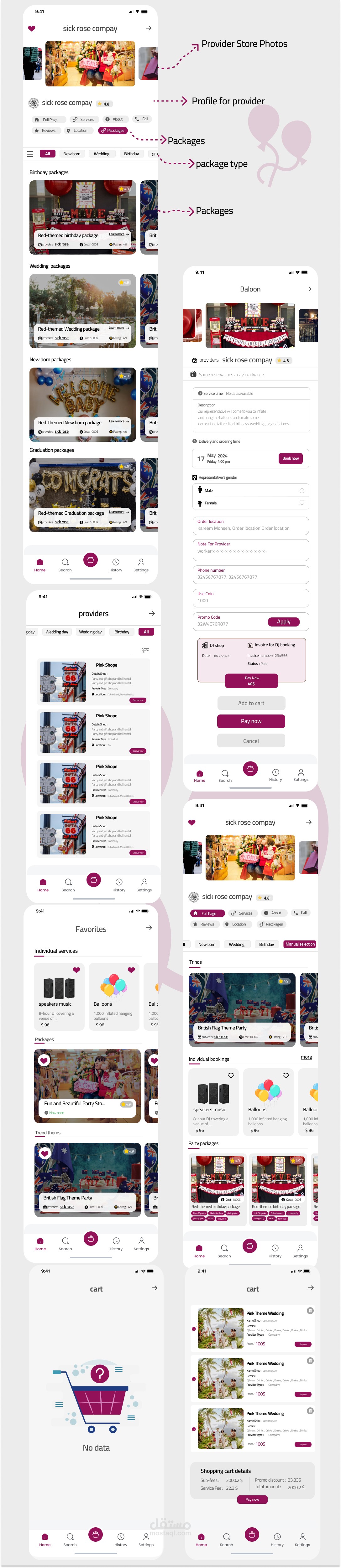 تصميم واجهة وتجربة مستخدم UXUI مبتكر لتطبيق متخصص في حجز وتنظيم الحفلات والمناسبات. يهدف التطبيق إلى تسهيل عملية التخطيط للحفلات عبر واجهة مستخدم سلسة وبسيطة تمكن المستخدمين من استعراض الخدمات والبكجات ، مقارنة بالأسعار، وحجز العروض المتاحة. قمت بتصميم تدفقات تفاعلية لضمان تجربة مستخدم مريحة، مع مراعاة التفاصيل المتعلقة بجميع جوانب الحفلات من اختيار المكان إلى الخدمات الإضافية مثل الطعام والتزيين. تم اعتماد لغة تصميم عصرية تتناسب مع هوية التطبيق وتضمن تجربة استخدام متميزة ...