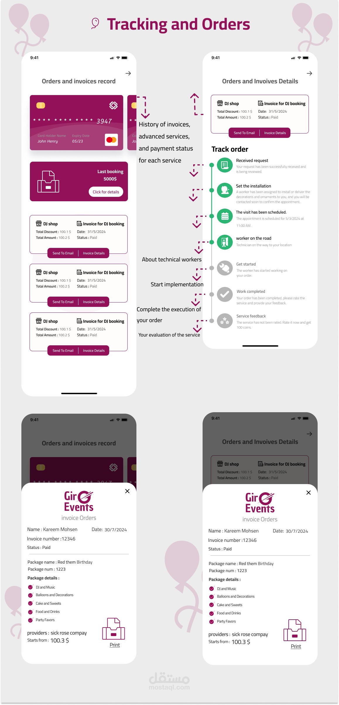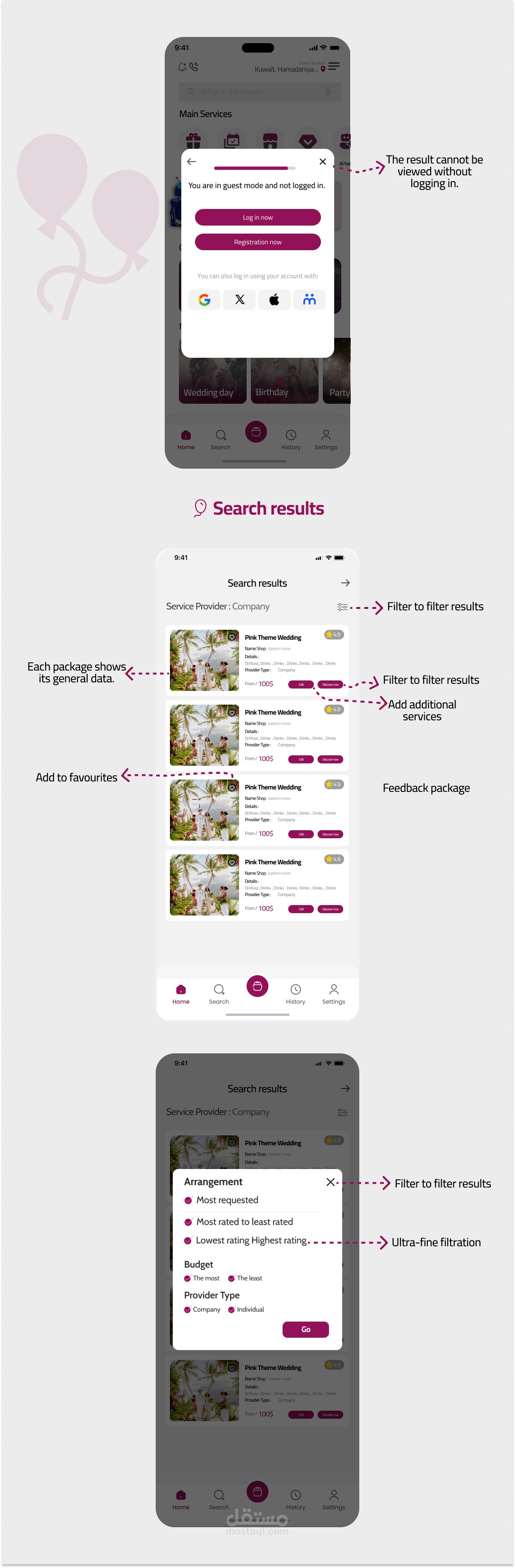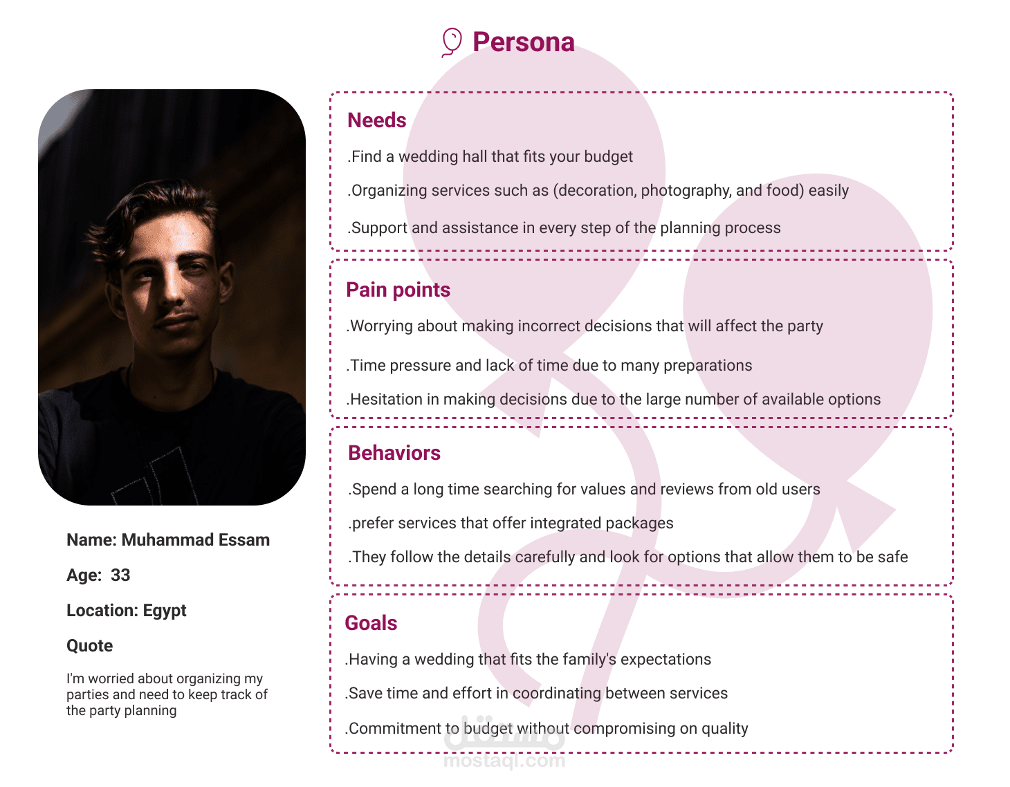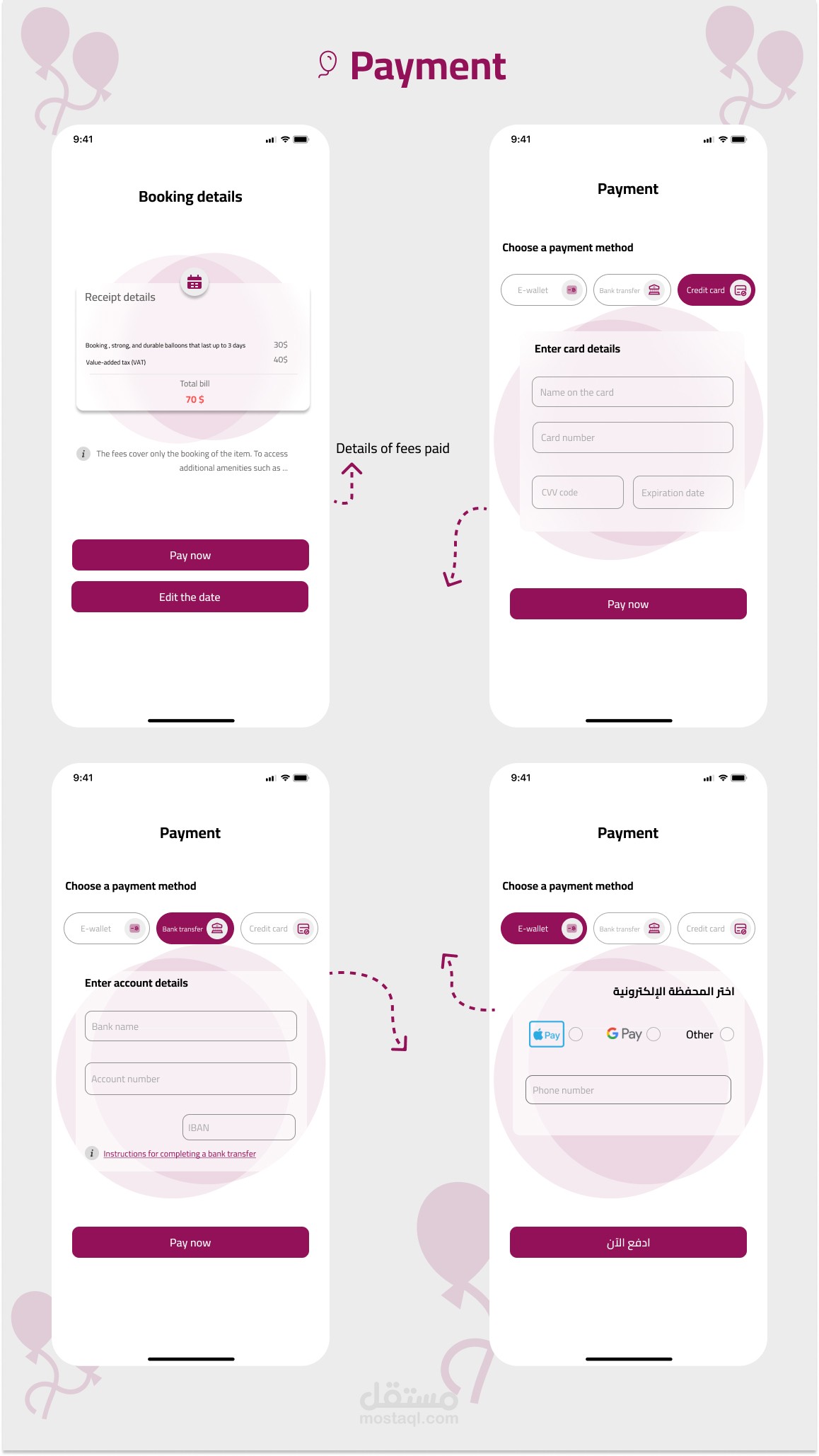 تصميم واجهة وتجربة مستخدم UXUI مبتكر لتطبيق متخصص في حجز وتنظيم الحفلات والمناسبات. يهدف التطبيق إلى تسهيل عملية التخطيط للحفلات عبر واجهة مستخدم سلسة وبسيطة تمكن المستخدمين من استعراض الخدمات والبكجات ، مقارنة بالأسعار، وحجز العروض المتاحة. قمت بتصميم تدفقات تفاعلية لضمان تجربة مستخدم مريحة، مع مراعاة التفاصيل المتعلقة بجميع جوانب الحفلات من اختيار المكان إلى الخدمات الإضافية مثل الطعام والتزيين. تم اعتماد لغة تصميم عصرية تتناسب مع هوية التطبيق وتضمن تجربة استخدام متميزة ...
