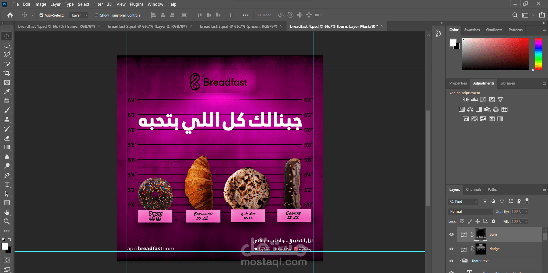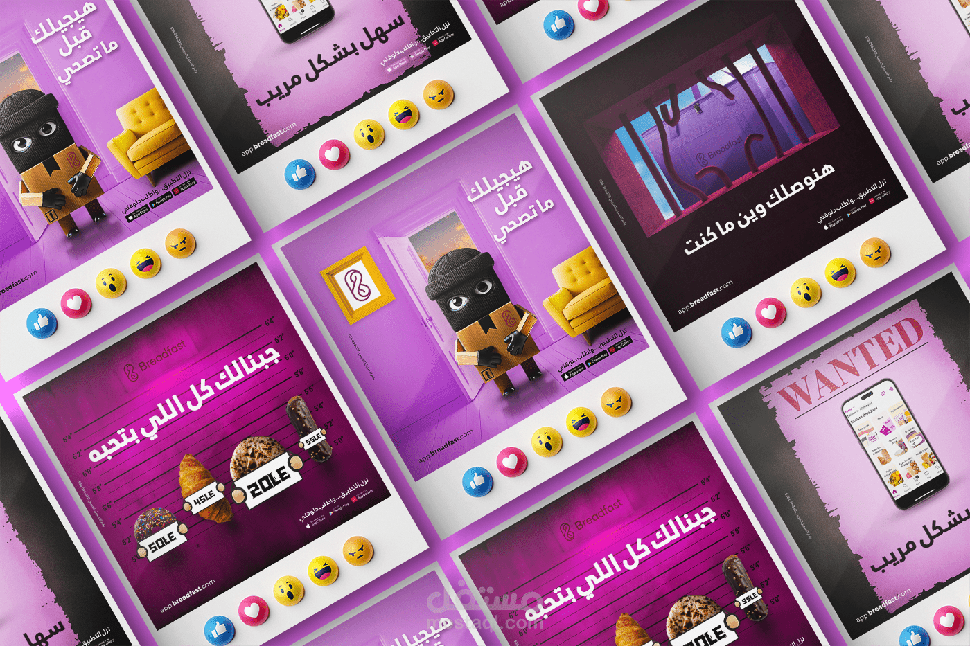 قمت بتصميم حملة إعلانية لBreadfast مكونة من أربع منشورات على وسائل التواصل الاجتماعي، حيث ركزت على تقديم محتوى جذاب ومرئي يعكس هوية العلامة التجارية. تم استخدام الألوان والخطوط بشكل متناسق لجذب الانتباه وتعزيز الرسالة التسويقية.
