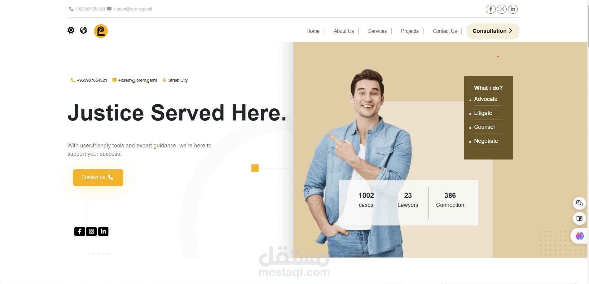 هو موقع للاجراءات القانونية لمحامي لتسهل التواصل والتعامل مع العملاء ويوفر عدة ميزات منها الاستشارة وعرض القضايا وغيرها