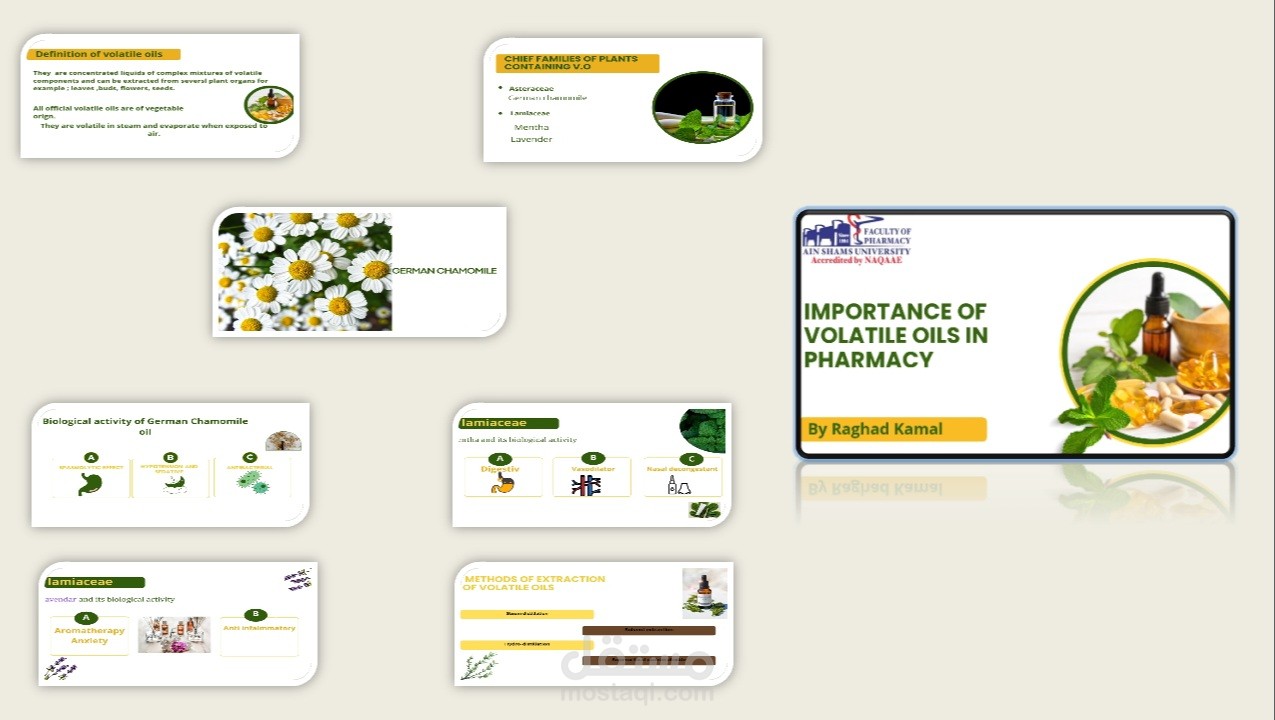 أهلا بكم في معرض أعمالي، أقدم لكم عرض تقديمي عن الزيوت العطرية التي توجد في النباتات وأهميتها في مجال الصيدله حيث أنها تستخدم في علاج الكثير من الأمراض والمشاكل .