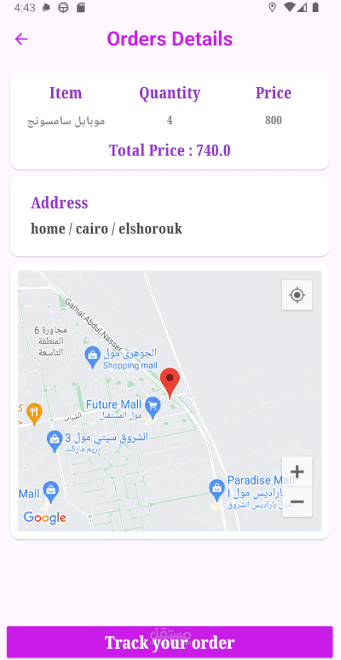 3. users mobile app للشراء و متابعة الطلبات و متابعة حركة عمال التوصيل بشكل مباشر , و ايضا يدعم الدفع الالكترونى باستخدام paymob gateway