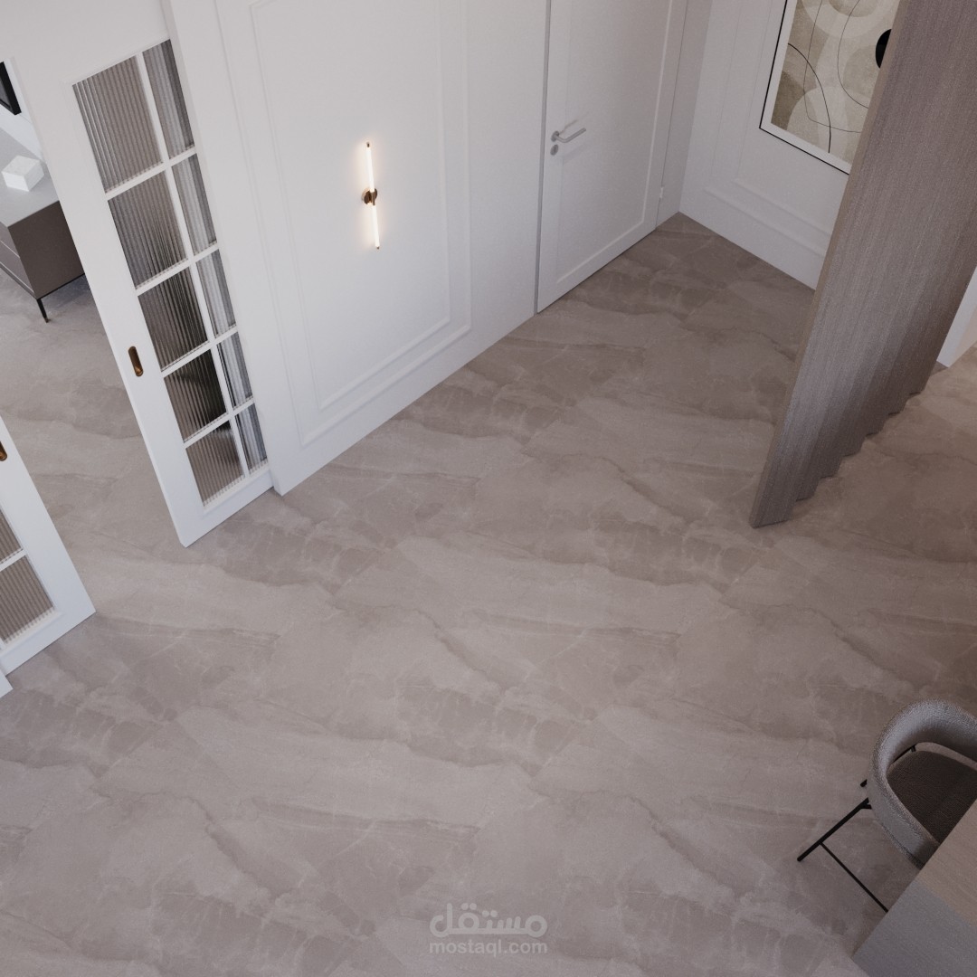 مواد حديثة: استخدام الرخام وعناصر جبسمبورد، مما أضفى لمسة عصرية وفخمة.
