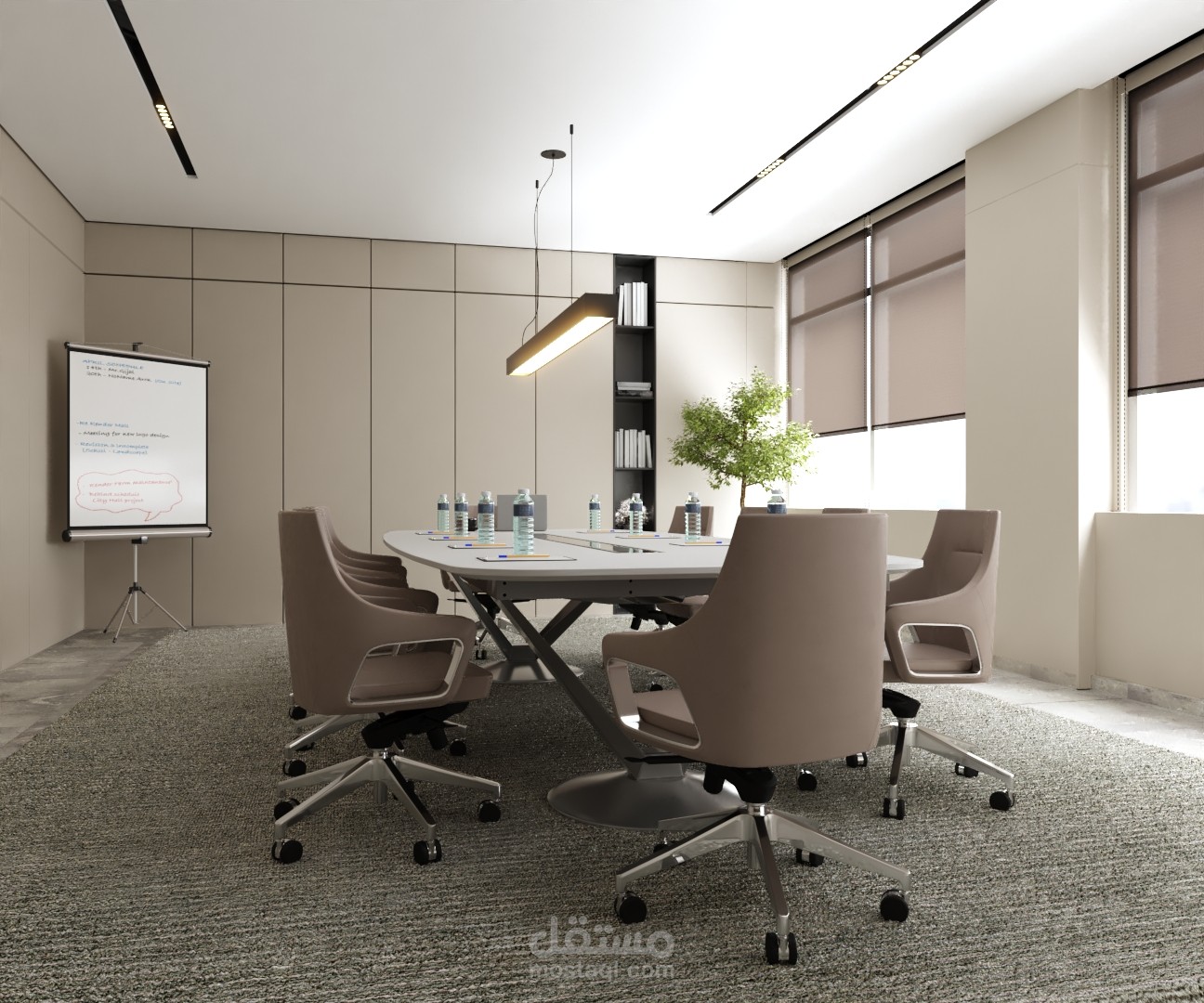 تم اختيار ألوان مريحة لغرفة الاجتماعات للسيد مؤيد، مع التركيز على درجات الرمادي. إليك التفاصيل: