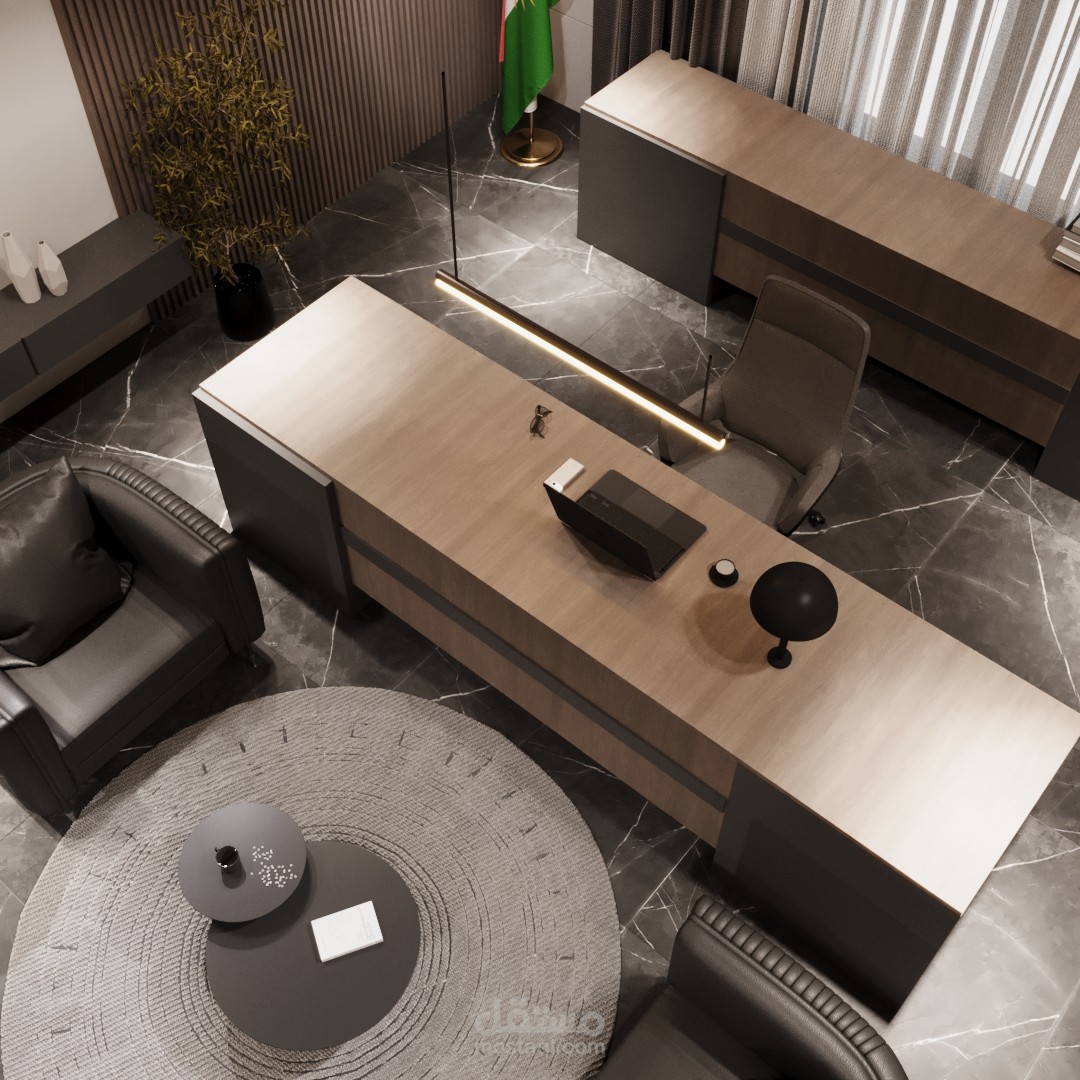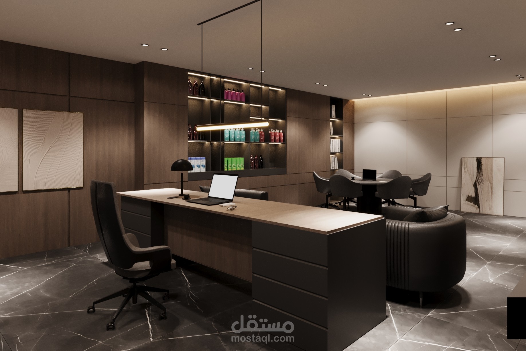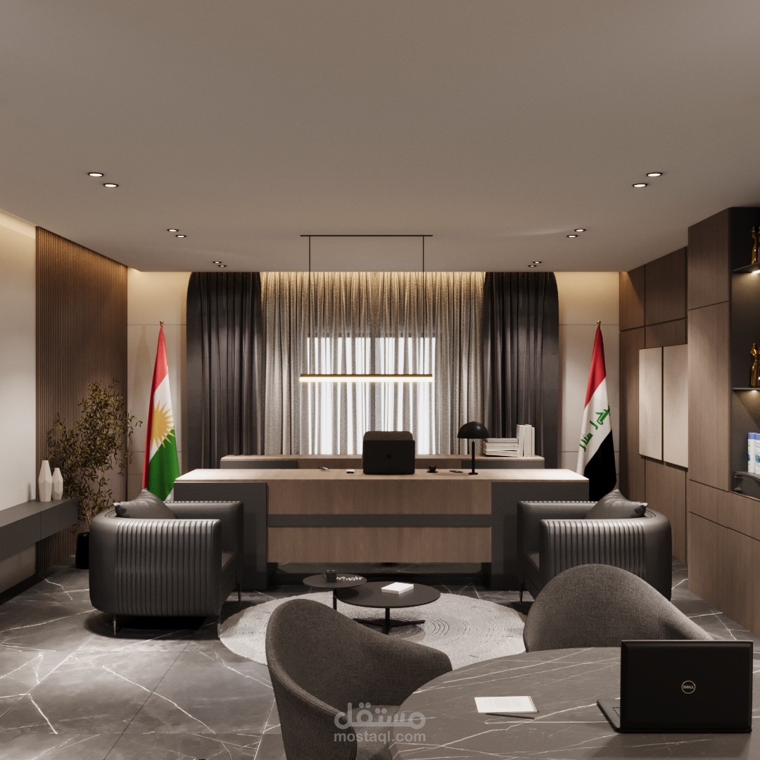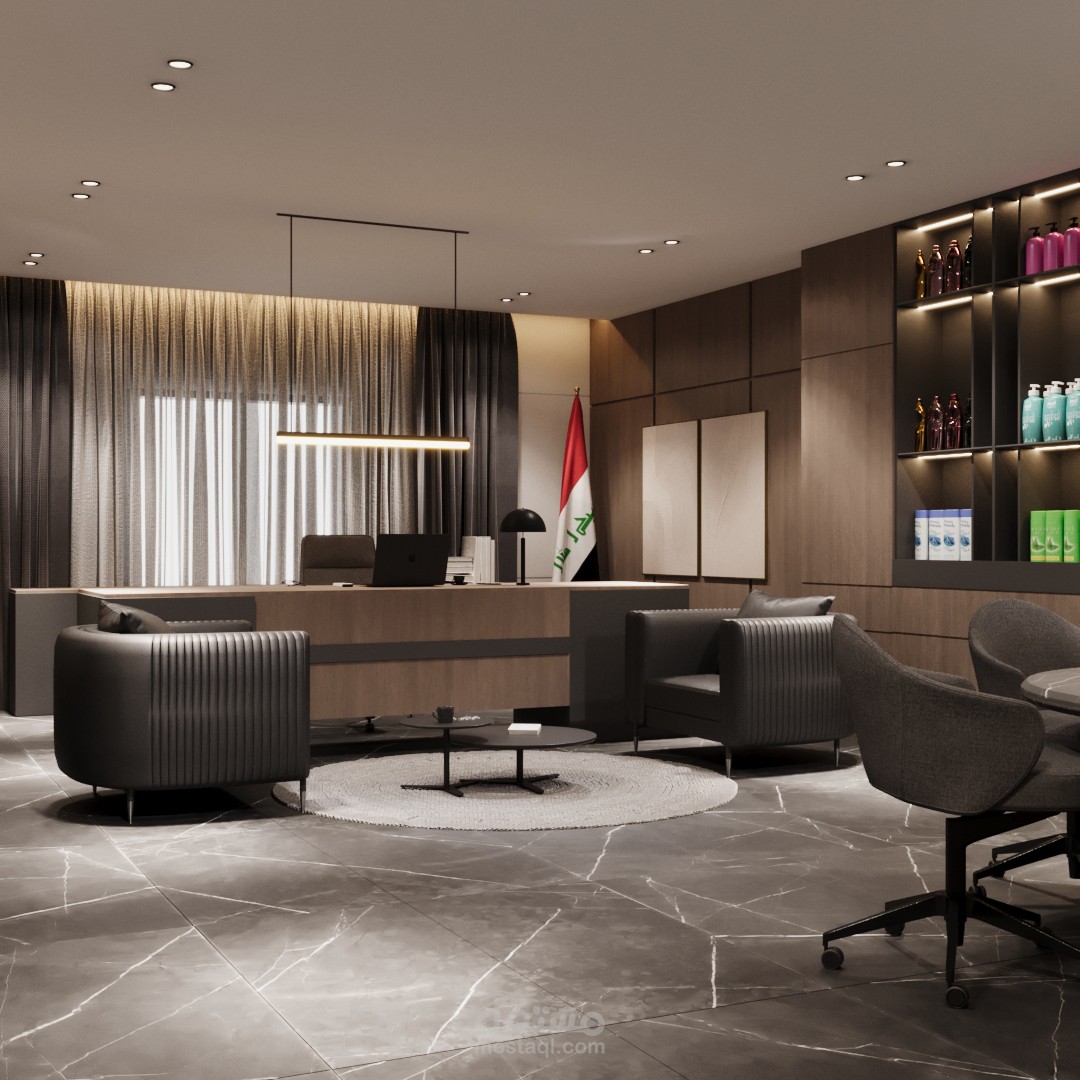 مكتب السيد حسين مصمم ليكون مساحة مريحة وعصرية، حيث يجمع بين الفخامة والوظيفة.