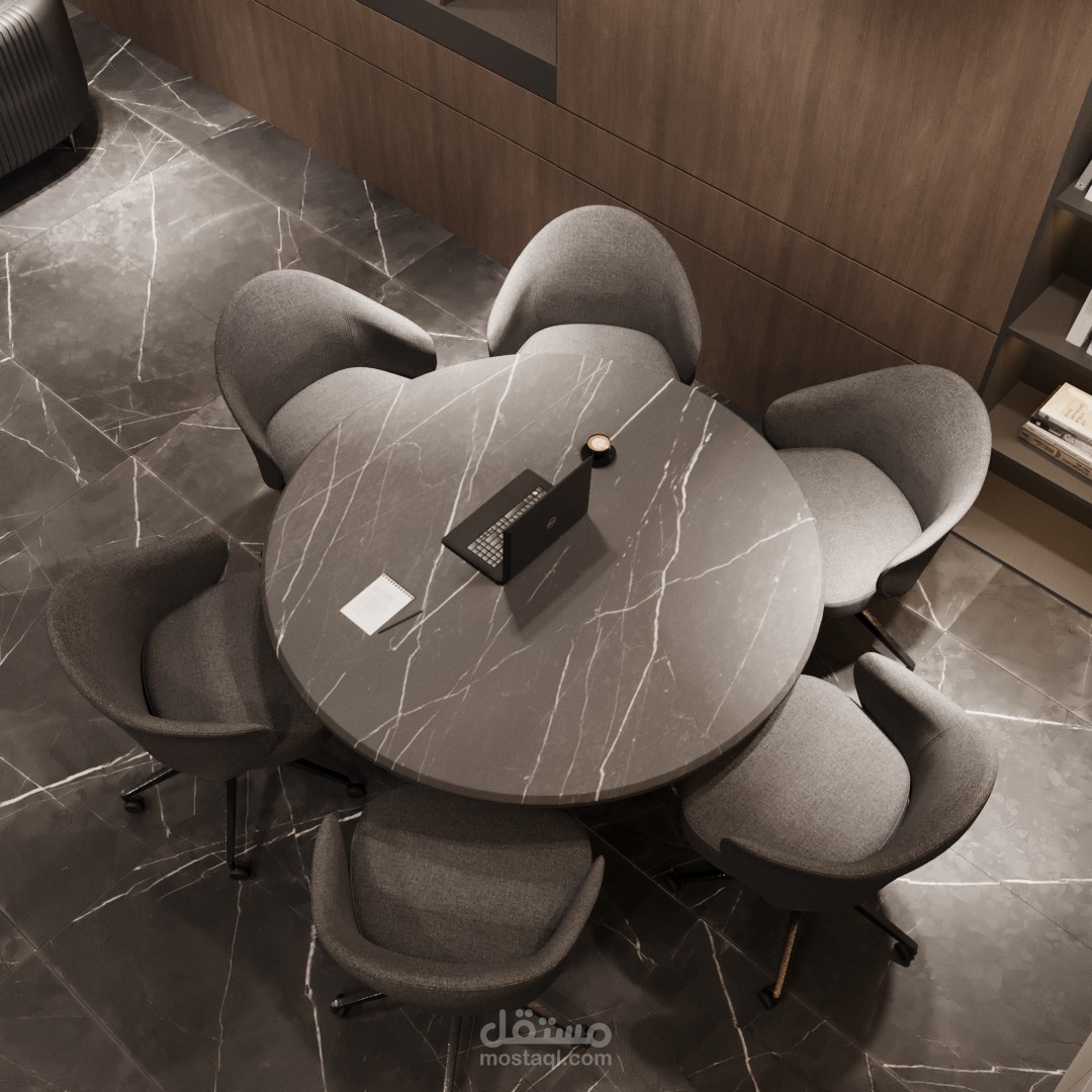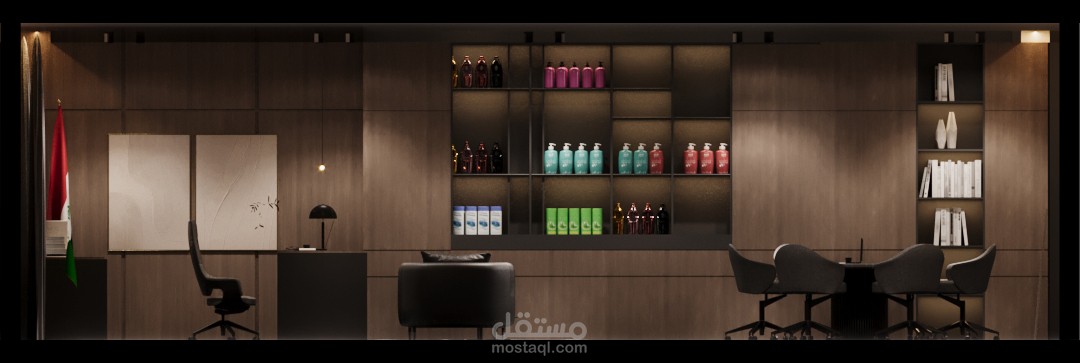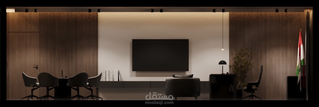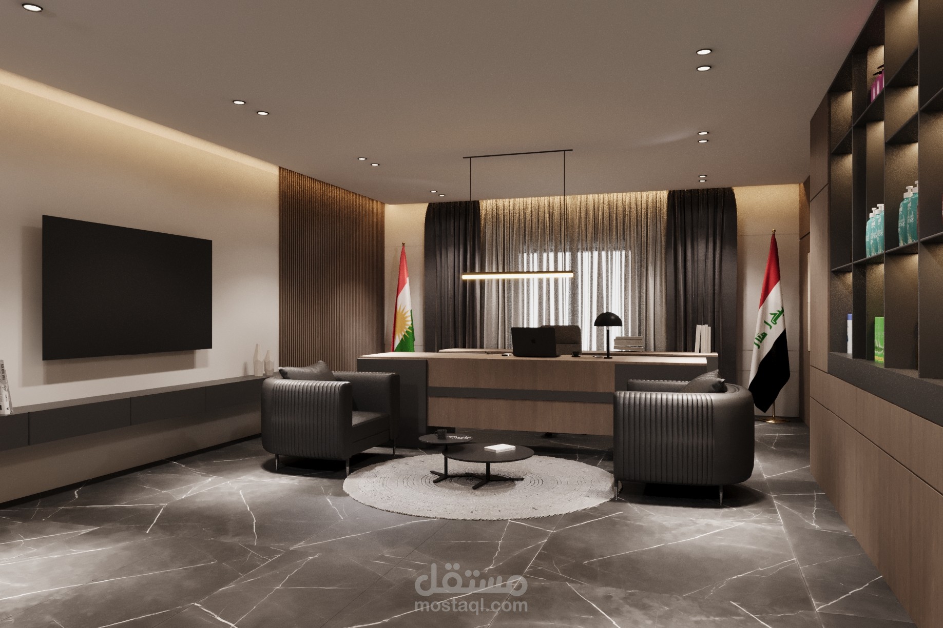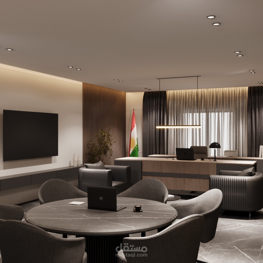 مكتب السيد حسين مصمم ليكون مساحة مريحة وعصرية، حيث يجمع بين الفخامة والوظيفة.
