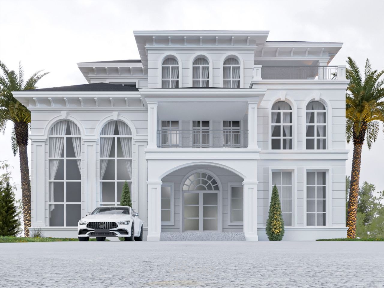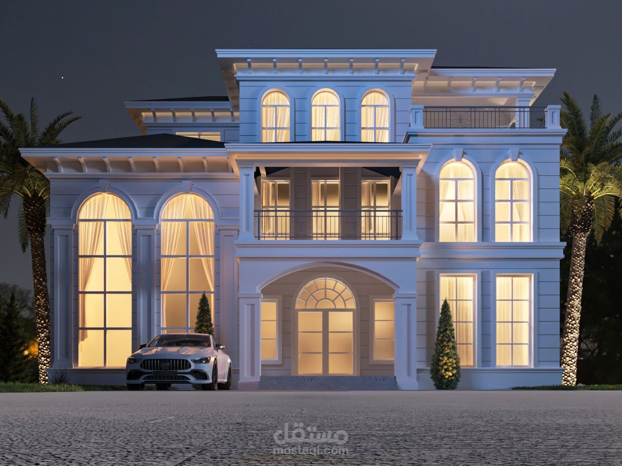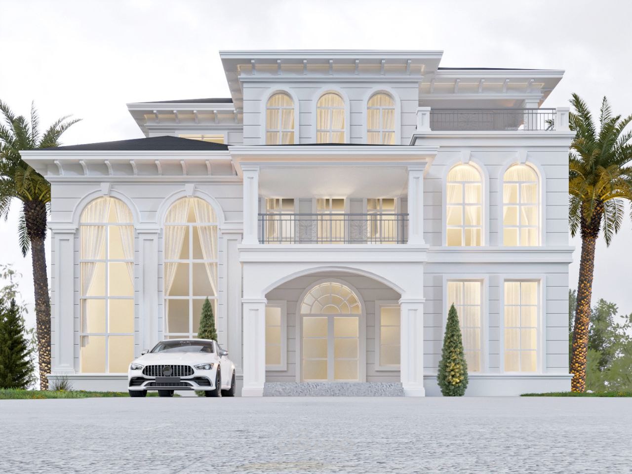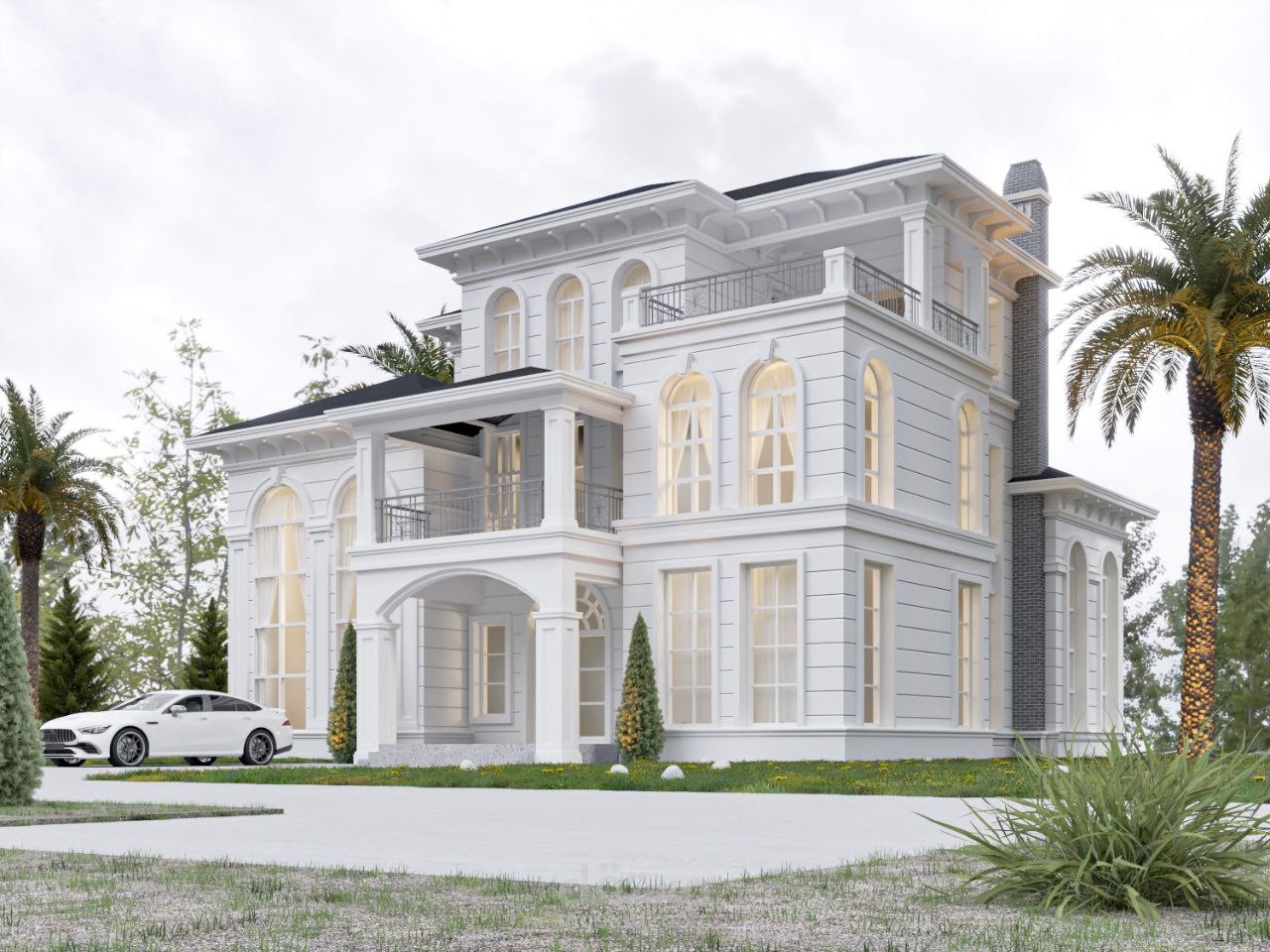 العمارة: تصميم مبنى ثلاثي الطوابق مع تفاصيل معمارية فاخرة، مثل النوافذ الكبيرة ذات الأقواس التي تضفي طابعًا كلاسيكيًا.