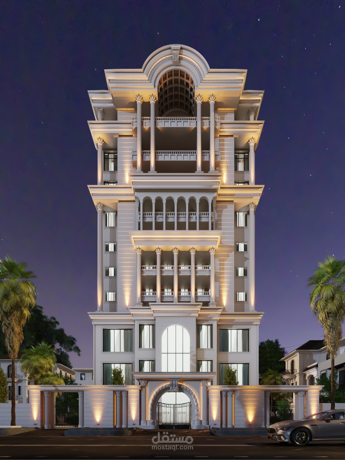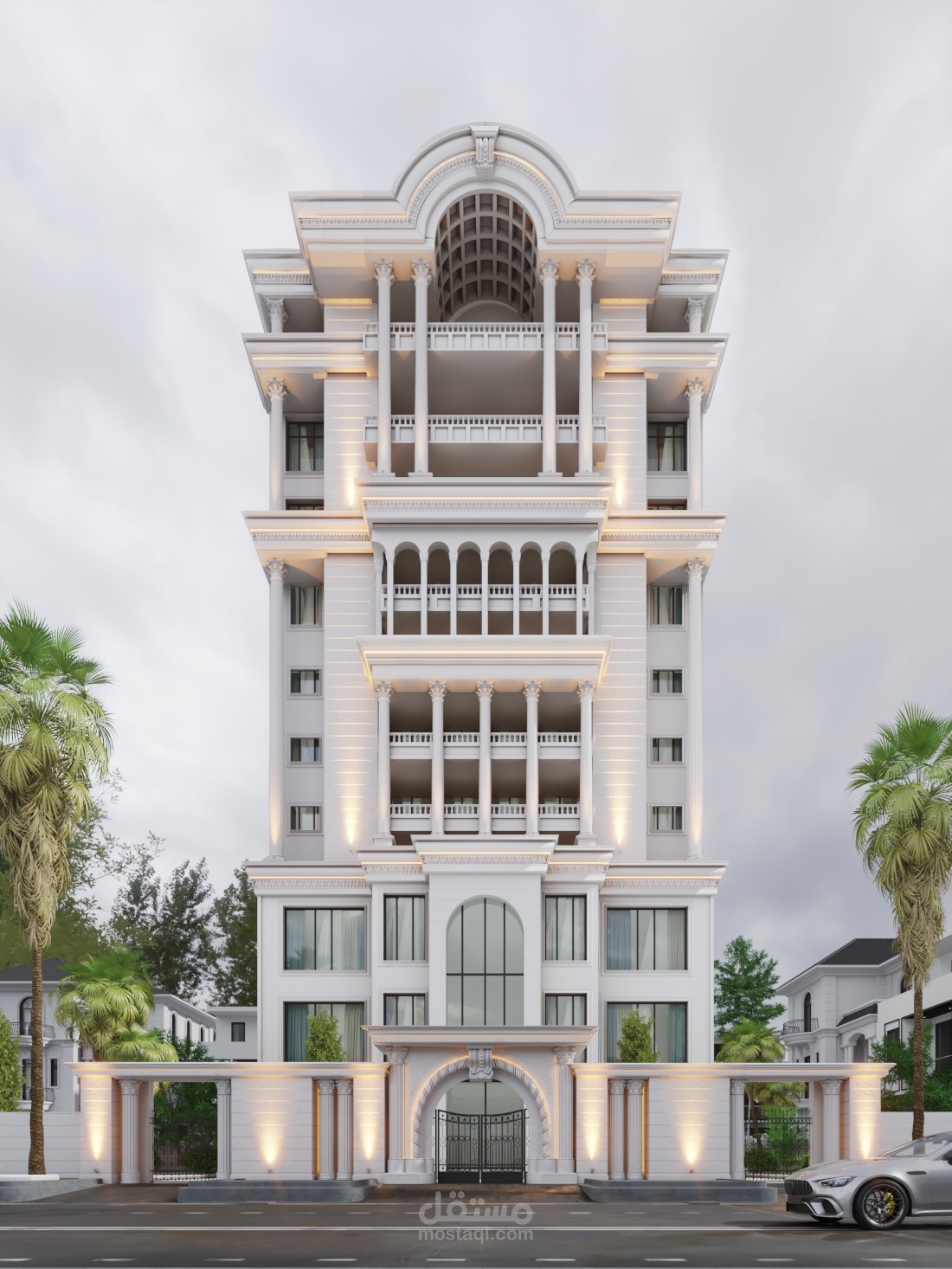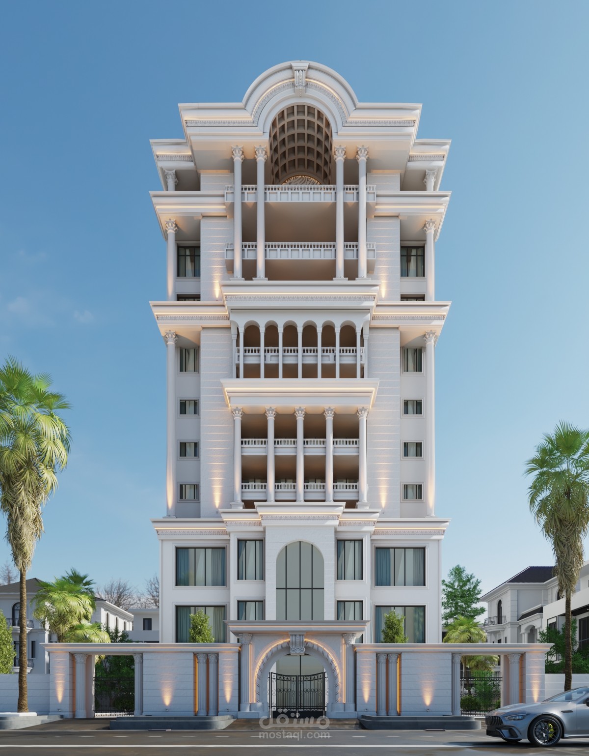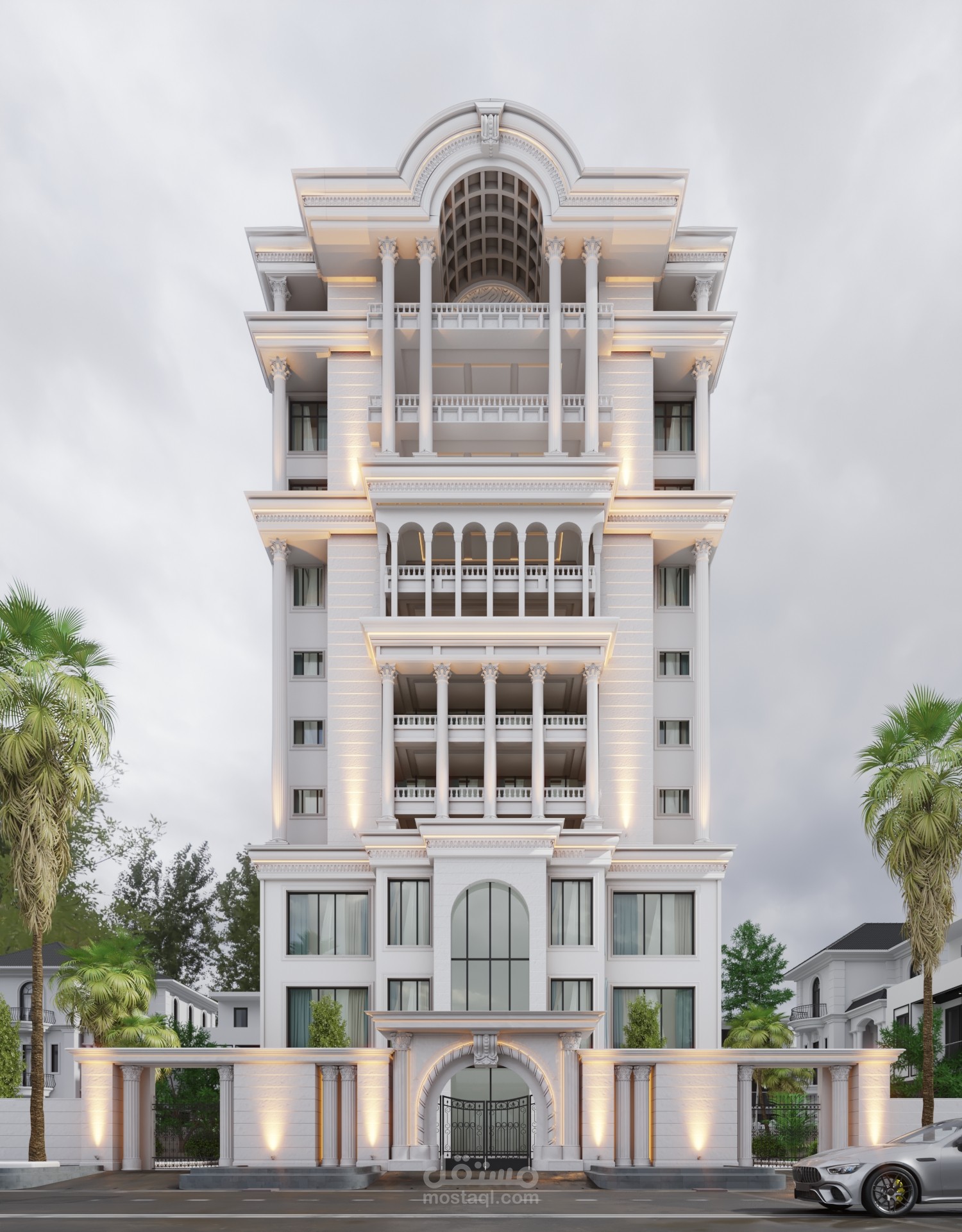 تتميز واجهة المبنى بتصميم معماري فاخر يجمع بين الأناقة والحداثة. إليك أبرز ملامح التصميم: