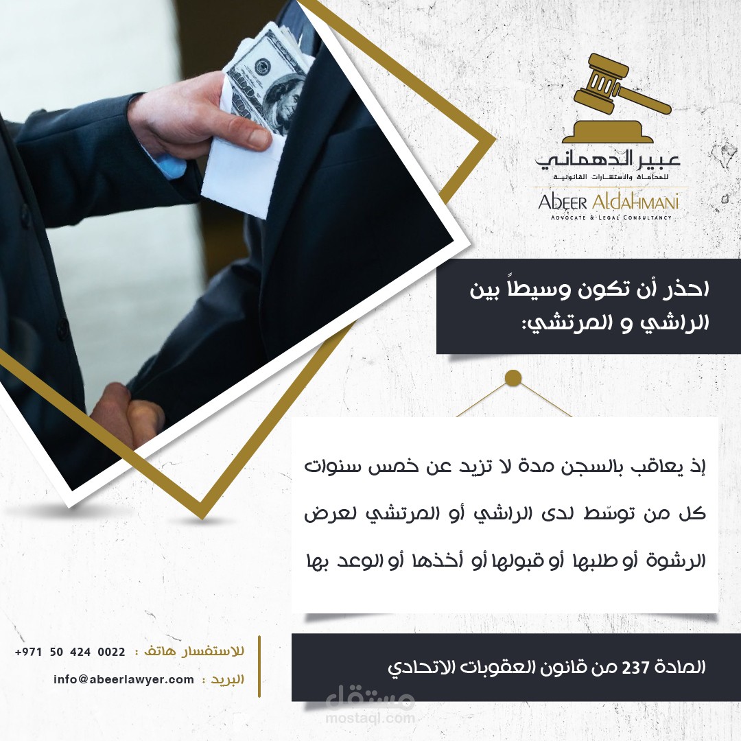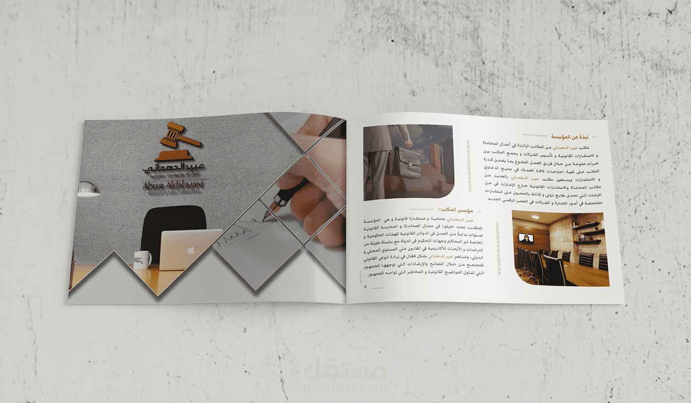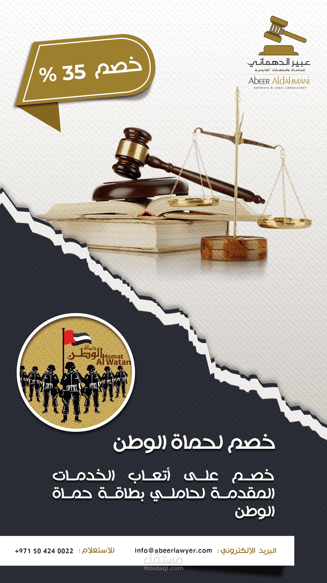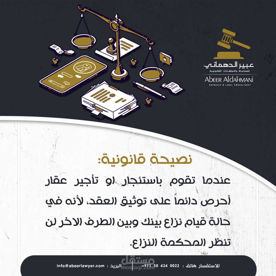 شركة عبير الدهماني للمحاماة والإستشارات القانونية، مقرها دولة الإمارات العربية ، تم الاتفاق مع مسوق الكتروني عن بعد من أجل تنفيذ تصميم بوستات السوشال ميديا ، بالإضافة إلى تصميم بروفايل طباعي وديجيتال بنسختين عربية وانكليزية