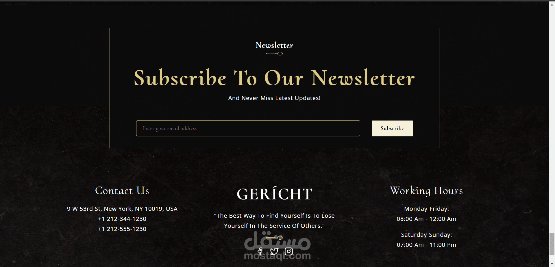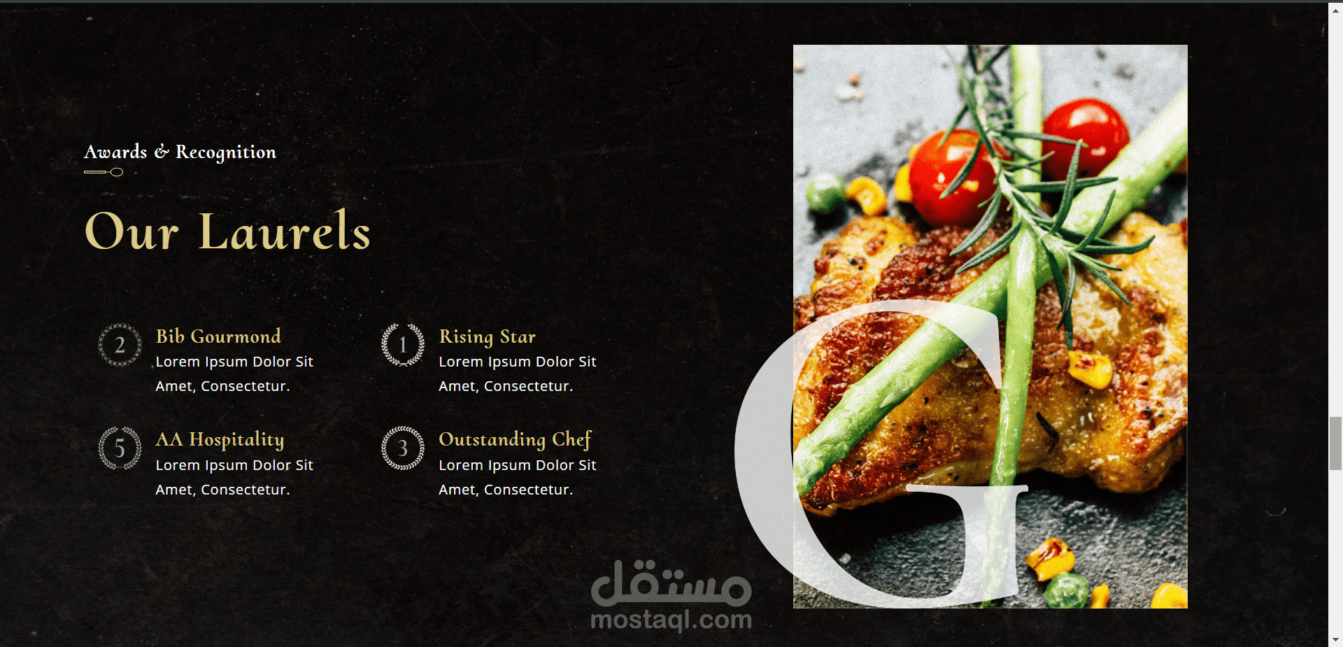 السلام عليكم ورحمه الله وبركاته , انشأت موقع الكتروني ل مطعم Gericht , يشمل الموقع الالكتروني landing page و About us and Our History و Menu و Chef's Word و Awards و معرض صور للأكلات الخاصة بالمطعم و Find us و Footer and Contact US