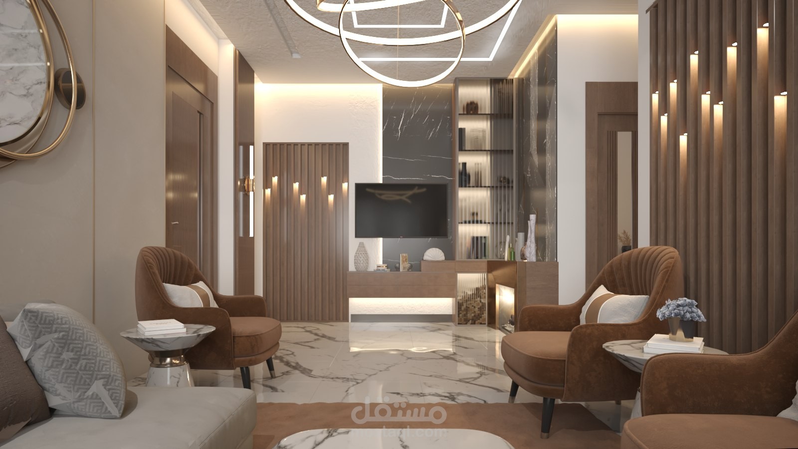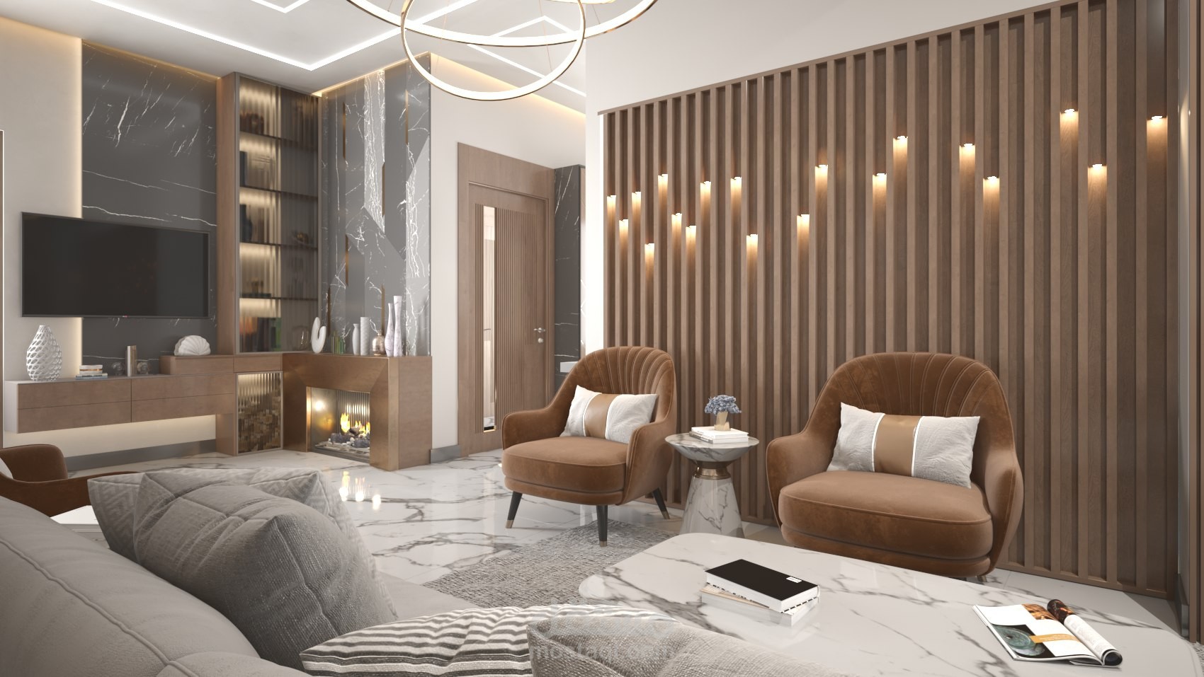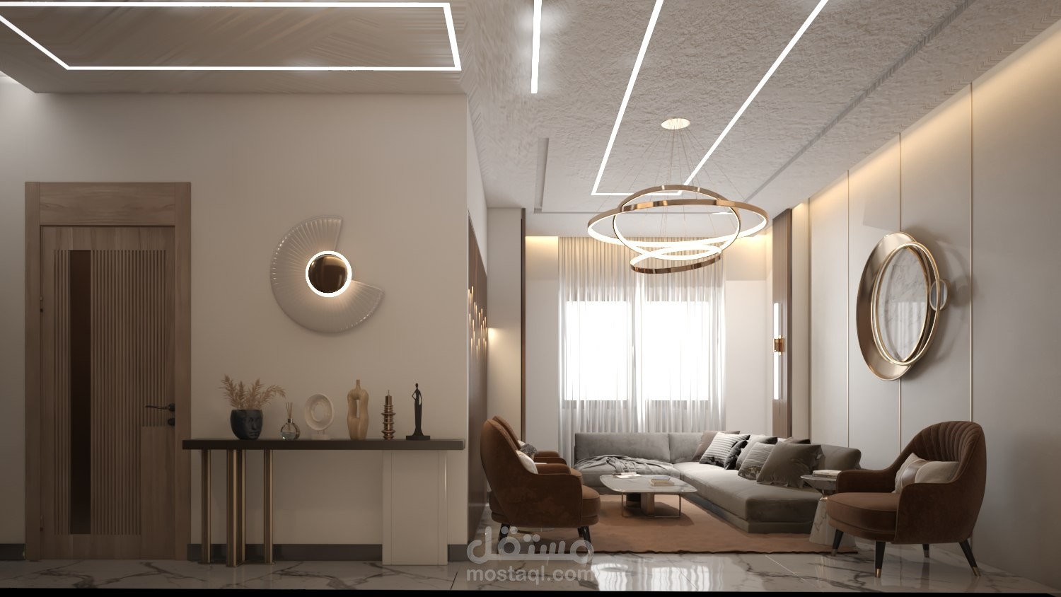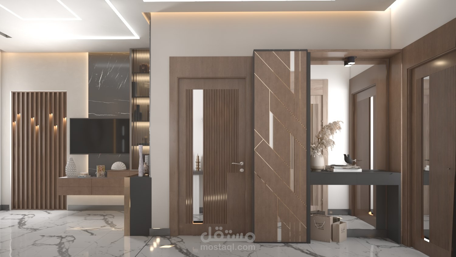 تصميم فراغ معيشة قابل لأن يُضم لغرفة الضيوف يفصلهما باب من الخشب مصمم بديكور مميز