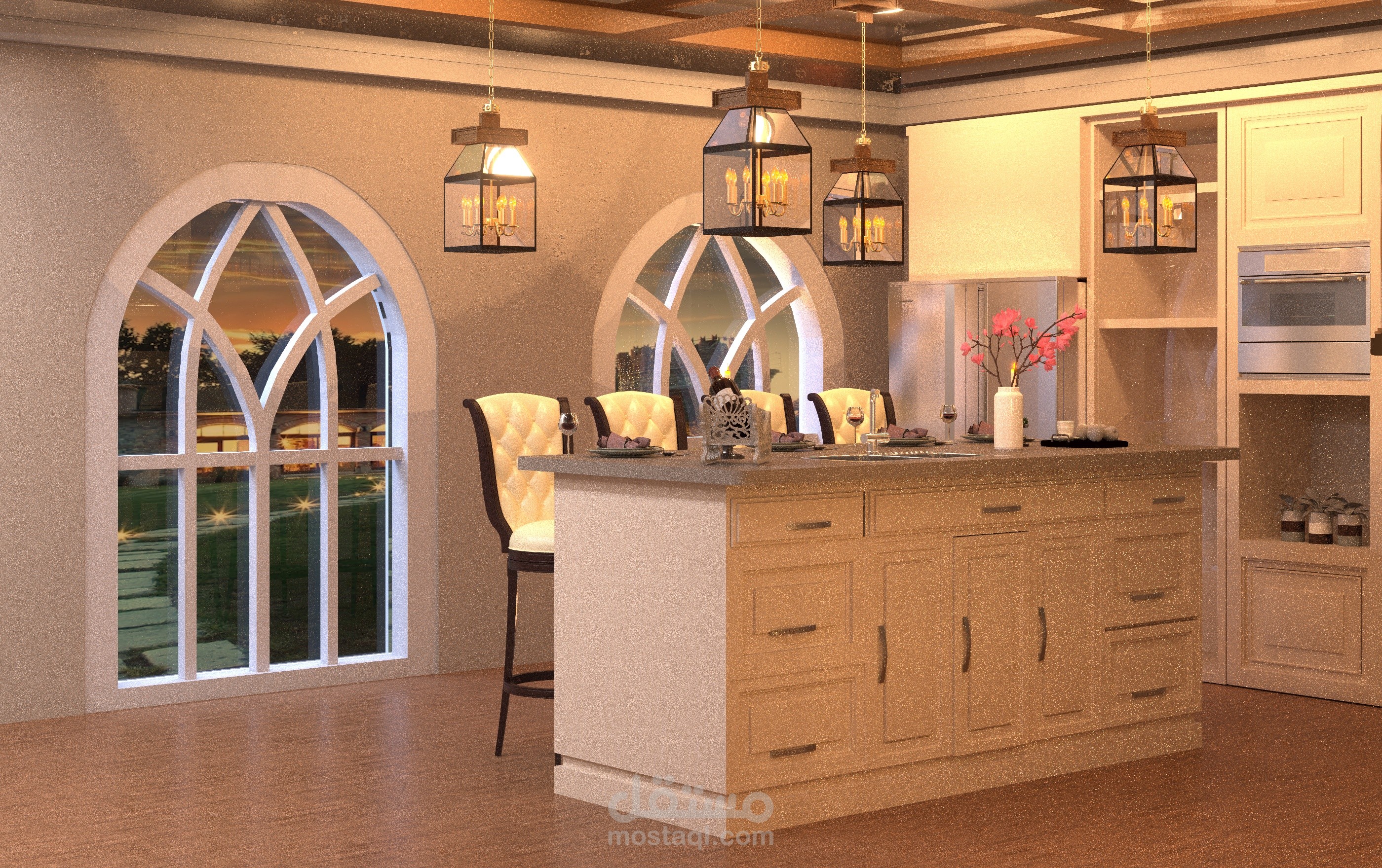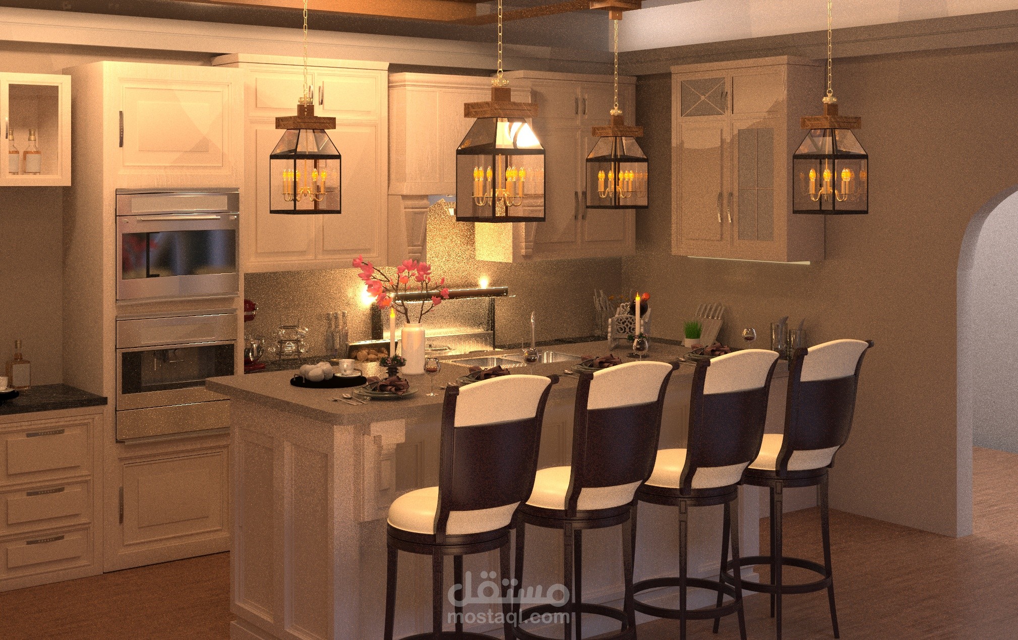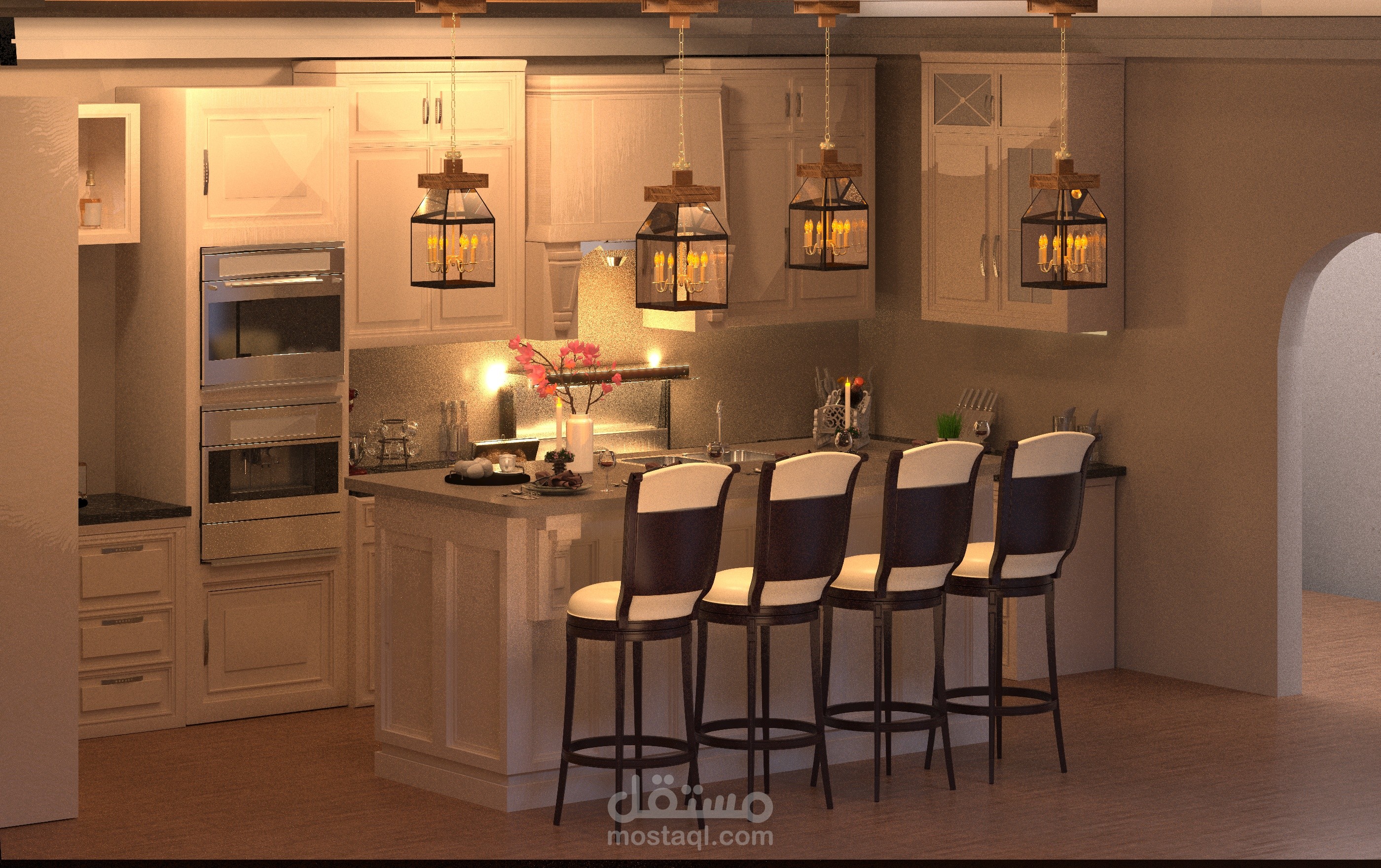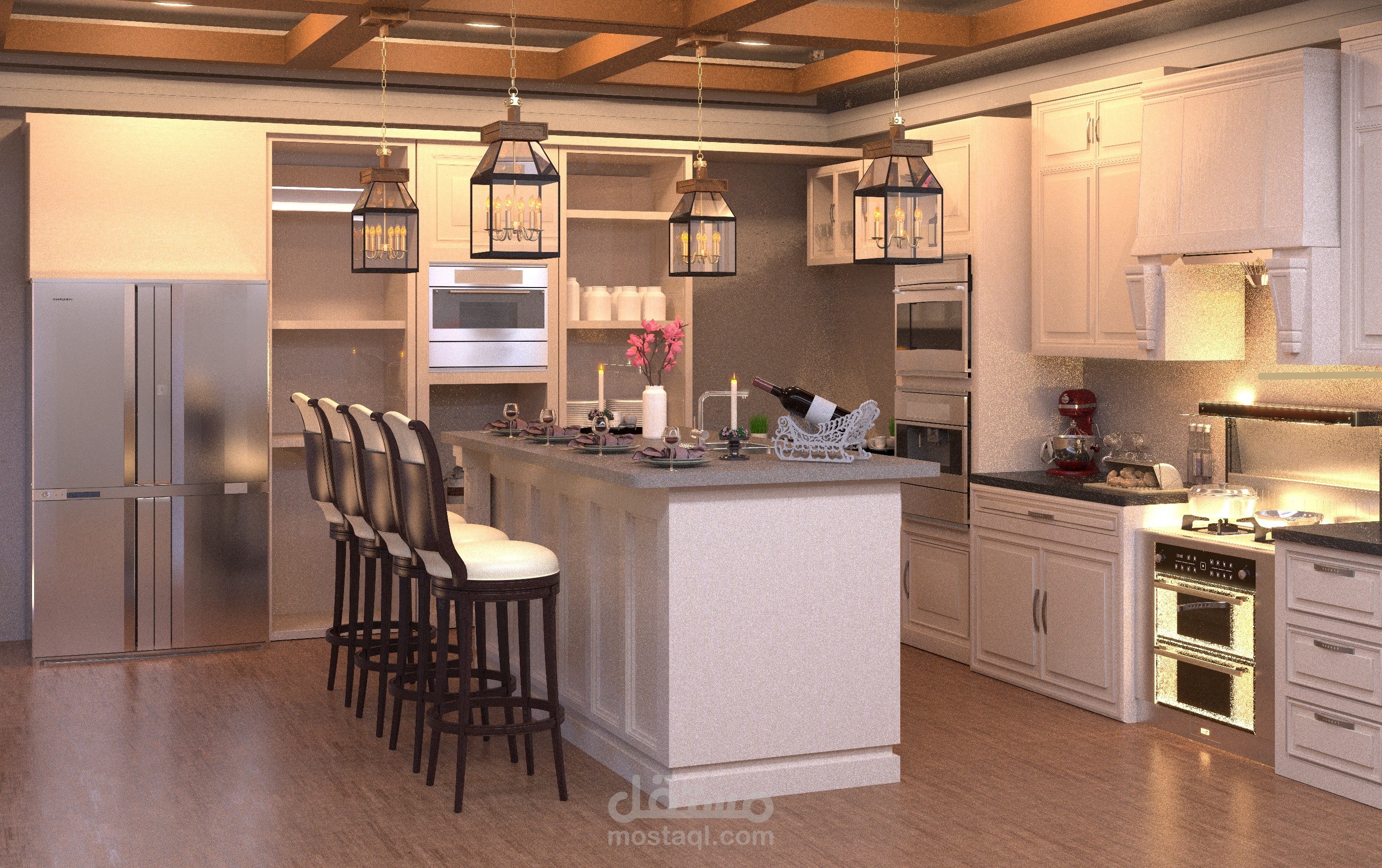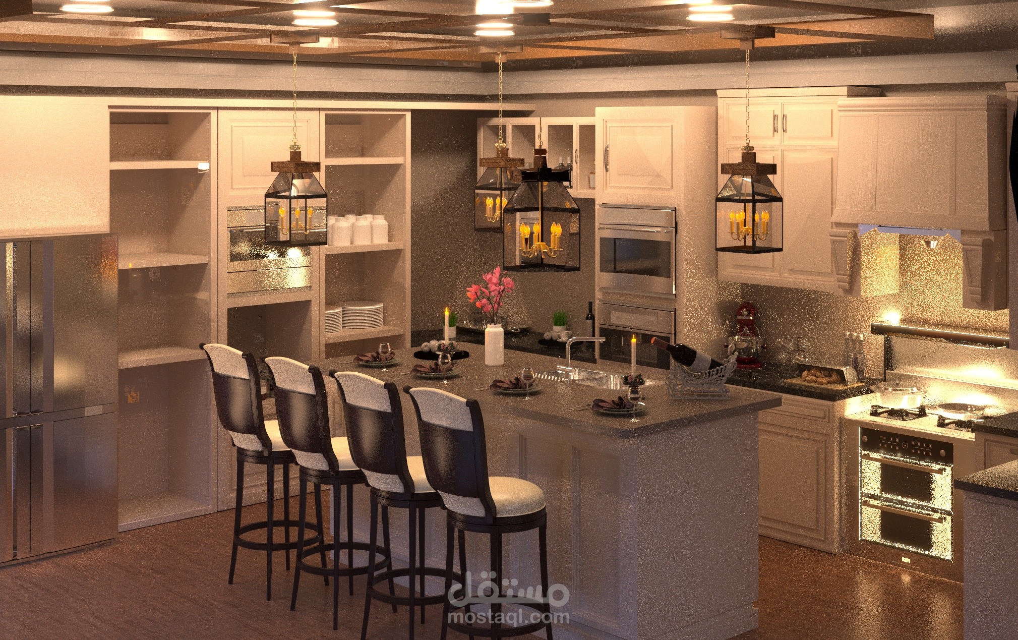 تمت نمذجة جميع العناصر في المطبخ باستخدام 3D Max، بما في ذلك الجزيرة المركزية، وحدات التخزين، الأفران المدمجة، والإضاءة المعلقة فوق الجزيرة.