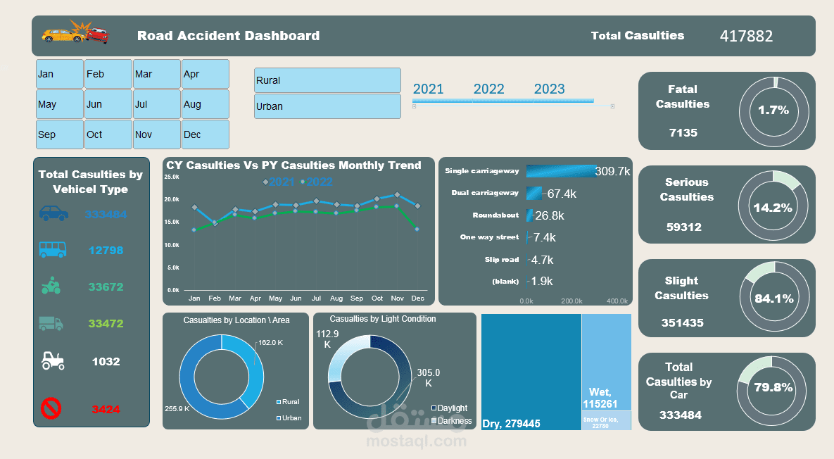 لوحة معلومات لحوادث الطرق باستخدام Python & Excel، تعرض تحليلًا تفصيليًا للوفيات والإصابات الخطيرة والخفيفة حسب نوع المركبة والموقع وحالة الطريق والضوء. تُظهر اللوحة الاتجاهات الشهرية وتوزيع الحوادث بين المناطق الحضرية والريفية، مما يساعد في فهم الأنماط واتخاذ التدابير الوقائية المناسبة.