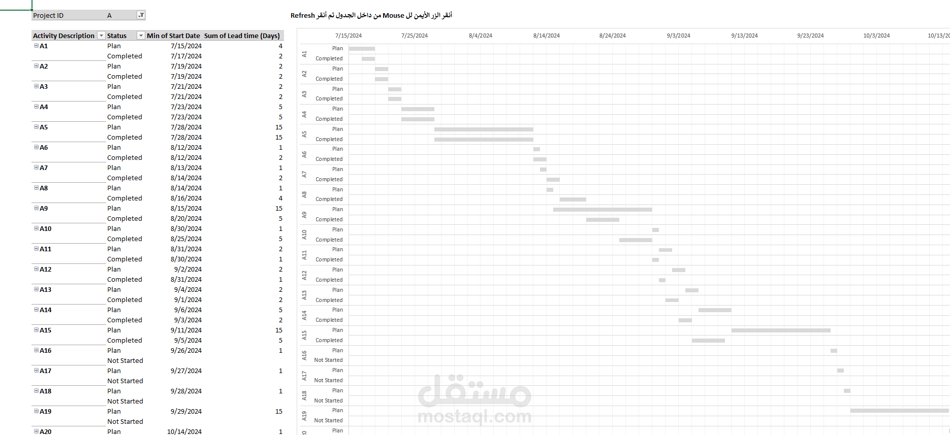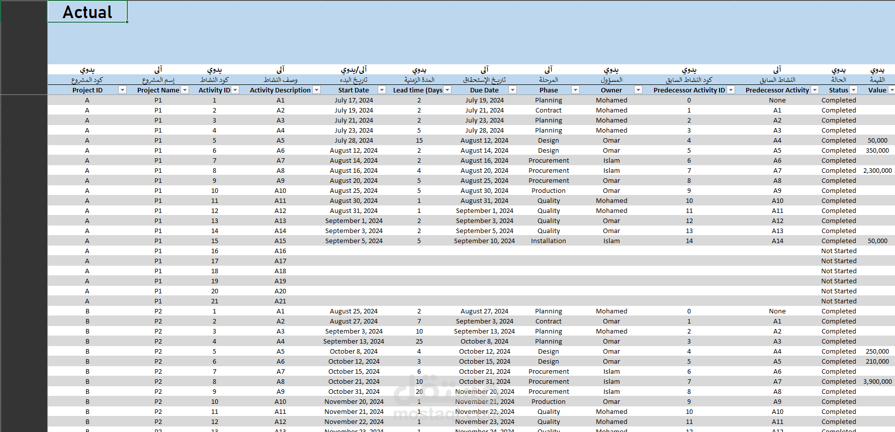 نظام خاص بإدارة المشاريع (Project schedule) و قمت بعمل ملخص بسيط لمتابعة الرؤية الكلية للمشروع بشكل مميكن بصفحة (Projects)، كما يمكنكم إستخلاص كل المعلومات و تلخيصها بشكل عام لأي بند من البنود المتواجدة بصفحة ال Activities عن طريق (Pivot table)