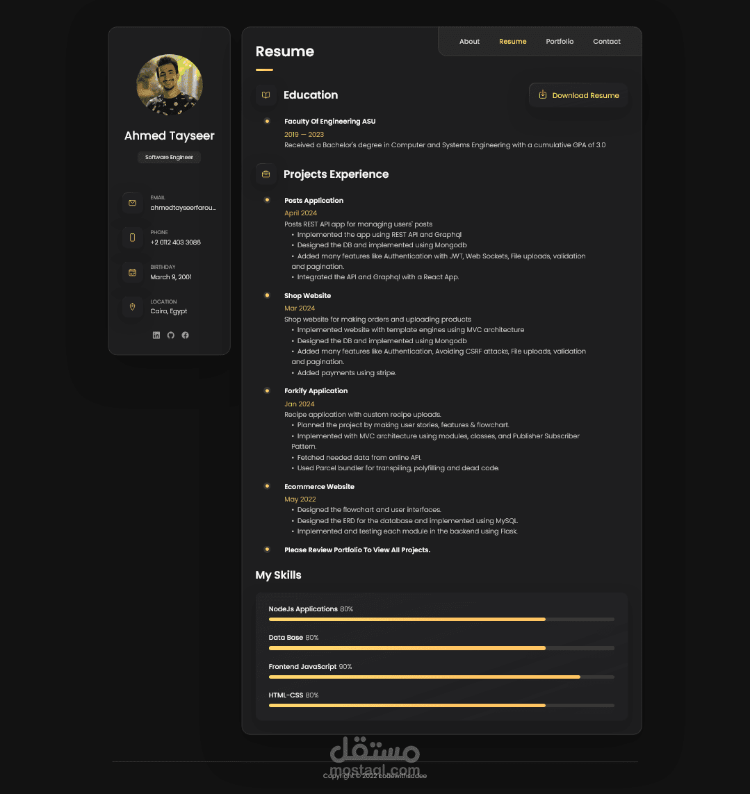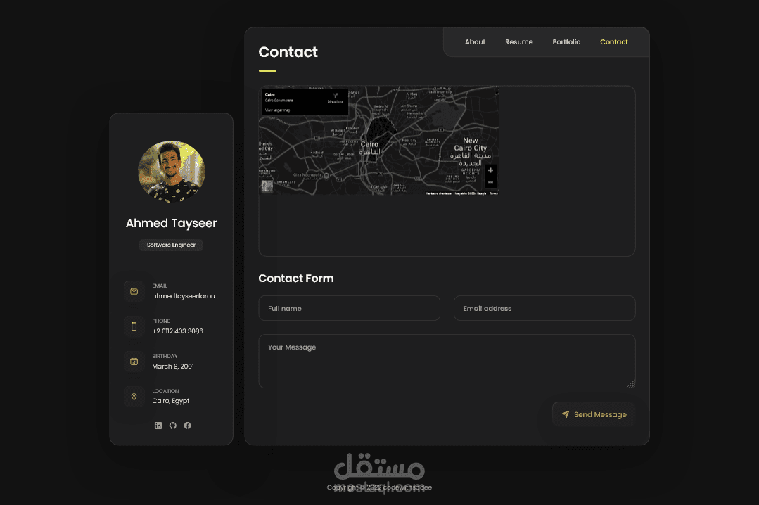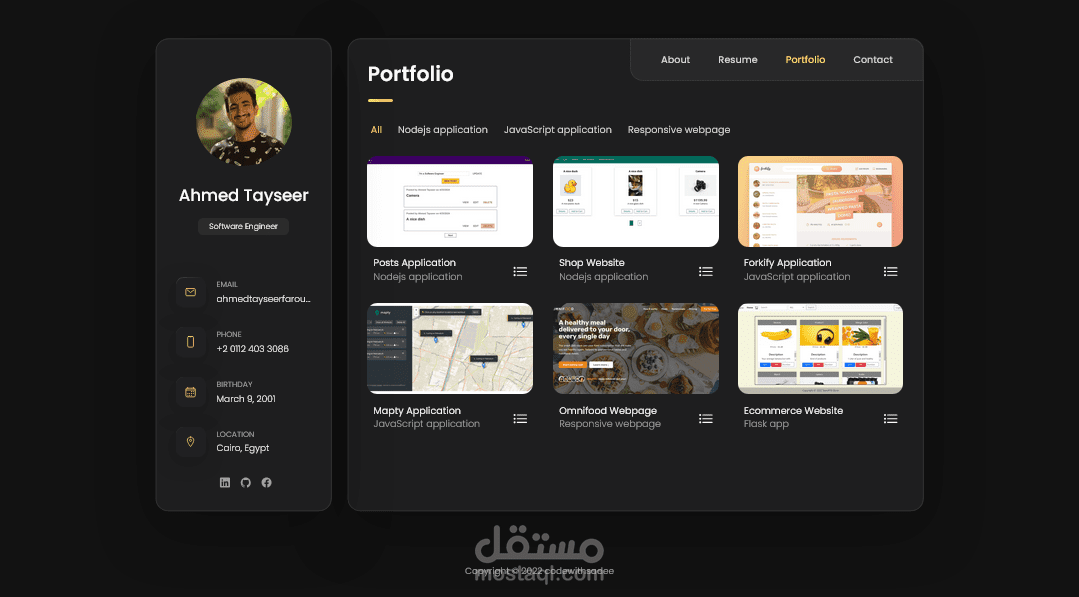 صفحة ويب لعرض اعمالي وتفاصيل عني تحتوي على