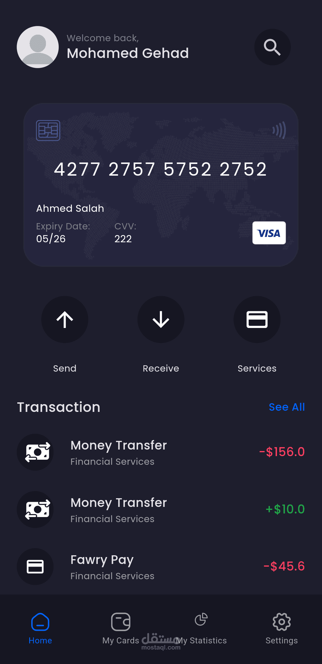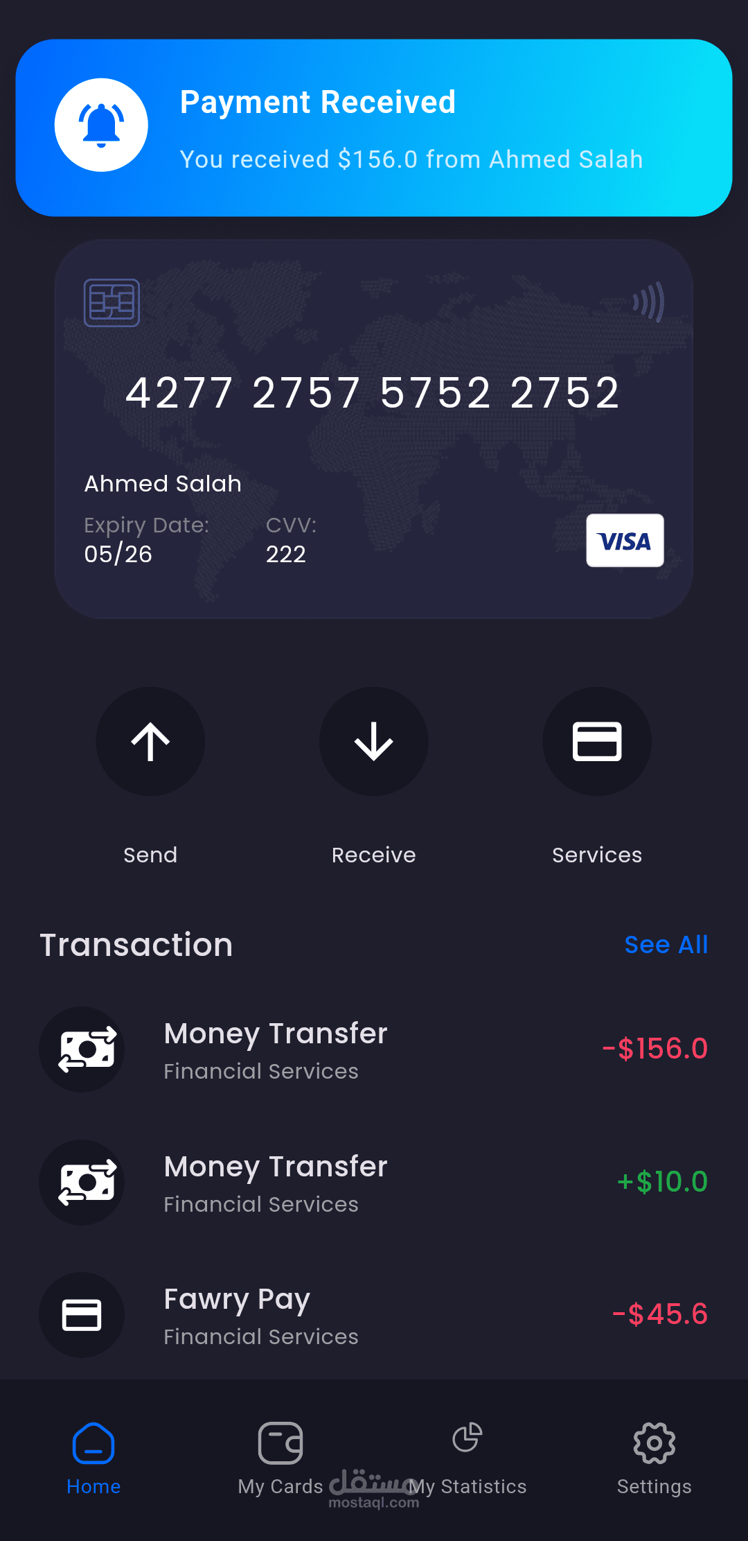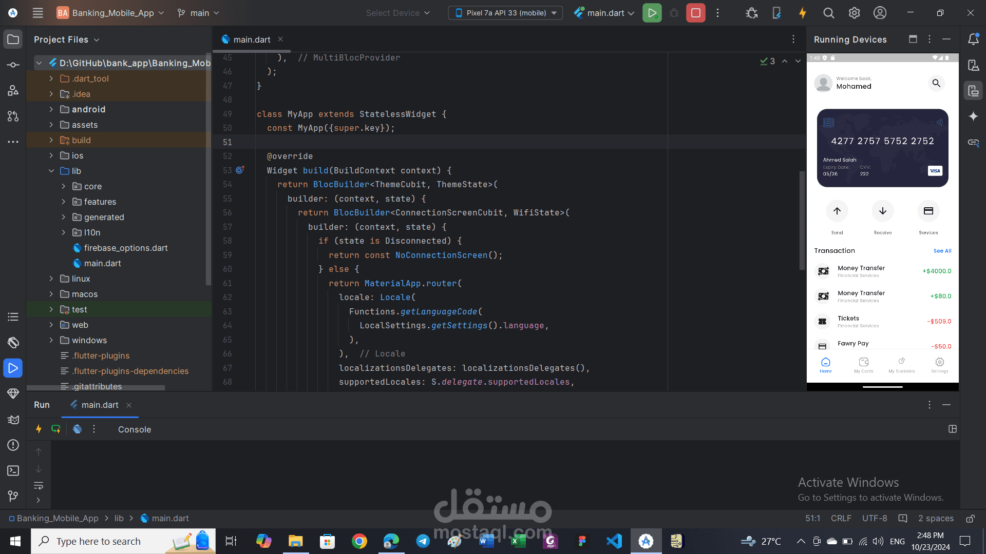 تطبيق بنك يوفر للمستخدمين إمكانية إدارة حساباتهم المصرفية، إجراء تحويلات مالية، عرض تاريخ المعاملات، وتتبع أرصدة الحسابات. يتميز التطبيق بواجهة مستخدم سهلة الاستخدام وتصميم آمن يحمي بيانات المستخدمين.