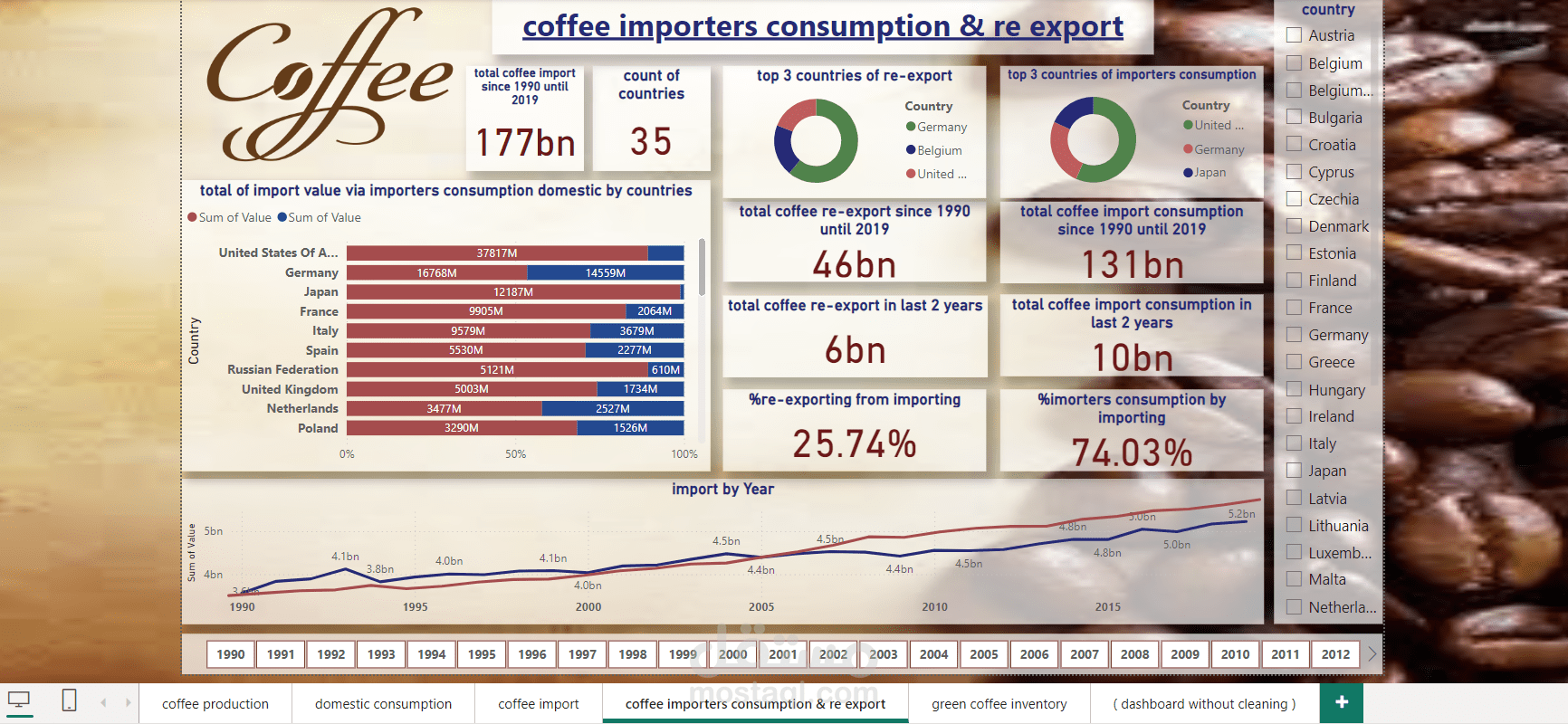 وهو مشروع خاص بالقهوة وانتاجها حيث قمت بتنظيف وتحويل مجموعة بيانات ، ثم قمت بتصور النتائج باستخدام Power BI. أتاح لي هذا المشروع تطبيق تقنيات متقدمة لتنظيف البيانات وإنشاء لوحة معلومات ديناميكية تكشف عن رؤى هامة حول إنتاج القهوة واستهلاكها.