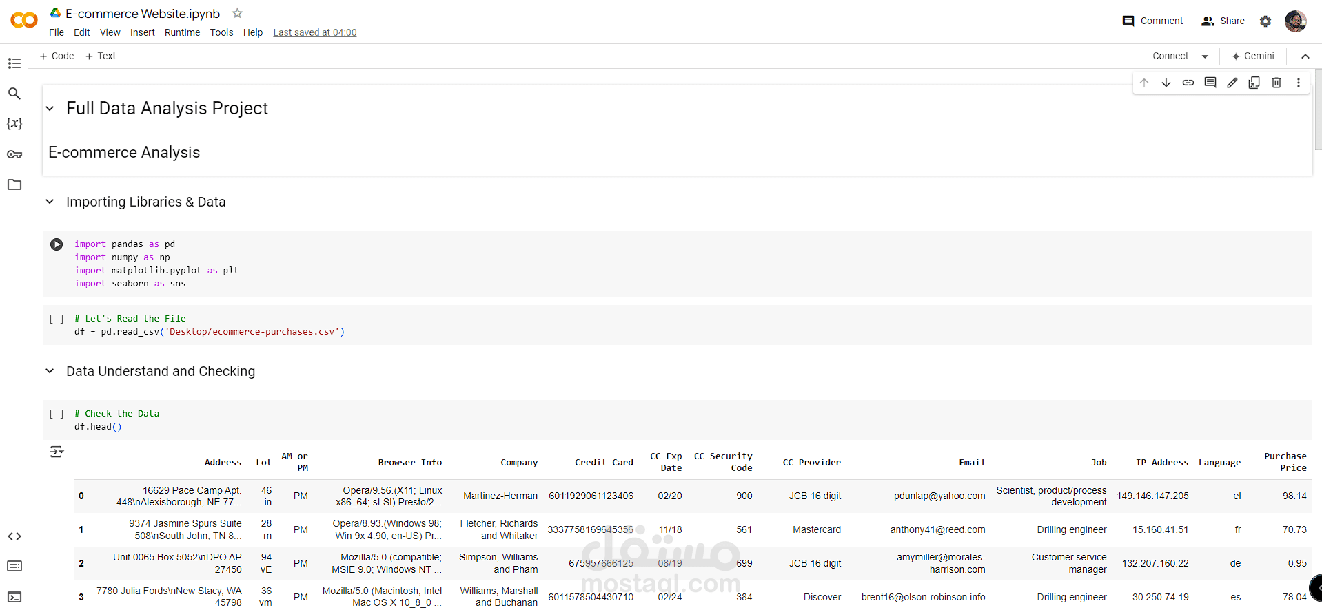 قد يبدأ دفتر الملاحظات باستيراد مكتبات أساسية مثل pandas وnumpy وmatplotlib لمعالجة البيانات وتصورها.